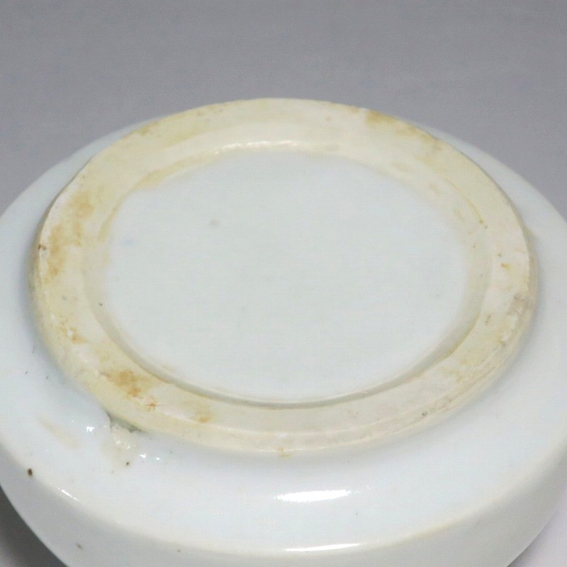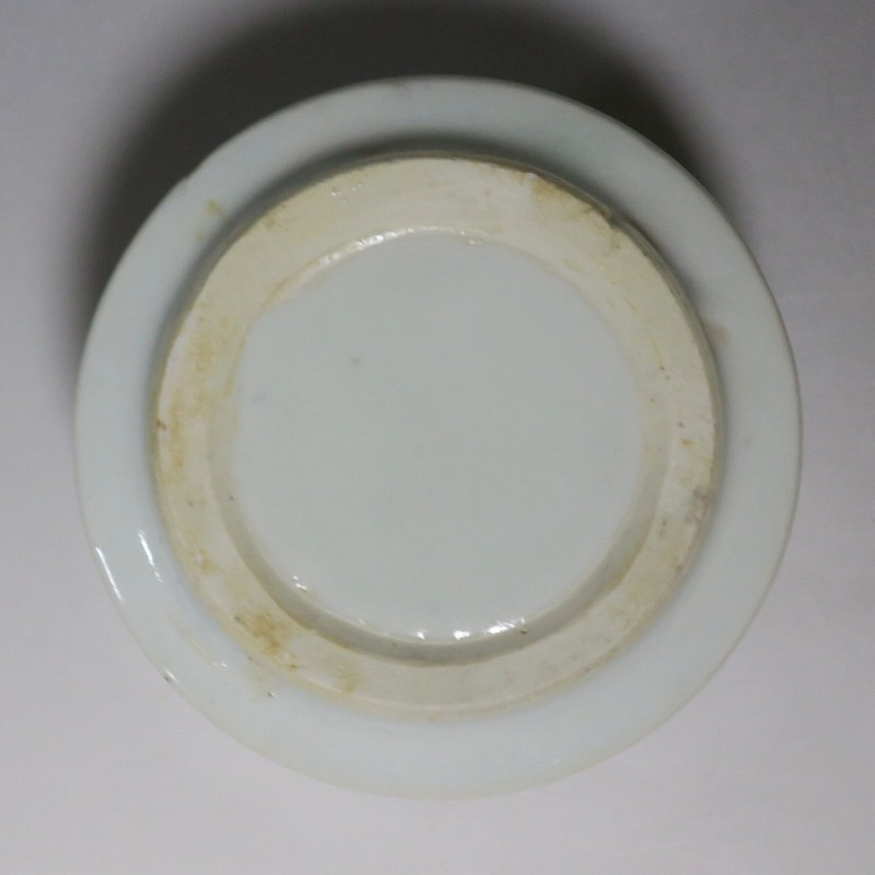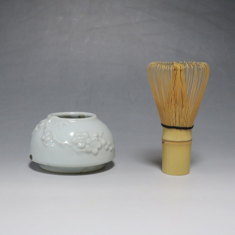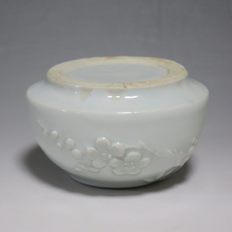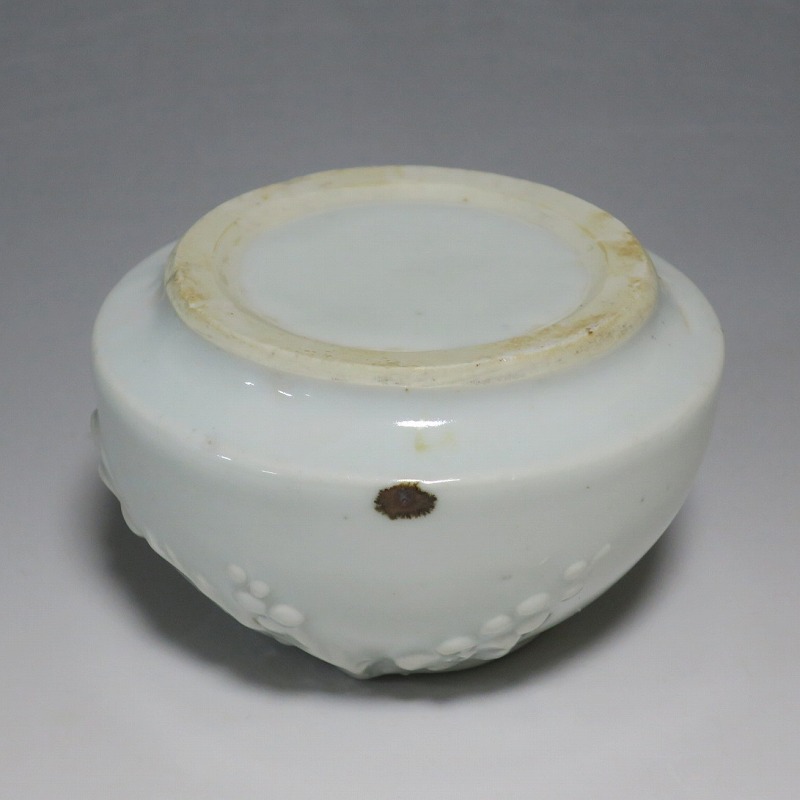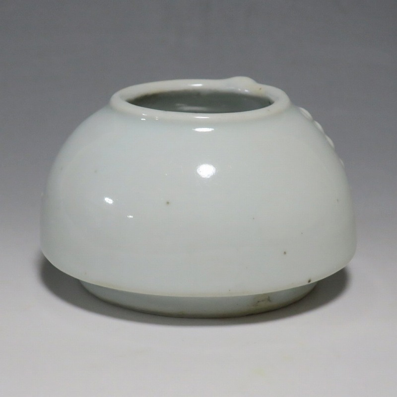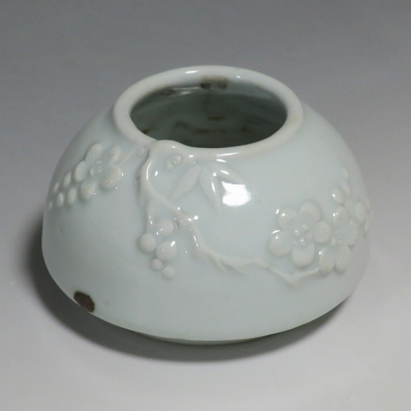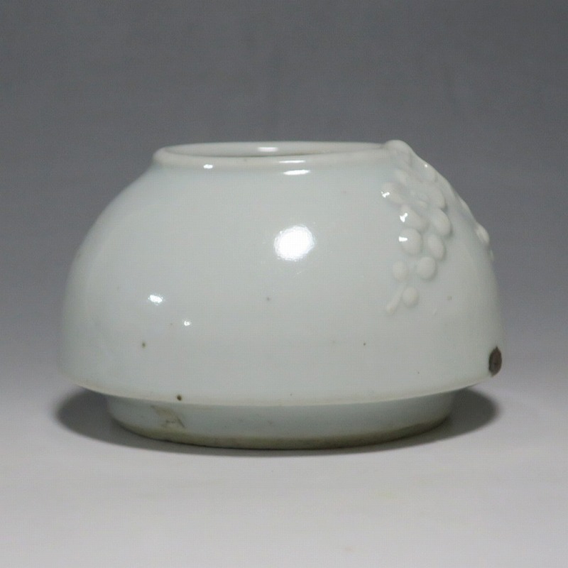 高さ 約5.5cm/胴径 約8.8cm 窯傷はありますが、完品です。状態は写真でご確認ください。 水盂は、書道具のひとつで水を入れる容器です。硯に水を移す際に使い、口が広く、匙で掬って水を汲みます。本品は清朝後期に作られた白磁の陽刻梅笹文水盂。梅文なので正月や春などハレの日に使用された書道具でしょう。小ぶりでかわいい模様が入っています。飾ると華やかさが出ます。他の書道具と一緒に飾るとインテリアとして楽しむことができるでしょう。座辺に置いてお楽しみください。 | ||