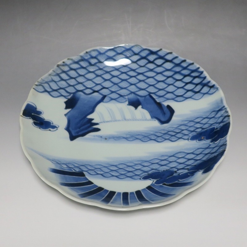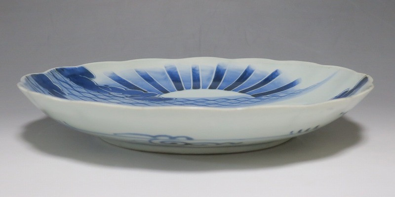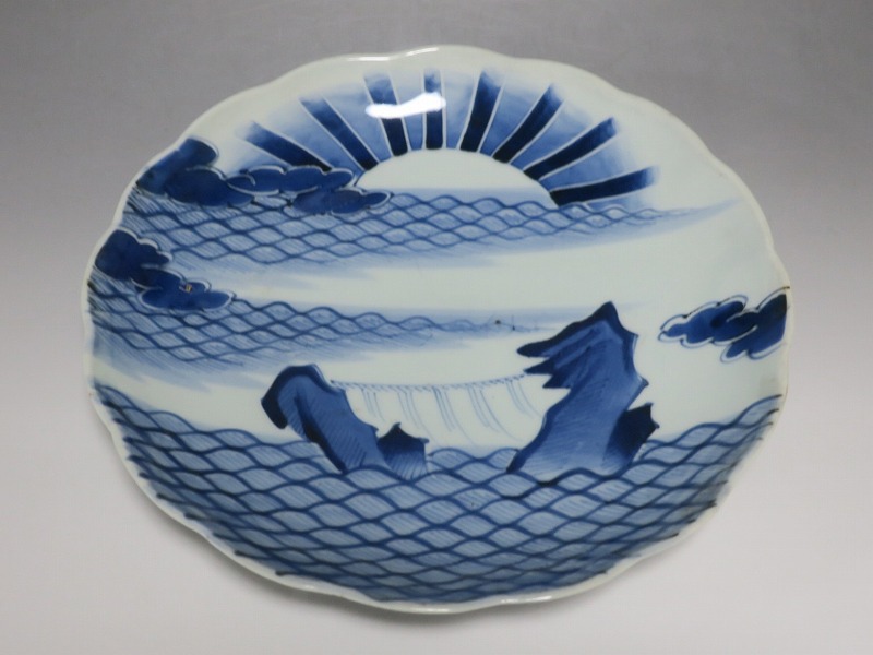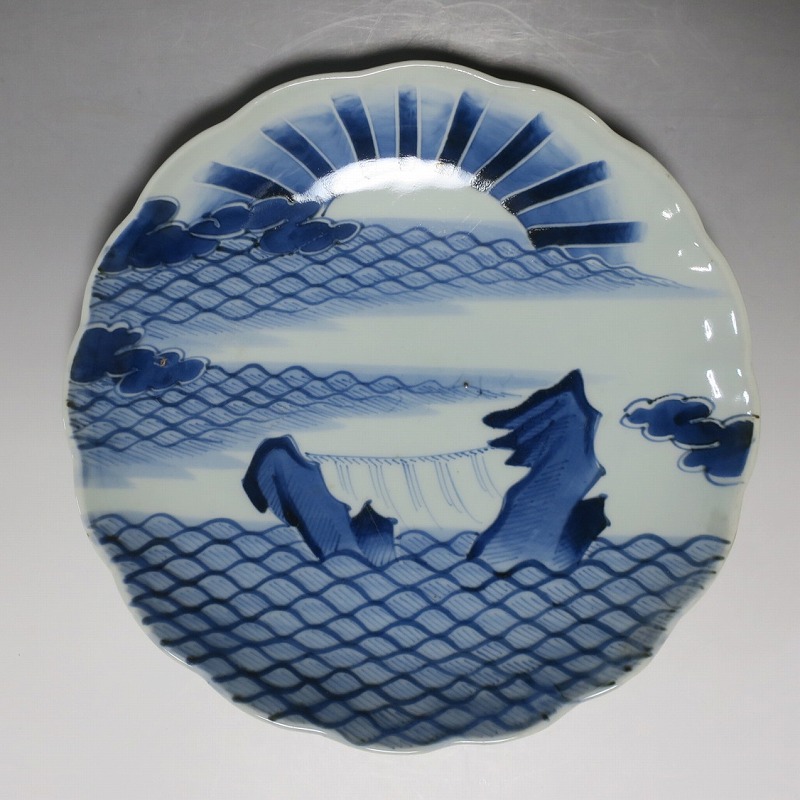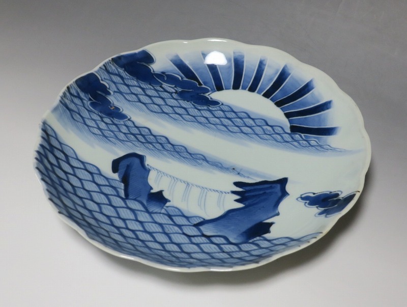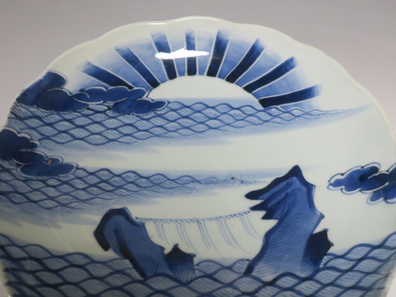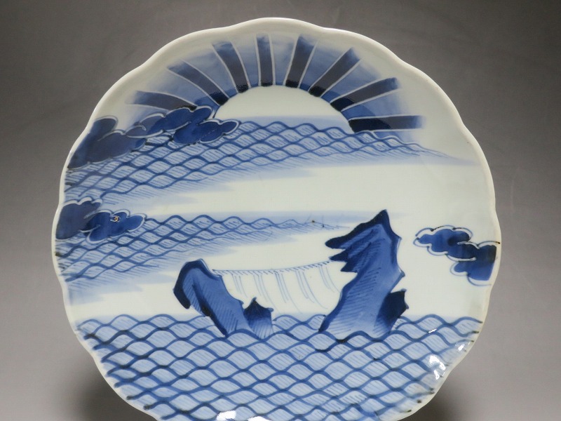 (江戸時代後期 19世紀中頃) 商品番号 4130 口径 約28cm/高さ 約4.5cm/高台径 約16cm 窯傷はありますが、完品です。状態は写真でご確認ください。 志田窯は江戸時代後期、有田の南東(現佐賀県藤津郡塩田町)に開かれた窯です。志田窯で磁器の生産が始まると、それまで高価だった磁器は庶民や農民層でも入手できるようになりました。日本の四季や風景、吉祥など生活に関連した素朴な絵付けが志田窯作品の魅力となっています。本品は染付で二見が浦を描いた尺皿。二つの岩の間から朝日が昇る作品です。個性的な筆使いで波が描かれています。お正月にぴったりの作品。インテリアや食器としてお楽しみください。 | ||