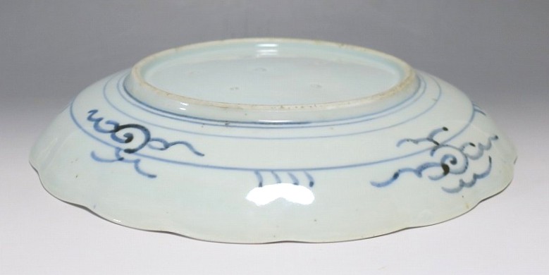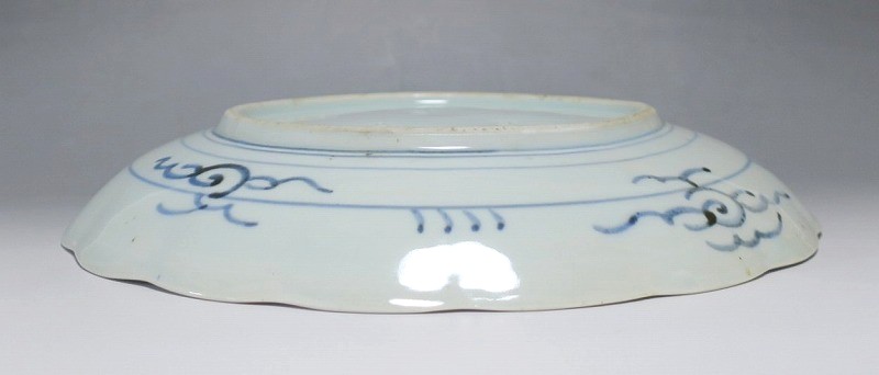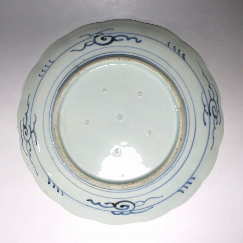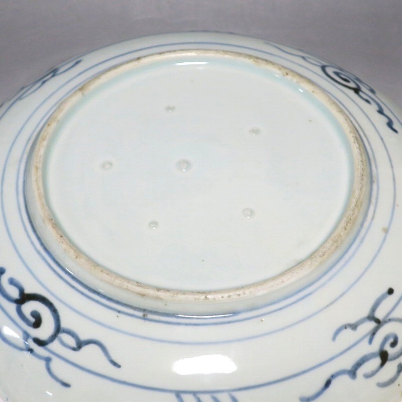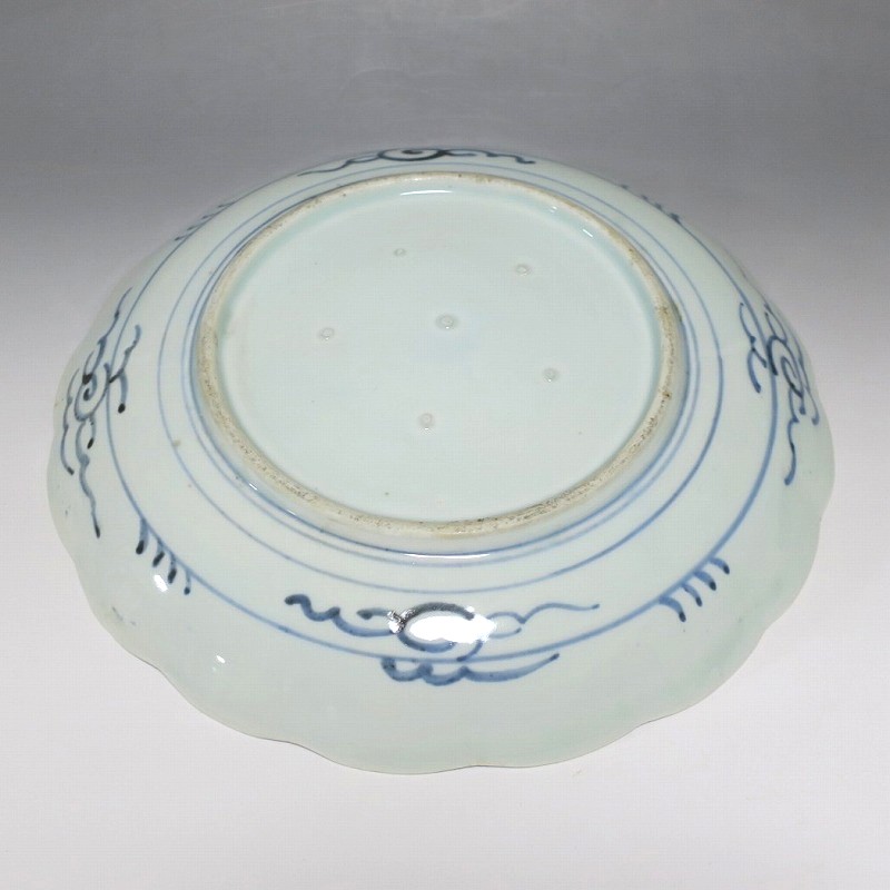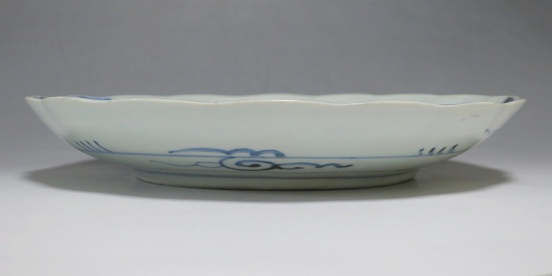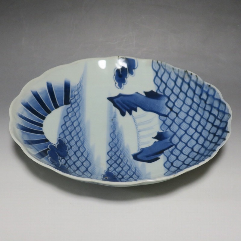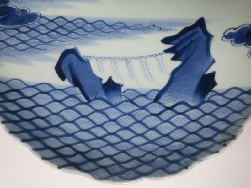 (江戸時代後期 19世紀中頃) 商品番号 4130 口径 約28cm/高さ 約4.5cm/高台径 約16cm 窯傷はありますが、完品です。状態は写真でご確認ください。 志田窯は江戸時代後期、有田の南東(現佐賀県藤津郡塩田町)に開かれた窯です。志田窯で磁器の生産が始まると、それまで高価だった磁器は庶民や農民層でも入手できるようになりました。日本の四季や風景、吉祥など生活に関連した素朴な絵付けが志田窯作品の魅力となっています。本品は染付で二見が浦を描いた尺皿。二つの岩の間から朝日が昇る作品です。個性的な筆使いで波が描かれています。お正月にぴったりの作品。インテリアや食器としてお楽しみください。 | ||