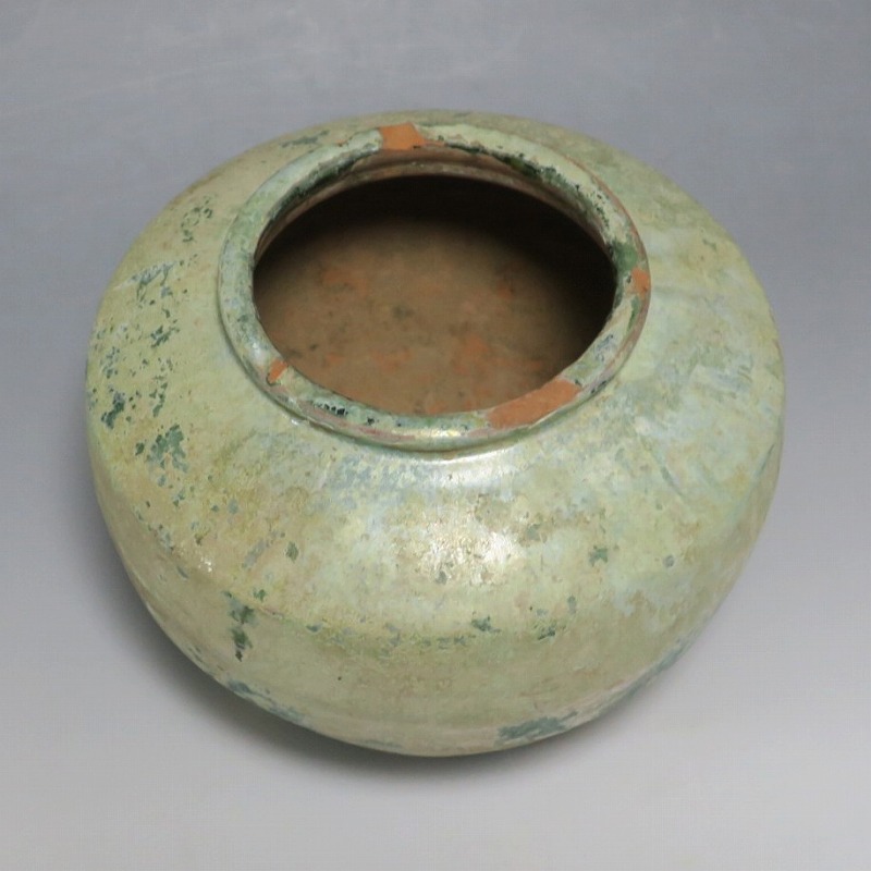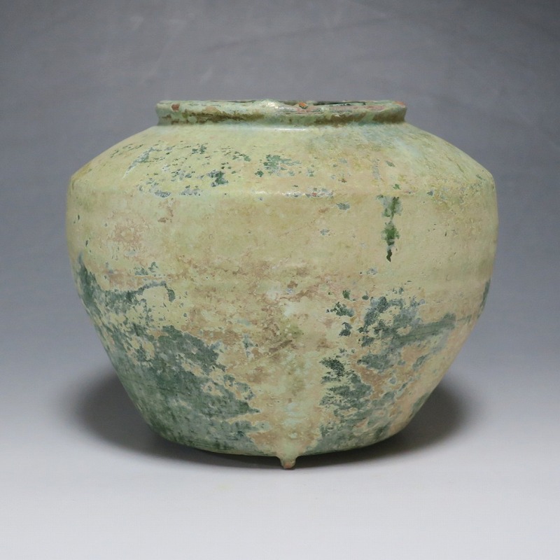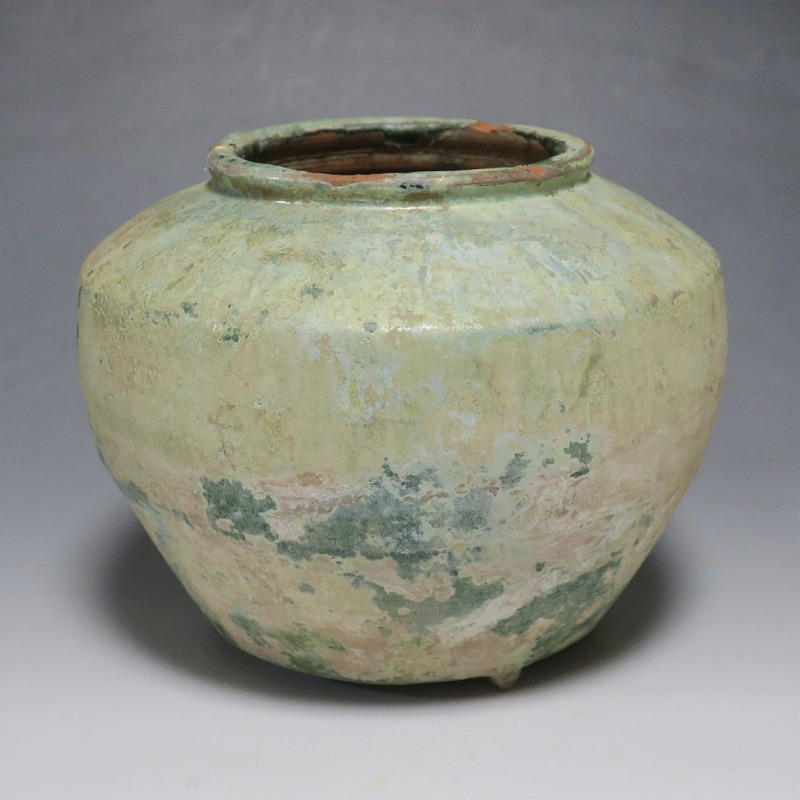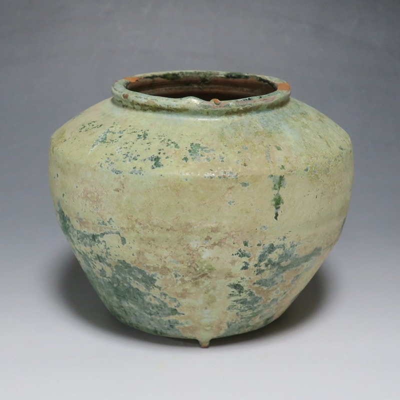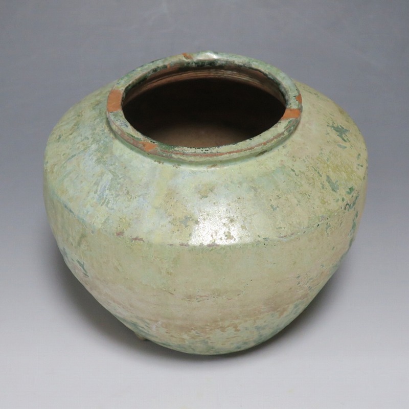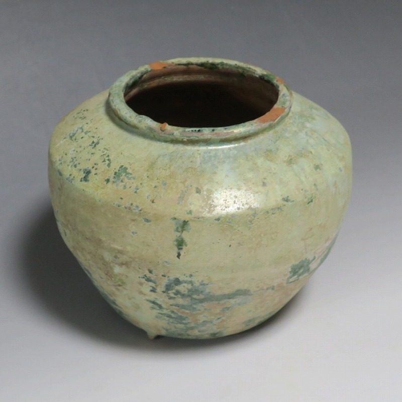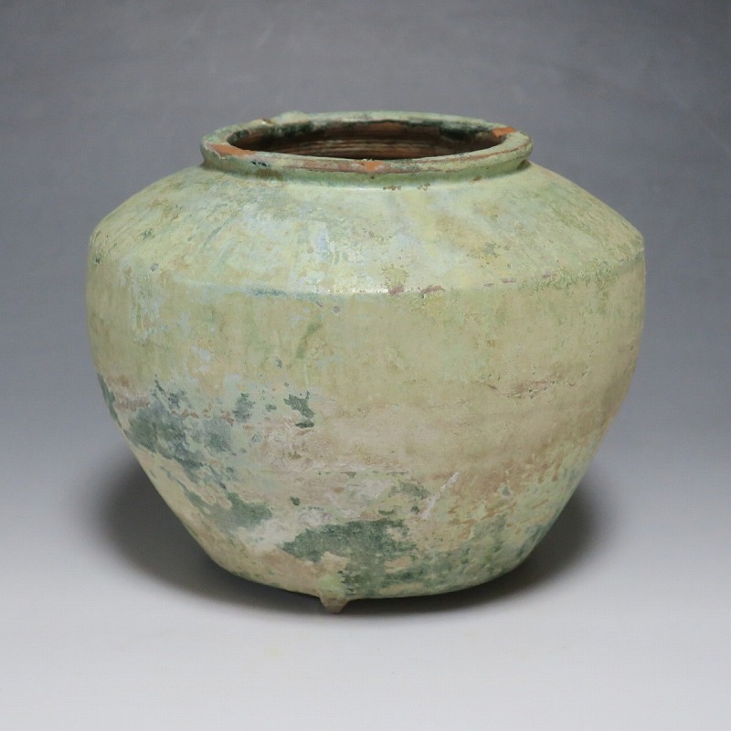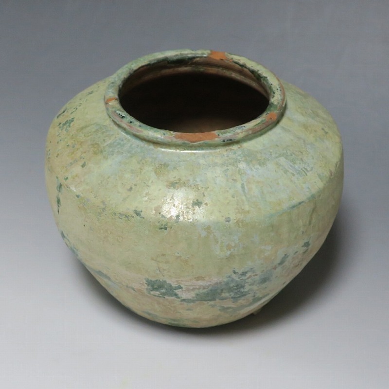 高さ 約12.5cm/胴径 約15.5cm 口辺に削げがあり、発掘品なので全体的に緑釉が銀化し、釉ハゲ、カセ、発掘時の土が付いています。状態は写真でご確認ください。 古代中国では死者を埋葬する時、来世の生活のために陵墓に明器を添える習慣がありました。後漢時代、緑釉技法が発明されるとそれが流行し後漢と言えば「緑釉陶」を思い浮かべるほど有名です。本品は土中の水分を含んで鉛釉が銀化した緑釉小壺。全体的に薄緑色に銀化した美しい壺です。キューカンバグリーンの緑釉とは異なった味わいがあります。飾って古代中国の世界を感じてください。 | ||