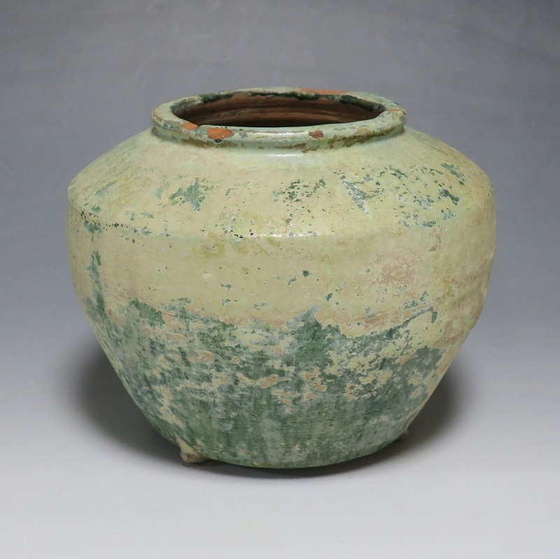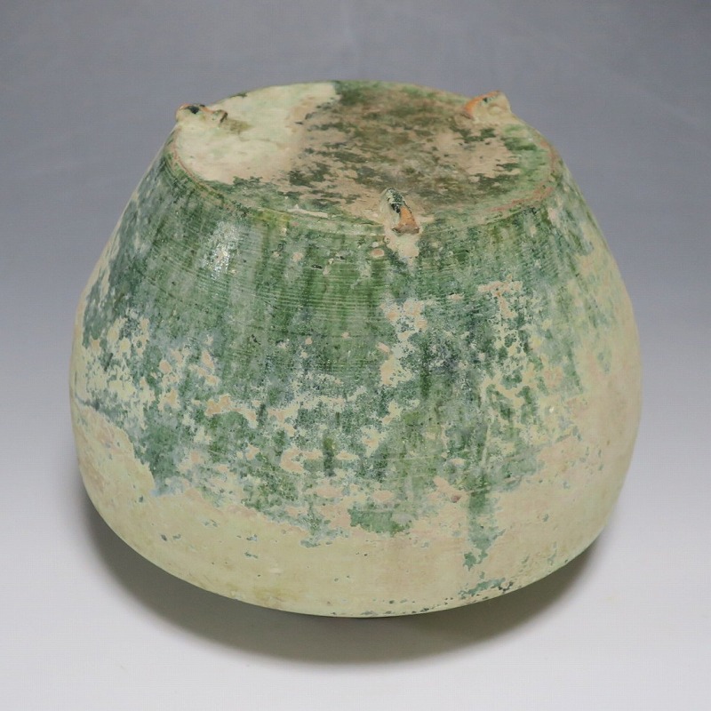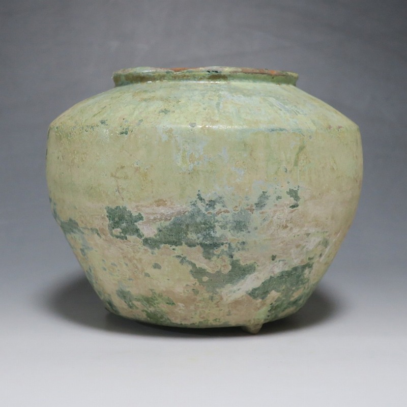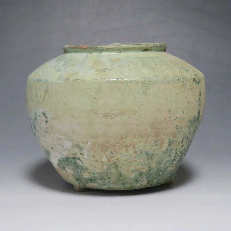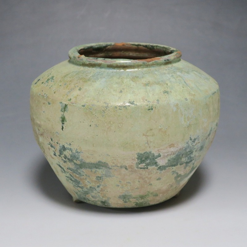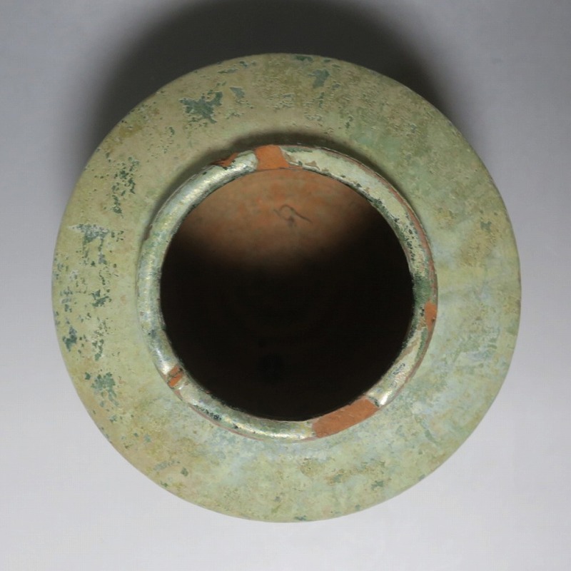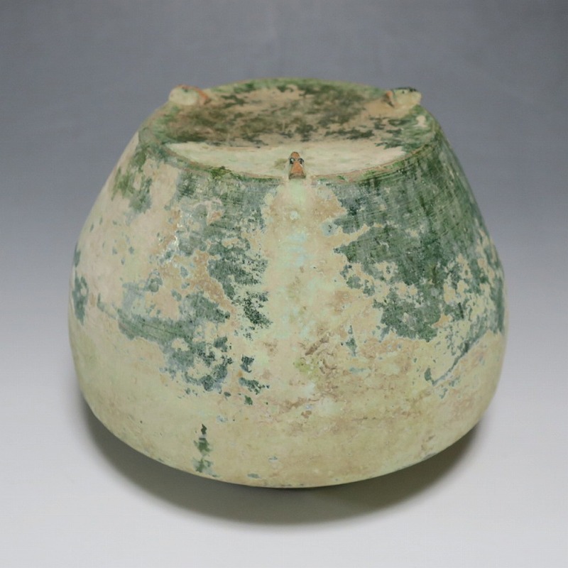 高さ 約12.5cm/胴径 約15.5cm 口辺に削げがあり、発掘品なので全体的に緑釉が銀化し、釉ハゲ、カセ、発掘時の土が付いています。状態は写真でご確認ください。 古代中国では死者を埋葬する時、来世の生活のために陵墓に明器を添える習慣がありました。後漢時代、緑釉技法が発明されるとそれが流行し後漢と言えば「緑釉陶」を思い浮かべるほど有名です。本品は土中の水分を含んで鉛釉が銀化した緑釉小壺。全体的に薄緑色に銀化した美しい壺です。キューカンバグリーンの緑釉とは異なった味わいがあります。飾って古代中国の世界を感じてください。 | ||