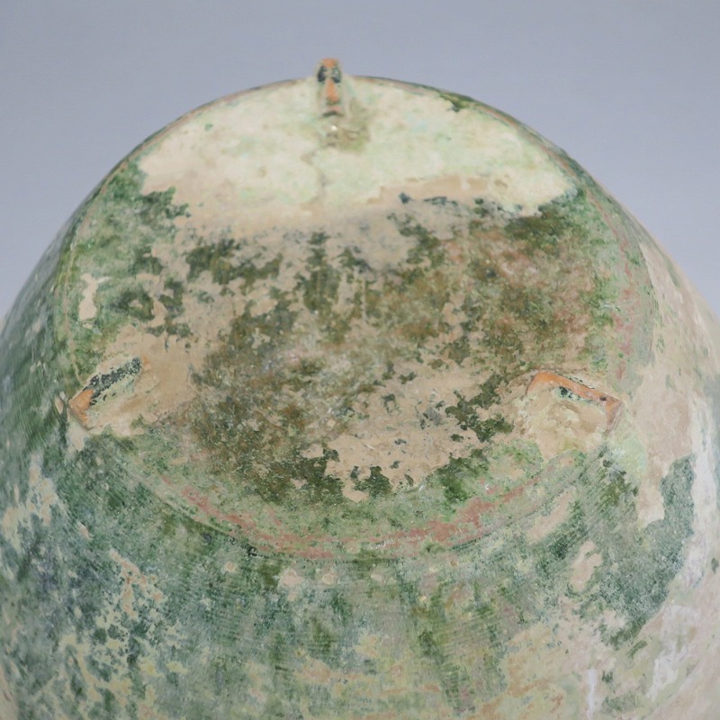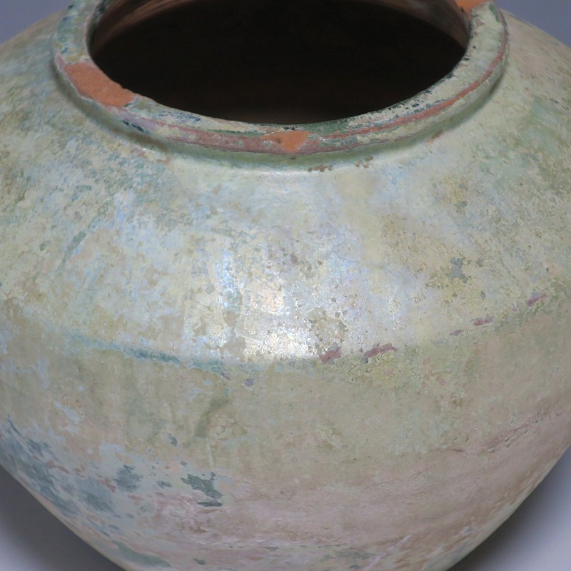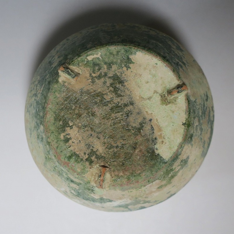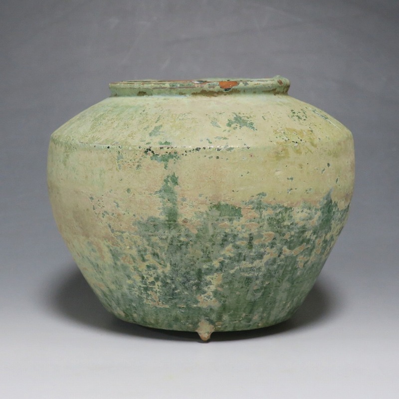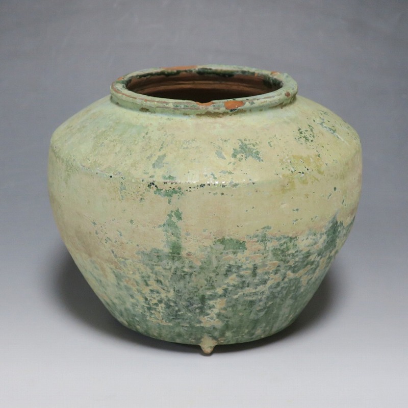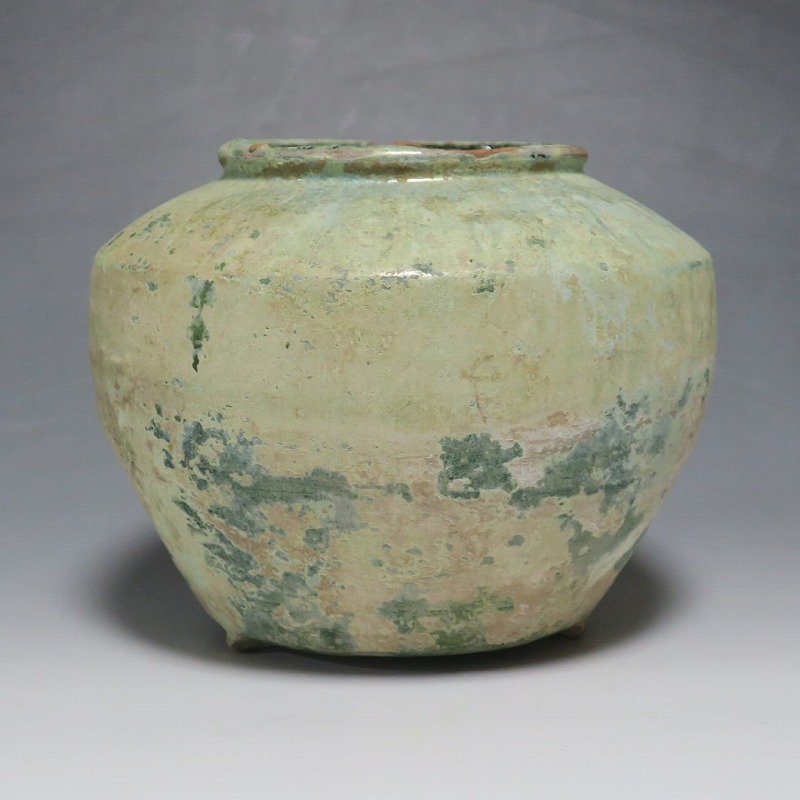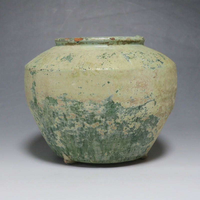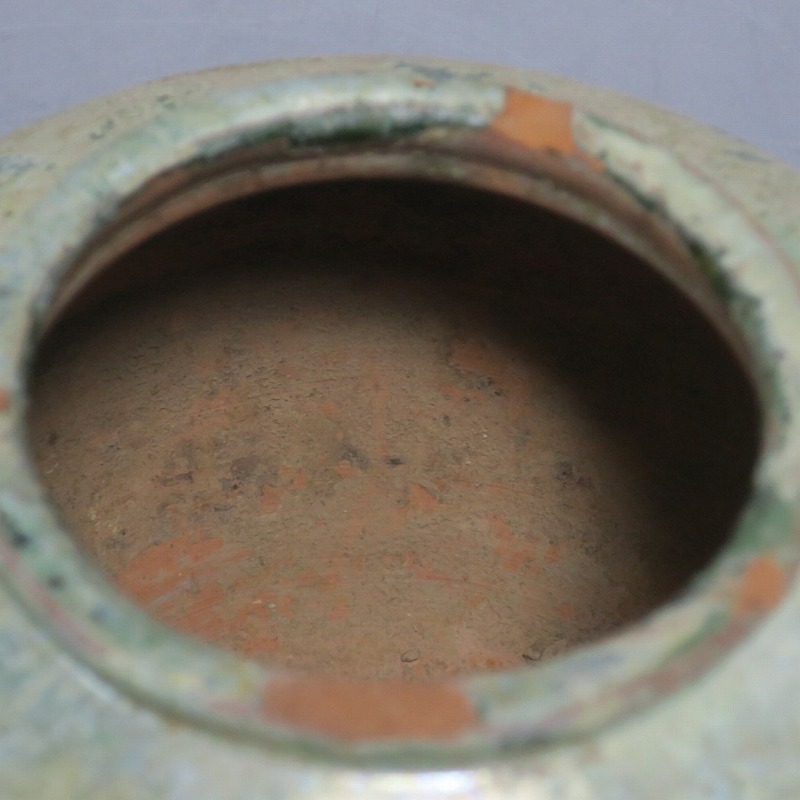 高さ 約12.5cm/胴径 約15.5cm 口辺に削げがあり、発掘品なので全体的に緑釉が銀化し、釉ハゲ、カセ、発掘時の土が付いています。状態は写真でご確認ください。 古代中国では死者を埋葬する時、来世の生活のために陵墓に明器を添える習慣がありました。後漢時代、緑釉技法が発明されるとそれが流行し後漢と言えば「緑釉陶」を思い浮かべるほど有名です。本品は土中の水分を含んで鉛釉が銀化した緑釉小壺。全体的に薄緑色に銀化した美しい壺です。キューカンバグリーンの緑釉とは異なった味わいがあります。飾って古代中国の世界を感じてください。 | ||