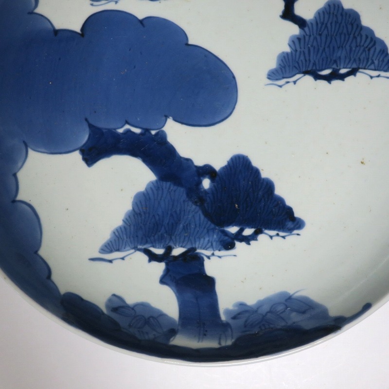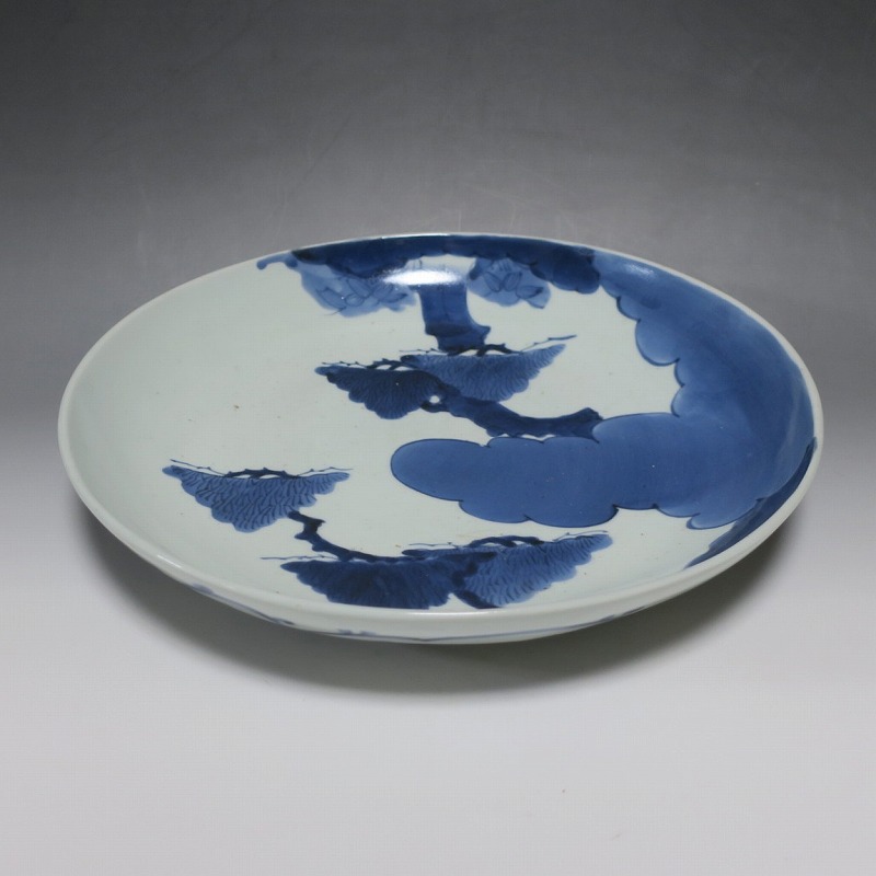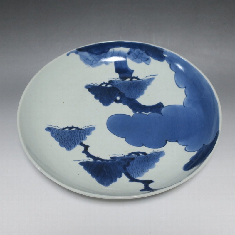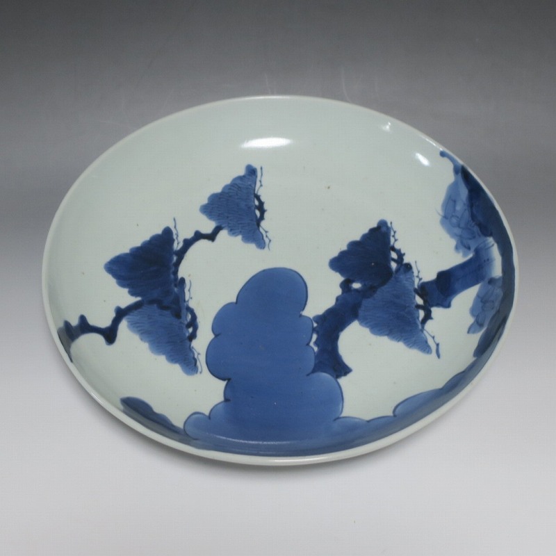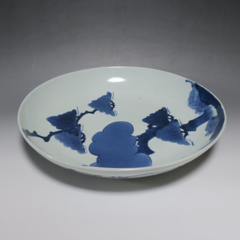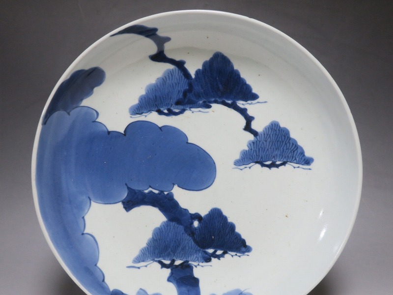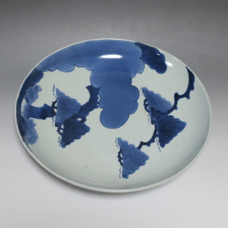 (江戸時代中期 宝暦 18世紀中頃) 商品番号 4132 口径 約31.3cm/高さ 約5.7cm/高台径 約20cm 窯傷はありますが、完品です。状態は写真でご確認ください。 18世紀前半、徳川吉宗が享保の改革を行うと北前船の航路拡大によって商品流通が活発になります。また、醤油の発明、漁業の技術改良などが日本人の食生活を一変させ、それに合わせたデザインの食器が開発されました。本品は染付で松の木と雲を描いた尺皿。やまと絵風の絵付けをした作品です。三角形の松と雲の表現や余白の関係がバランスの良く配置されています。絵心のある絵付師が描いた作品でしょう。飾ると絵画作品を見ているような感じがします。 | ||