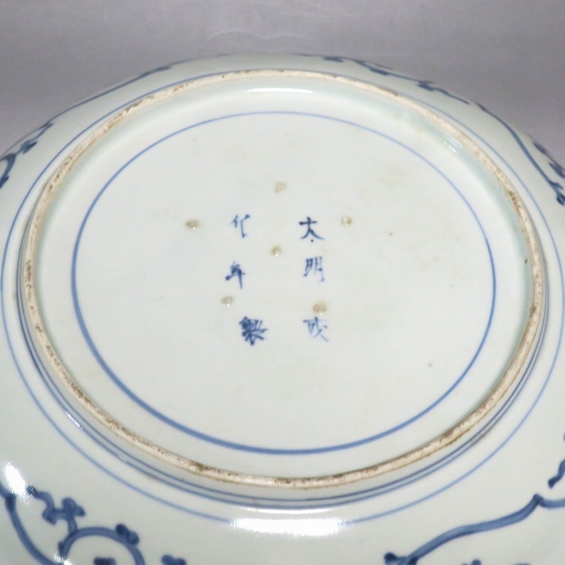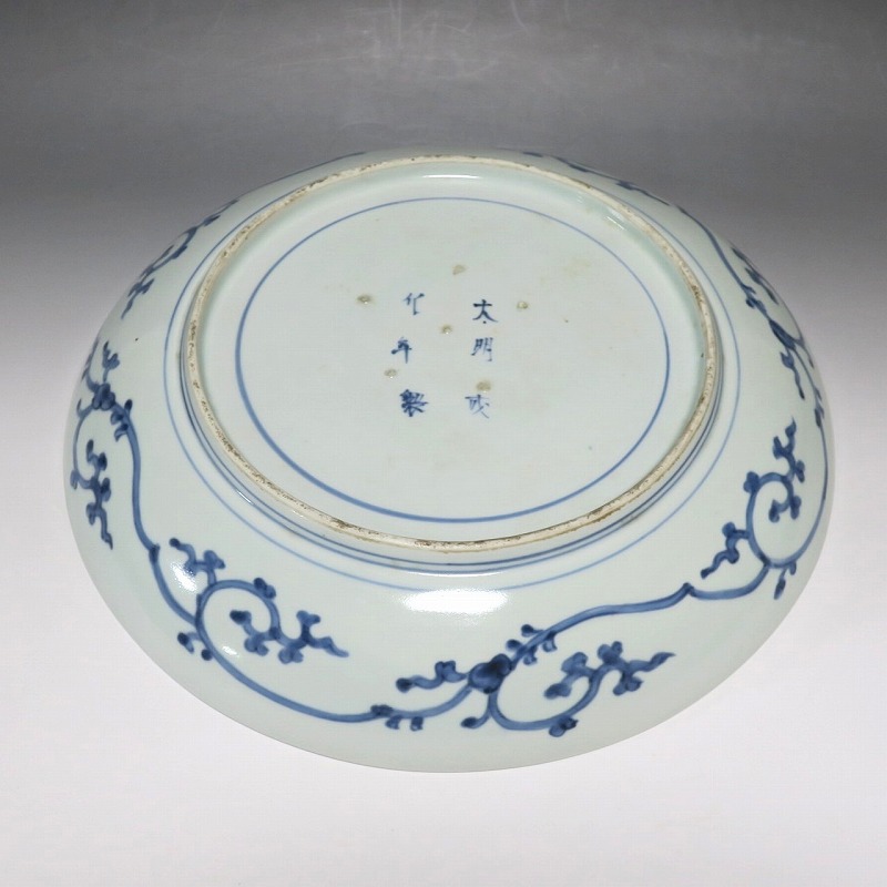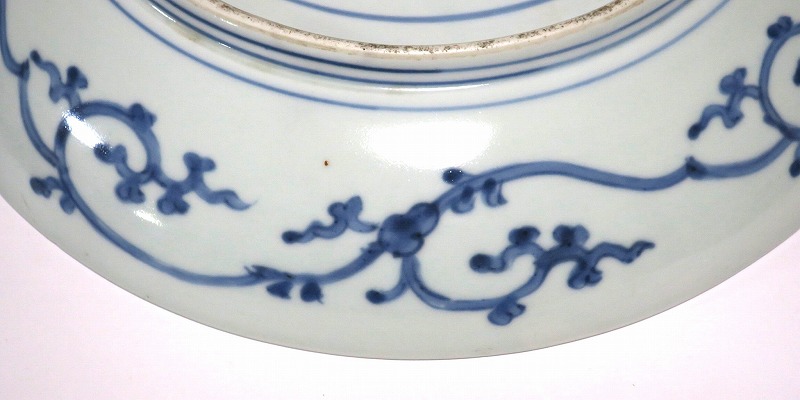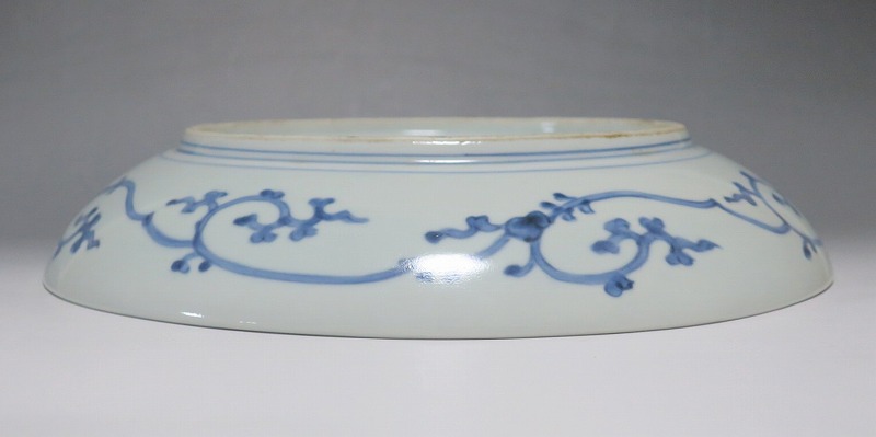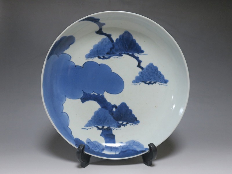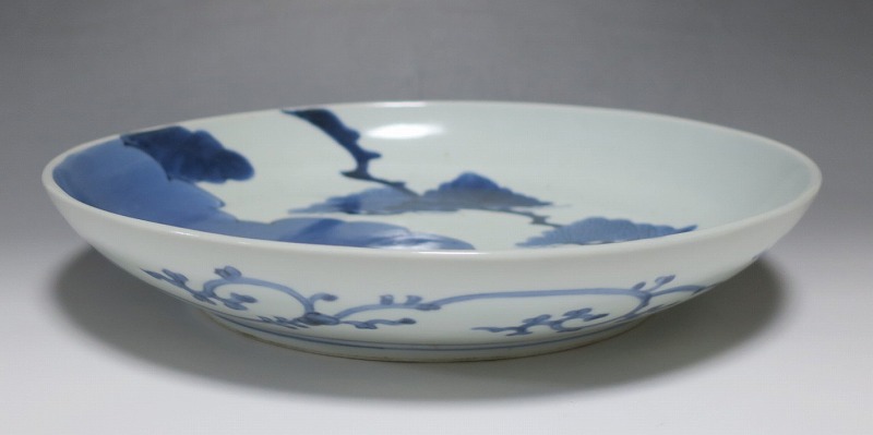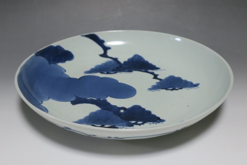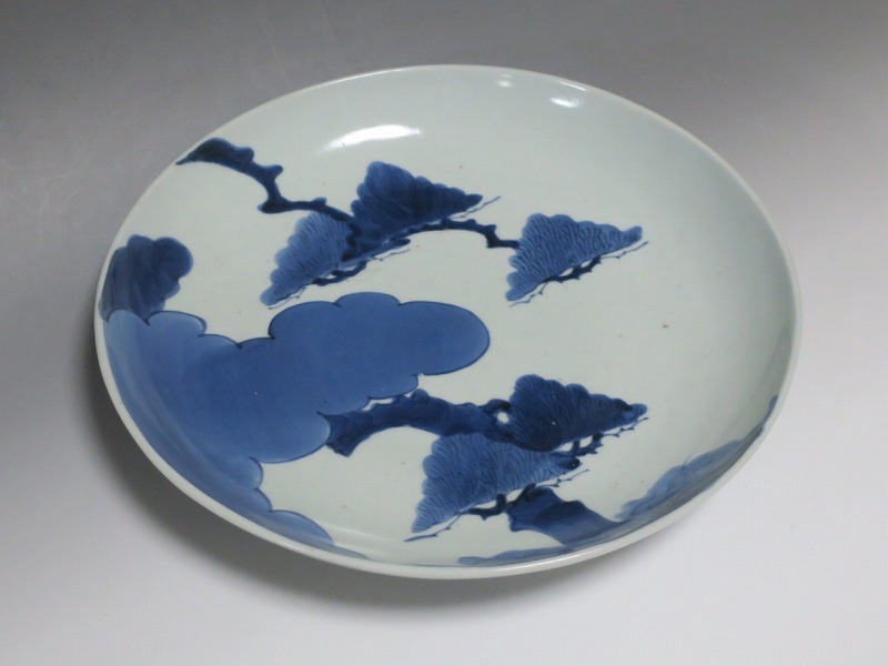 (江戸時代中期 宝暦 18世紀中頃) 商品番号 4132 口径 約31.3cm/高さ 約5.7cm/高台径 約20cm 窯傷はありますが、完品です。状態は写真でご確認ください。 18世紀前半、徳川吉宗が享保の改革を行うと北前船の航路拡大によって商品流通が活発になります。また、醤油の発明、漁業の技術改良などが日本人の食生活を一変させ、それに合わせたデザインの食器が開発されました。本品は染付で松の木と雲を描いた尺皿。やまと絵風の絵付けをした作品です。三角形の松と雲の表現や余白の関係がバランスの良く配置されています。絵心のある絵付師が描いた作品でしょう。飾ると絵画作品を見ているような感じがします。 | ||