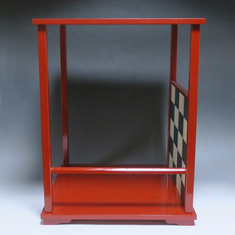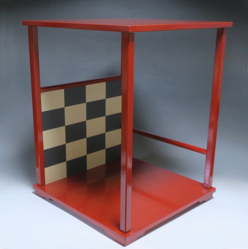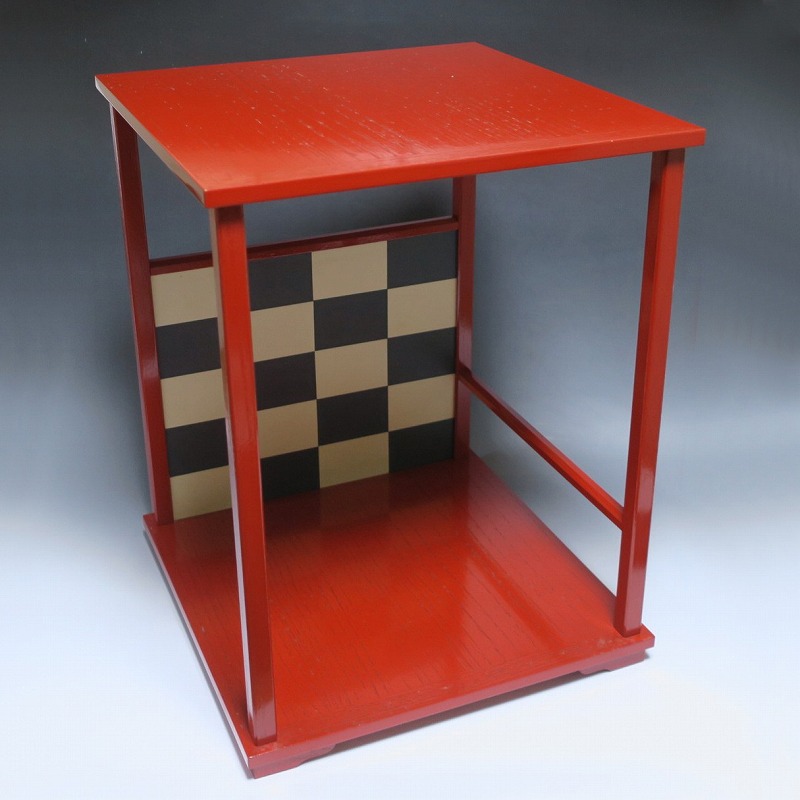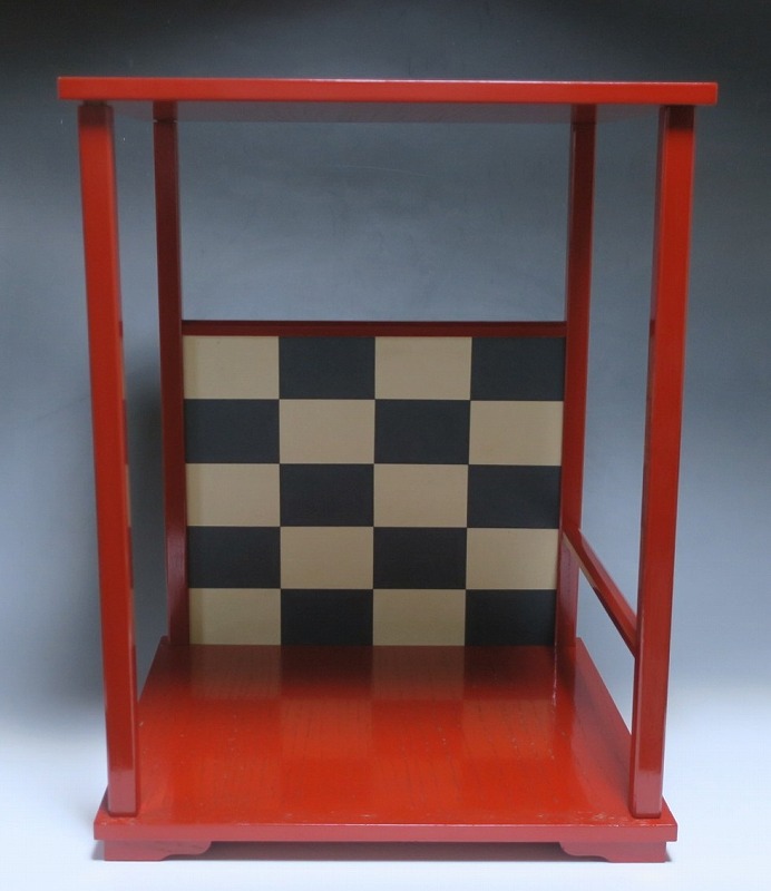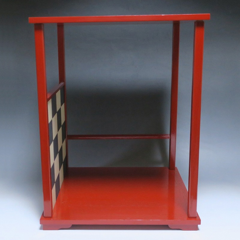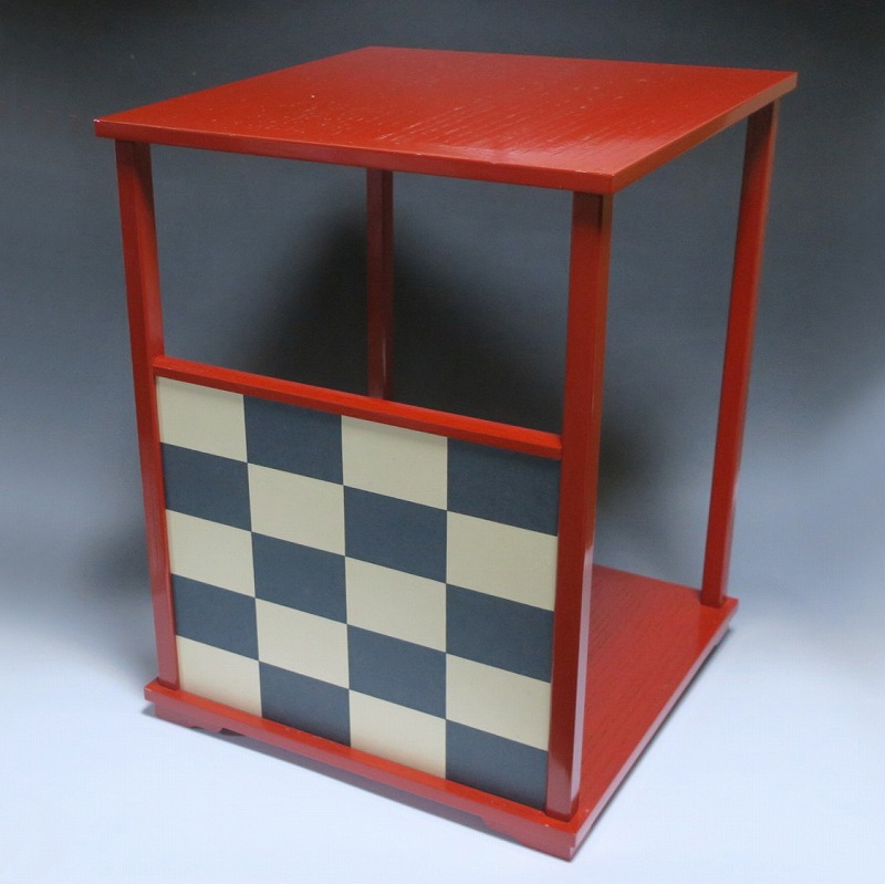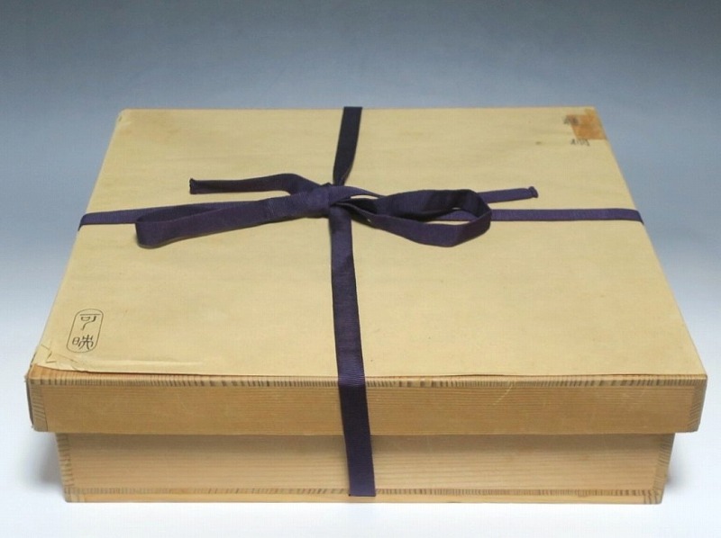 高さ 約43.1cm/横幅 約33.2cm/奥行 約33.3cm 経年の傷みや保存袋に染みがありますが、総じて良い状態です。状態は写真でご確認ください。 渡辺可映は、茶道界で名前を知られた茶道具の指物師です。江戸指物の技術を使い茶道の各流派の指物(接合道具を使わずに木と木を組み合わせて作る家具や調度品)を製作しています。本品は平成時代に作られた江戸指物の茶棚。桂離宮に使用されている市松文を使用した桂棚と呼ばれる茶棚です。デザイン、指物も洒落たデザインの作品。水差、茶道具の飾り棚の他、古美術品の飾り棚としてご使用ください。 | ||