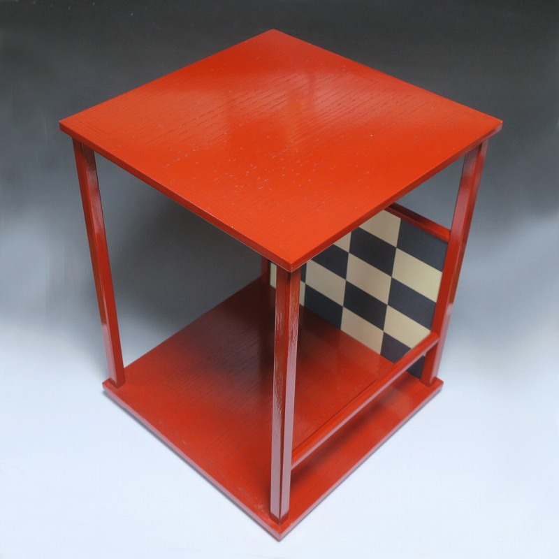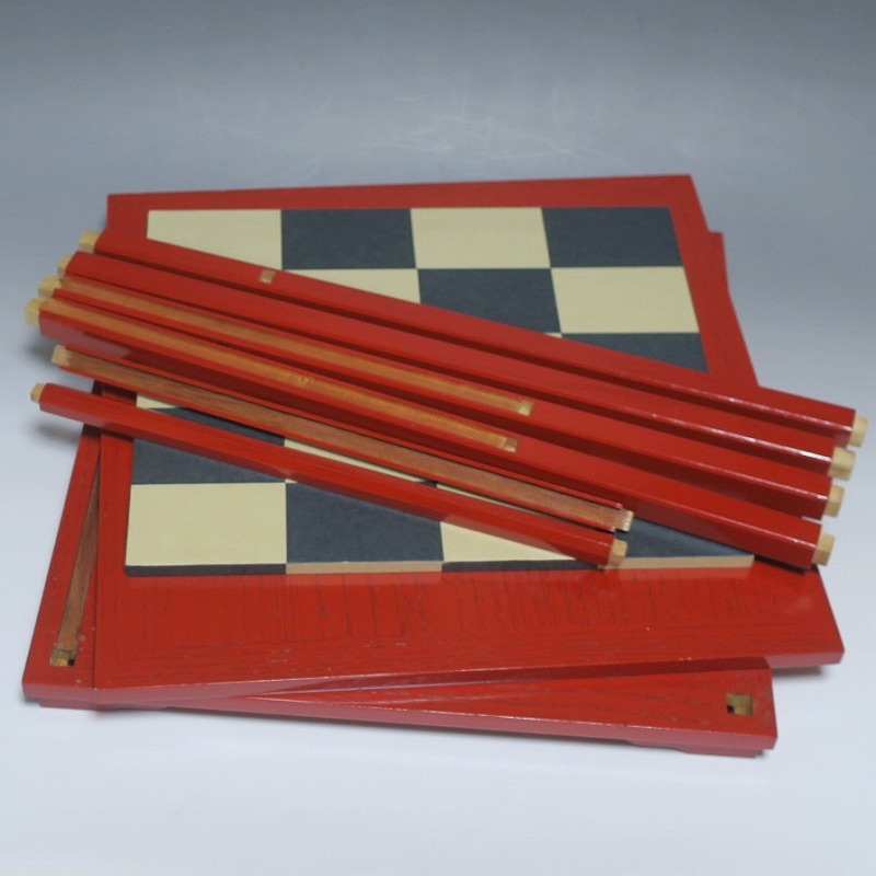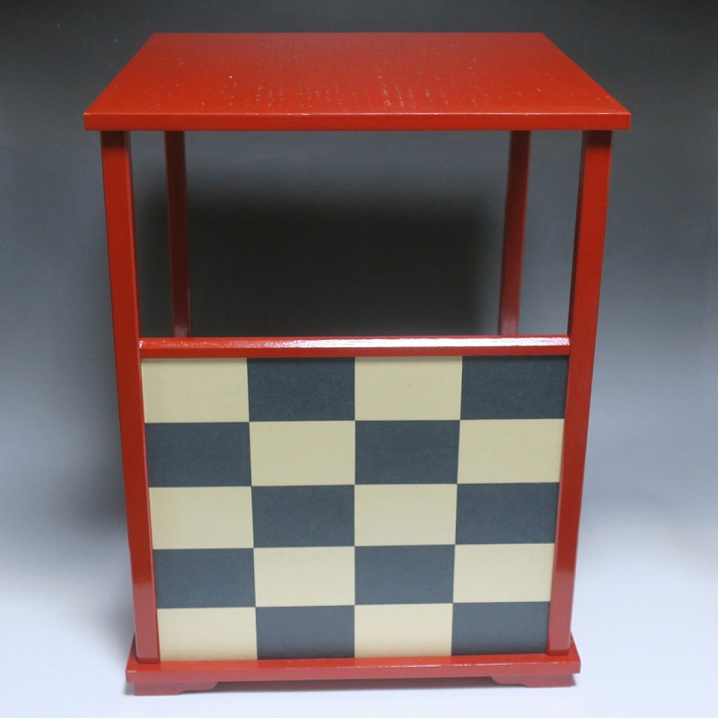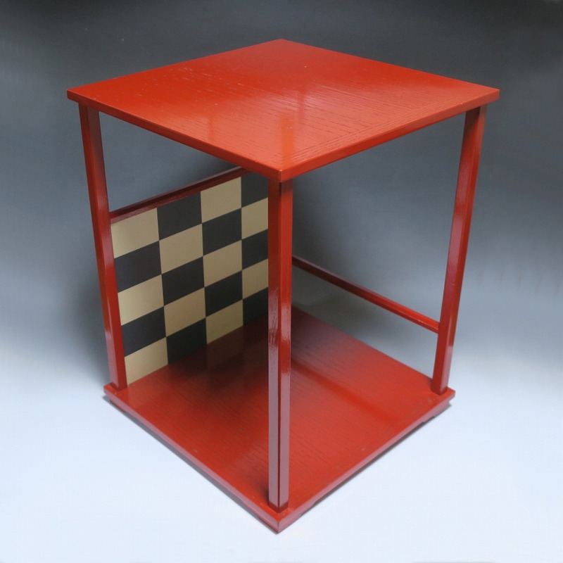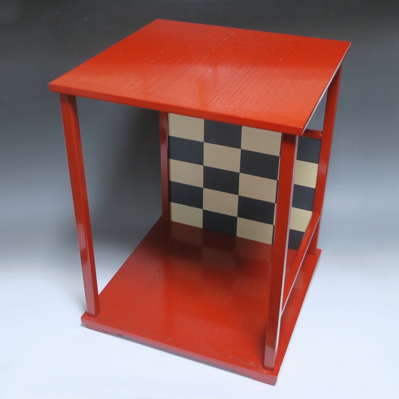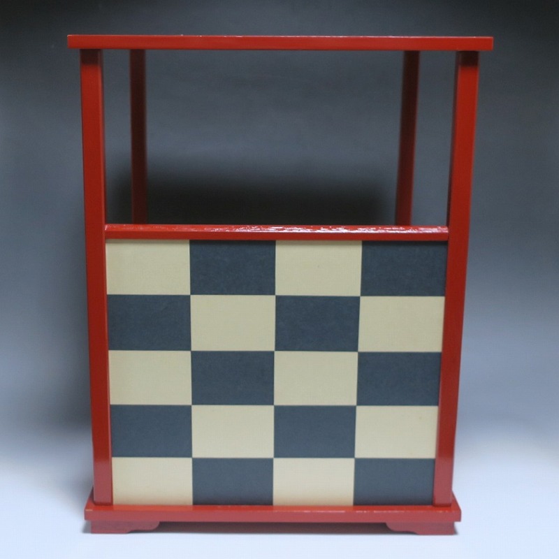 高さ 約43.1cm/横幅 約33.2cm/奥行 約33.3cm 経年の傷みや保存袋に染みがありますが、総じて良い状態です。状態は写真でご確認ください。 渡辺可映は、茶道界で名前を知られた茶道具の指物師です。江戸指物の技術を使い茶道の各流派の指物(接合道具を使わずに木と木を組み合わせて作る家具や調度品)を製作しています。本品は平成時代に作られた江戸指物の茶棚。桂離宮に使用されている市松文を使用した桂棚と呼ばれる茶棚です。デザイン、指物も洒落たデザインの作品。水差、茶道具の飾り棚の他、古美術品の飾り棚としてご使用ください。 | ||