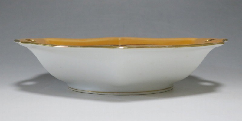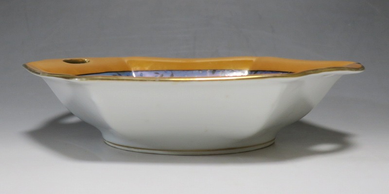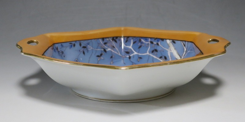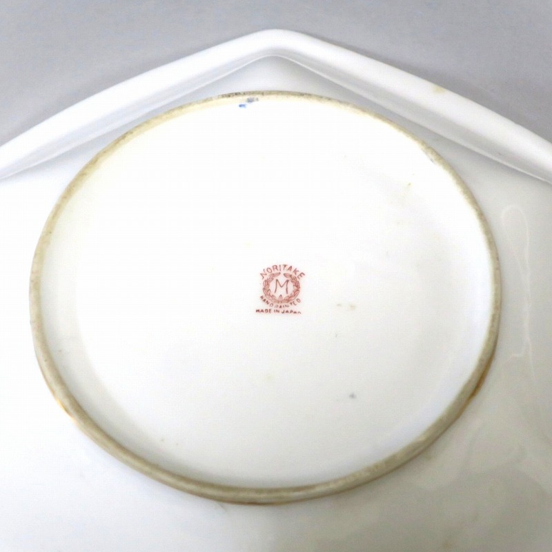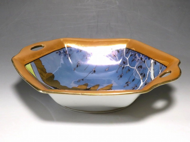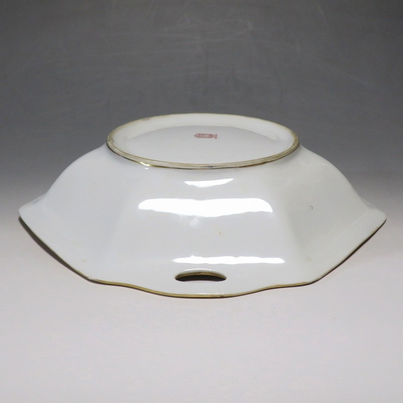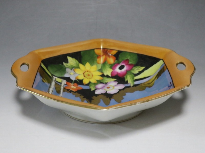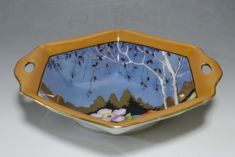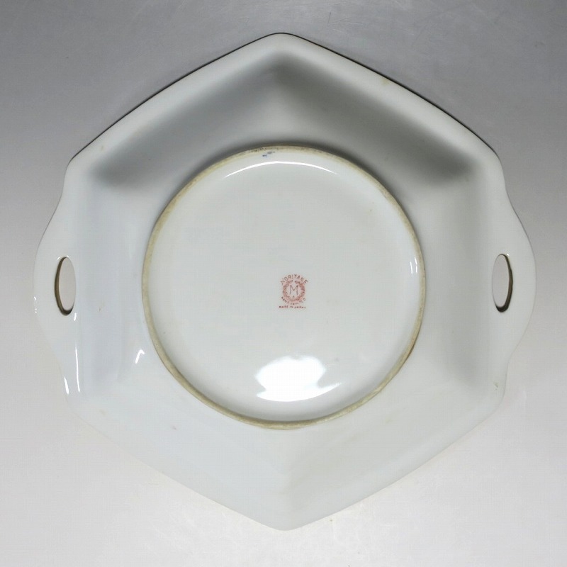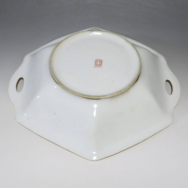 口径 約23.2cm/横幅 約23.5cm 若干の擦り傷がありますが、完品。総じて良い状態です。状態は写真でご確認ください。 「オールドノリタケ」は、日本陶器合名会社(現ノリタケ・カンパニー・リミティッド)が明治時代から戦前に欧米へ輸出した陶磁器の名称です。芸術的な絵付けや繊細な細工が施された作品は現在でも人気があります。本品は色絵金彩で花や蔦、森を描いた取っ手付き六角トレー。ラスター彩と金を使った雰囲気のある作品です。花や森を題材とした物語を表現したような雰囲気があります。1921年(大正10年)まで使用されたマークがついています。飾るとフェアリーテールの世界を感じることができるでしょう。 | ||