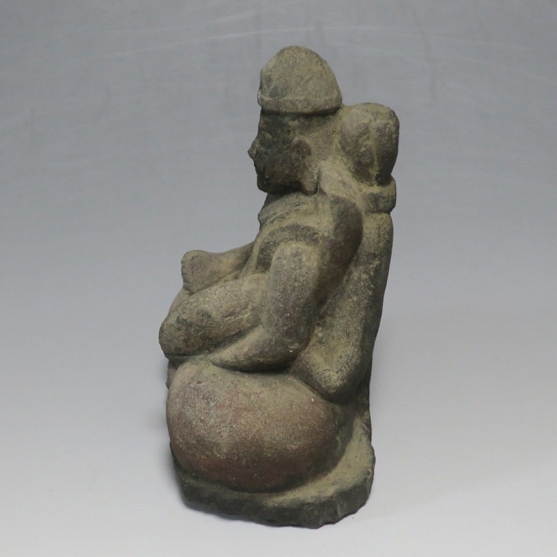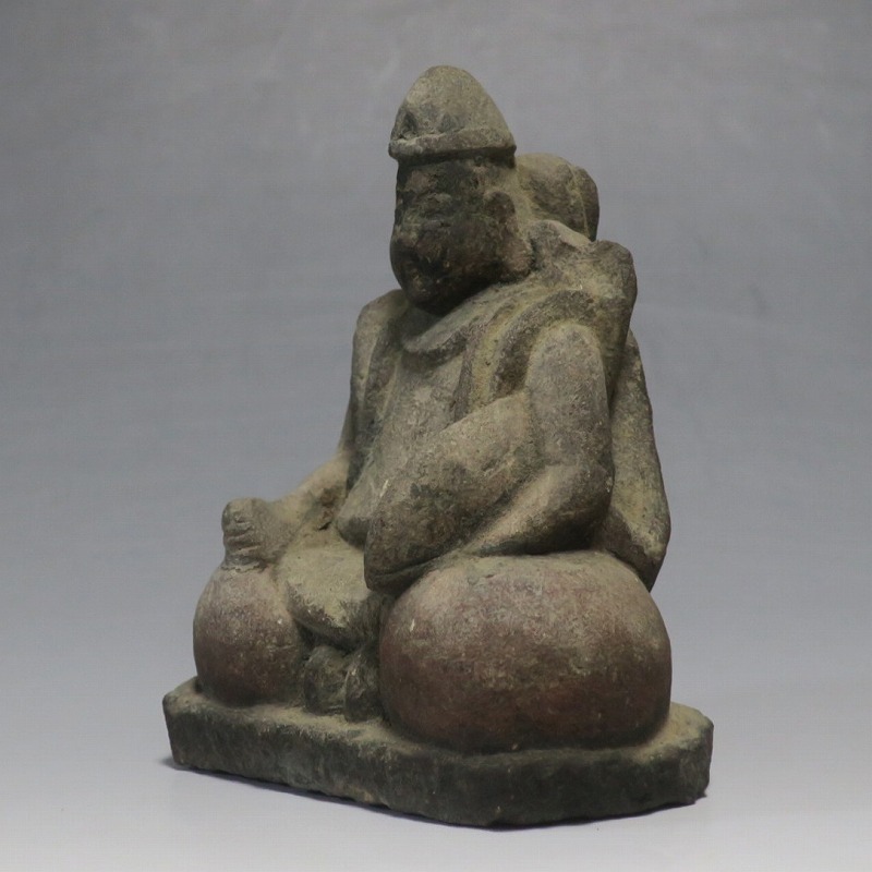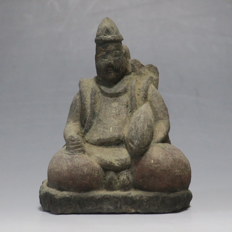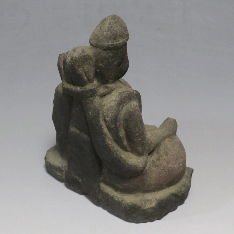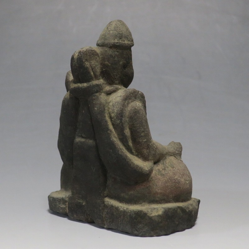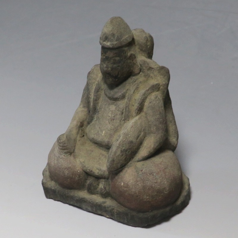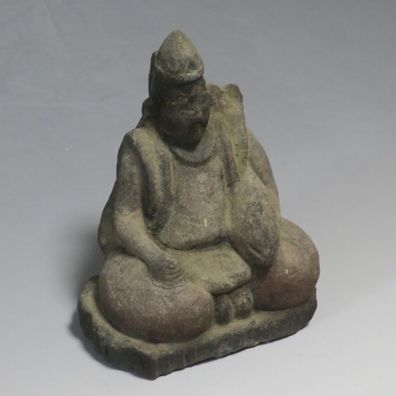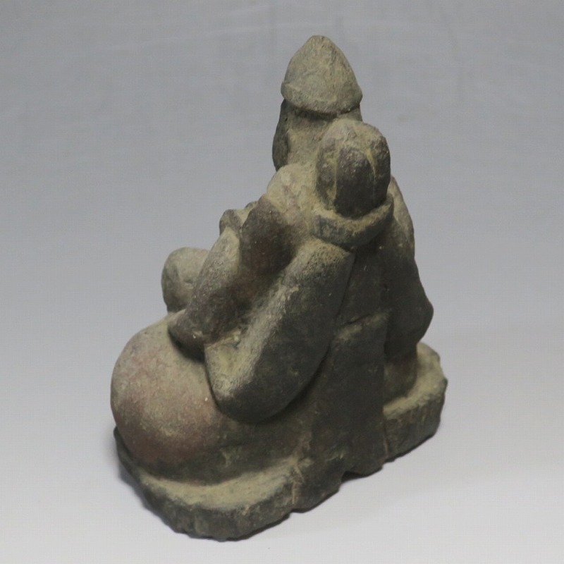(江戸時代初期 19世紀前半) 商品番号 4145 高さ 約11.5cm/横幅 約9cm/奥行 約5.5cm 経年の汚れがつき、竿の欠損、鯛の尻尾、高台に小さな欠けがあります。状態は写真でご確認ください。 恵比須神は古代神話に登場する蛭子命、あるいは事代主神の化身です。古代から漁業神、商業神、渡来人の神として兵庫県西宮市の西宮神社を中心に信仰を集めました。本品は江戸時代後期に作られた石彫の恵比須神。多くの作品は木彫ですが、本品は石を彫った作品です。小さな恵比寿像なので村の祠などに祀られていたのでしょう。珍しい石彫の恵比寿像です。 | ||