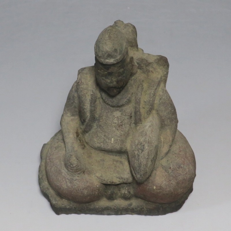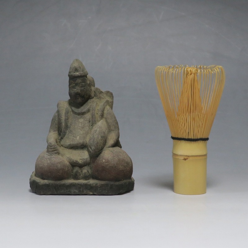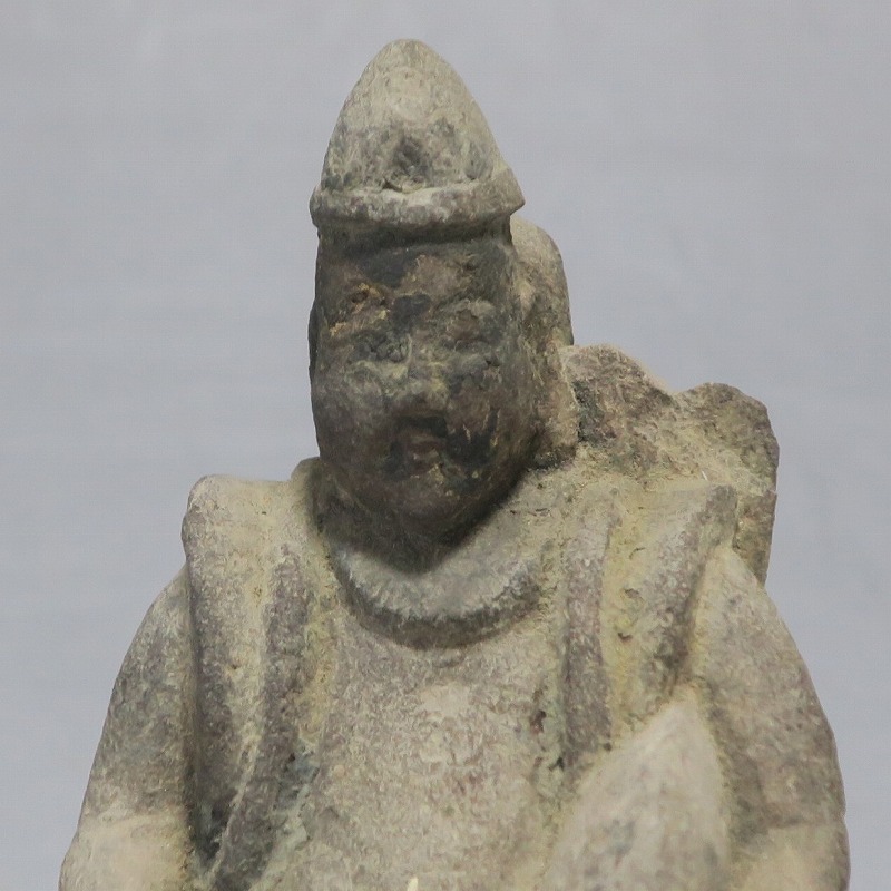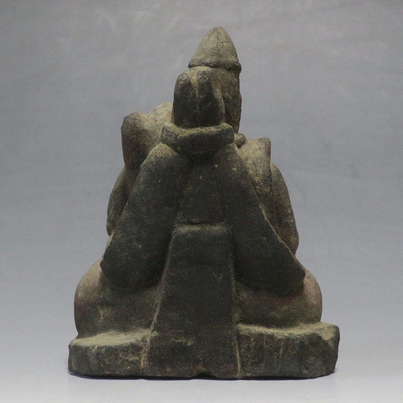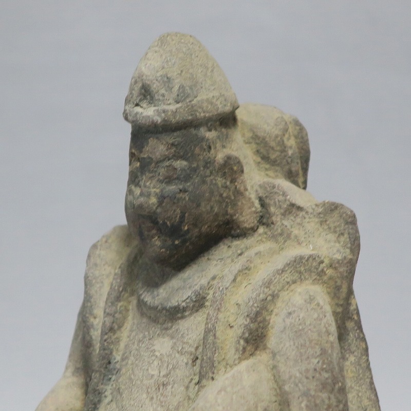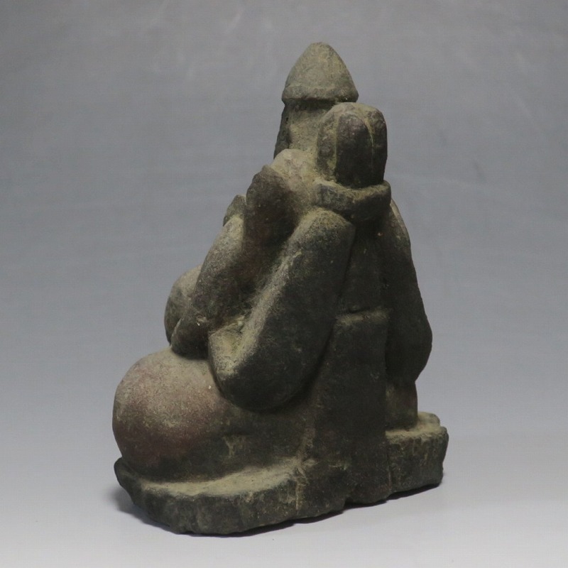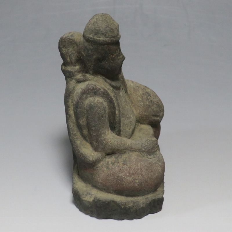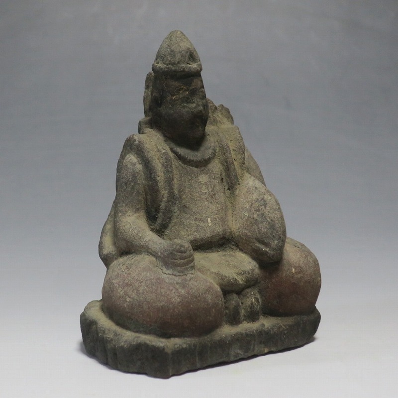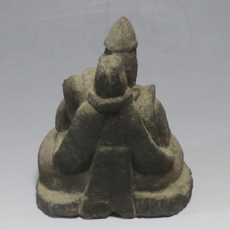 (江戸時代初期 19世紀前半) 商品番号 4145 高さ 約11.5cm/横幅 約9cm/奥行 約5.5cm 経年の汚れがつき、竿の欠損、鯛の尻尾、高台に小さな欠けがあります。状態は写真でご確認ください。 恵比須神は古代神話に登場する蛭子命、あるいは事代主神の化身です。古代から漁業神、商業神、渡来人の神として兵庫県西宮市の西宮神社を中心に信仰を集めました。本品は江戸時代後期に作られた石彫の恵比須神。多くの作品は木彫ですが、本品は石を彫った作品です。小さな恵比寿像なので村の祠などに祀られていたのでしょう。珍しい石彫の恵比寿像です。 | ||
