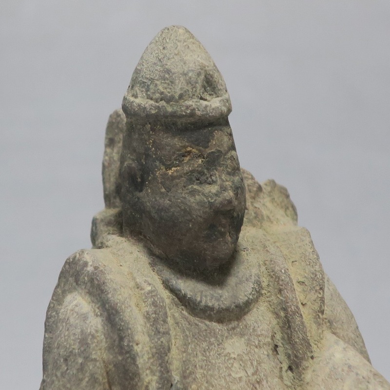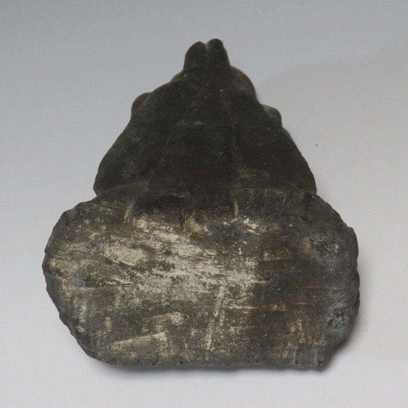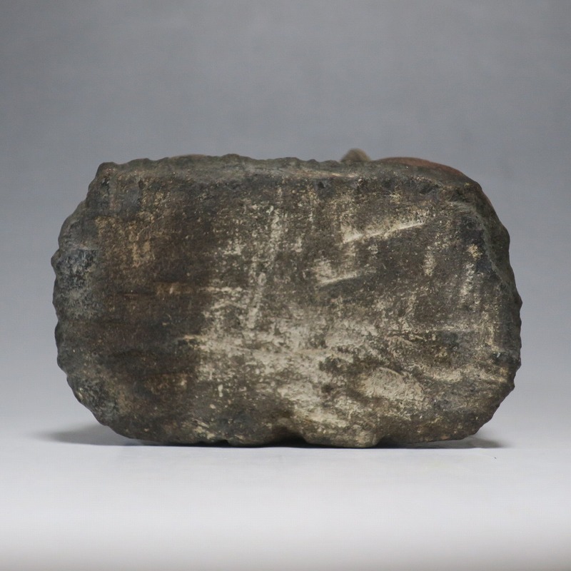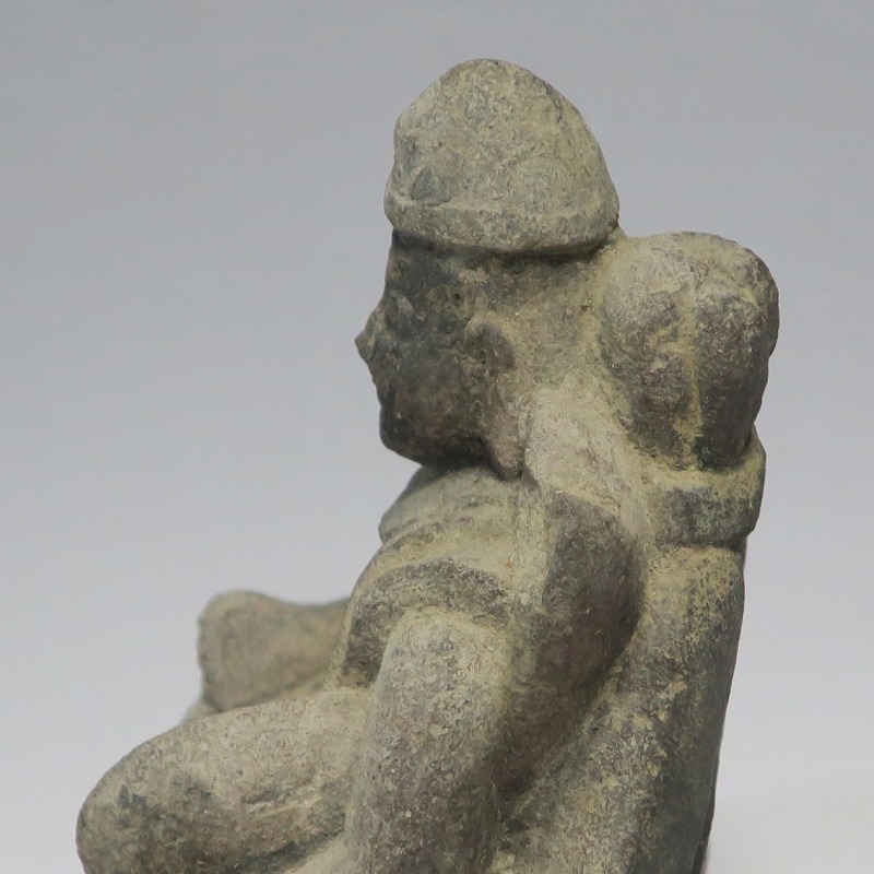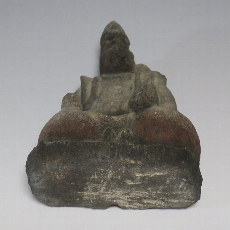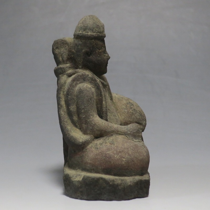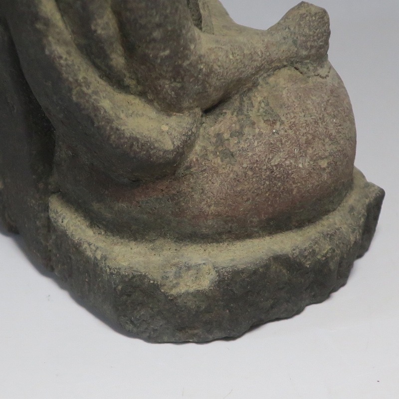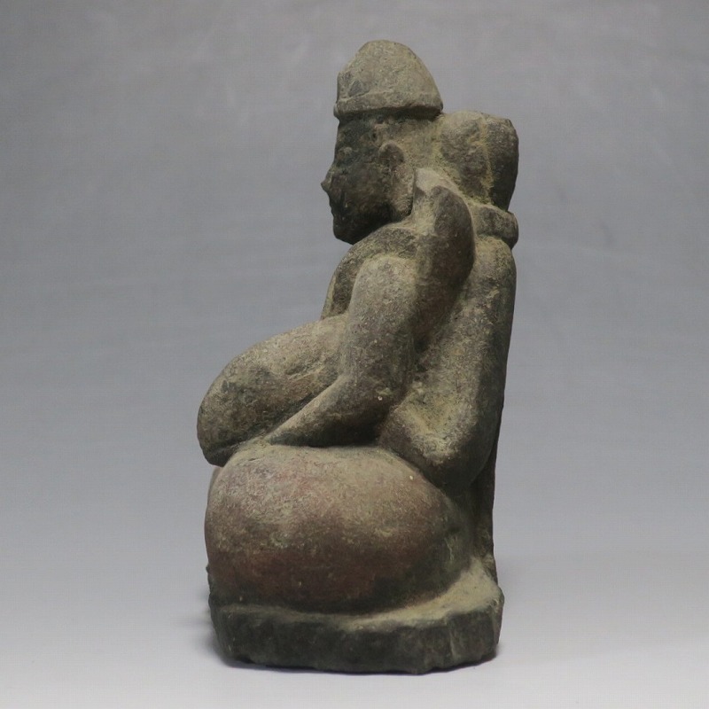 (江戸時代初期 19世紀前半) 商品番号 4145 高さ 約11.5cm/横幅 約9cm/奥行 約5.5cm 経年の汚れがつき、竿の欠損、鯛の尻尾、高台に小さな欠けがあります。状態は写真でご確認ください。 恵比須神は古代神話に登場する蛭子命、あるいは事代主神の化身です。古代から漁業神、商業神、渡来人の神として兵庫県西宮市の西宮神社を中心に信仰を集めました。本品は江戸時代後期に作られた石彫の恵比須神。多くの作品は木彫ですが、本品は石を彫った作品です。小さな恵比寿像なので村の祠などに祀られていたのでしょう。珍しい石彫の恵比寿像です。 | ||