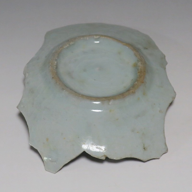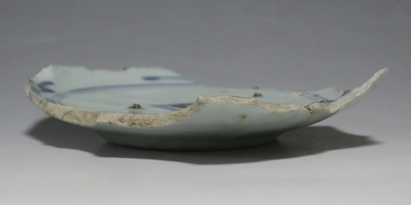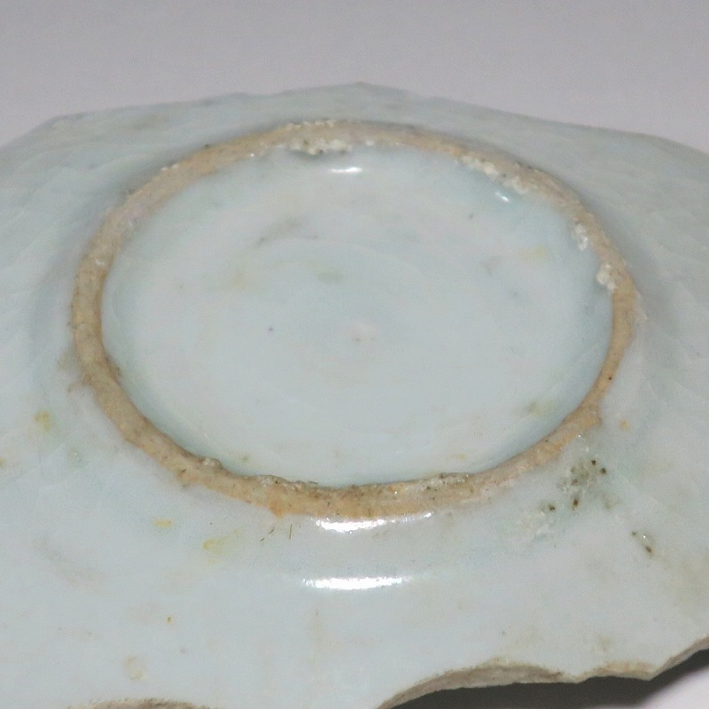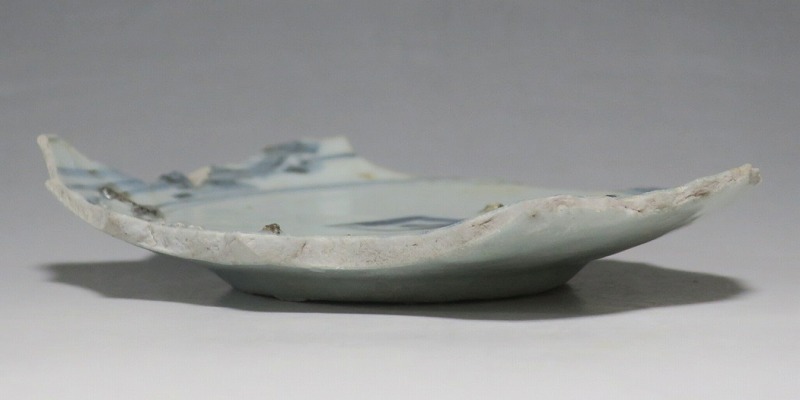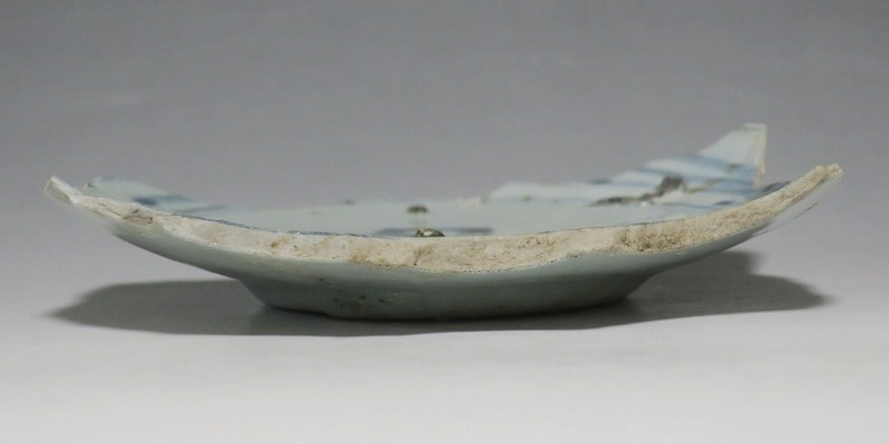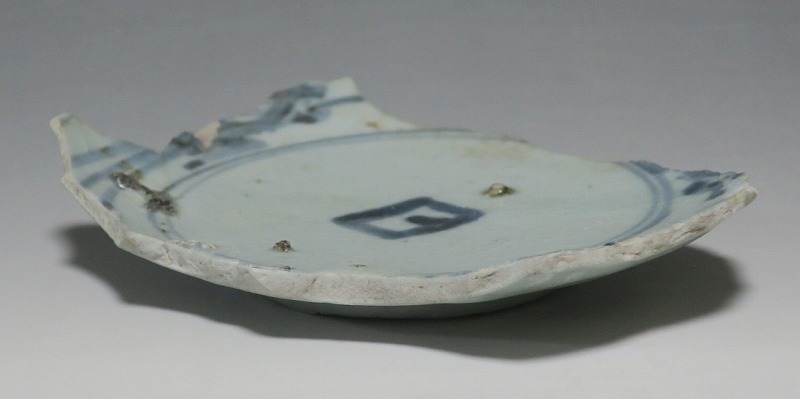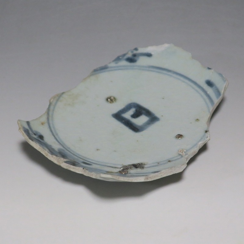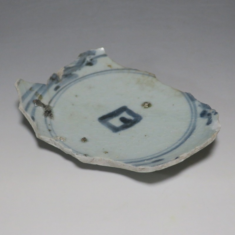 (江戸時代前期 1640年頃) 商品番号 4146 高さ 約3cm/横幅 約14.3cm/奥行 約10cm 甘手です。状態は写真でご確認ください。 日本で磁器が製作されるようになったのは17世紀前半です。初期伊万里の絵付けは景徳鎮の影響を受けていますが、それよりも柔らかいタッチ、和風で絵付けが成されています。本品は見込みに「日」の字のある染付陶片。本来は鳳凰文が描かれたなます皿の残欠なので、南中する太陽を意識して作られたのでしょう。高台が付いているので、酒の当てを盛る皿などに使用できます。食器、資料としてお楽しみください。 | ||