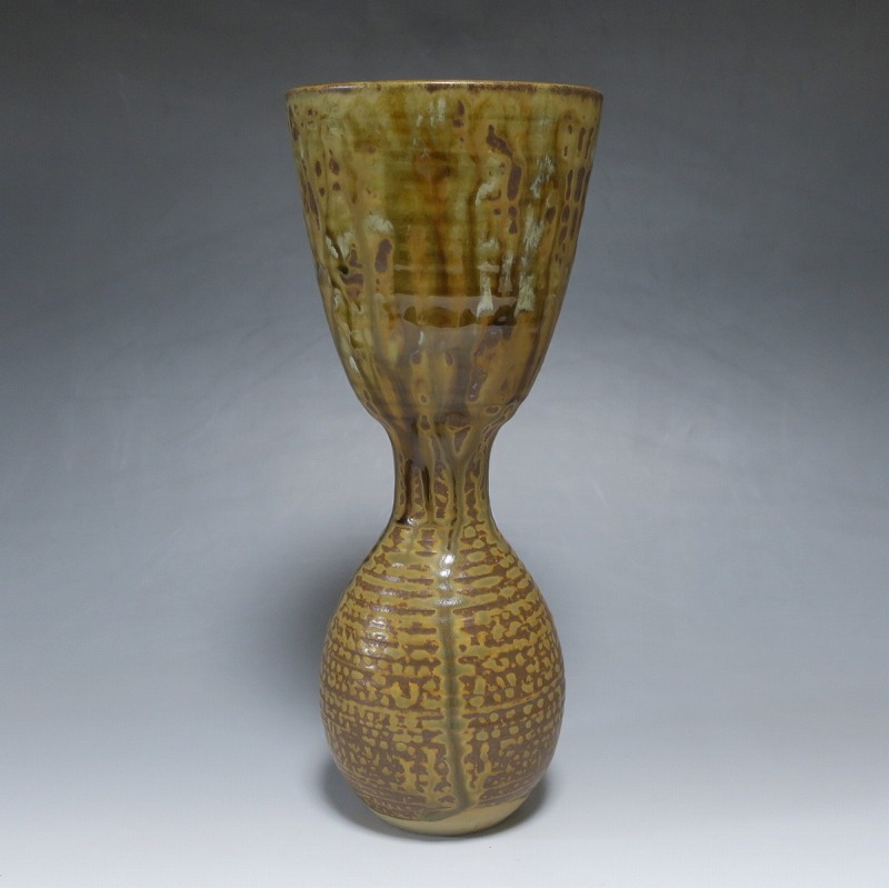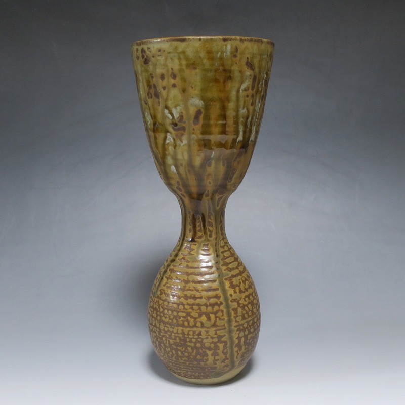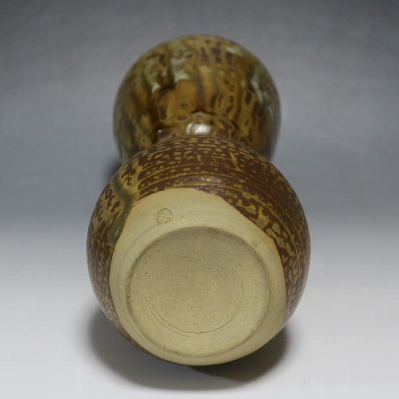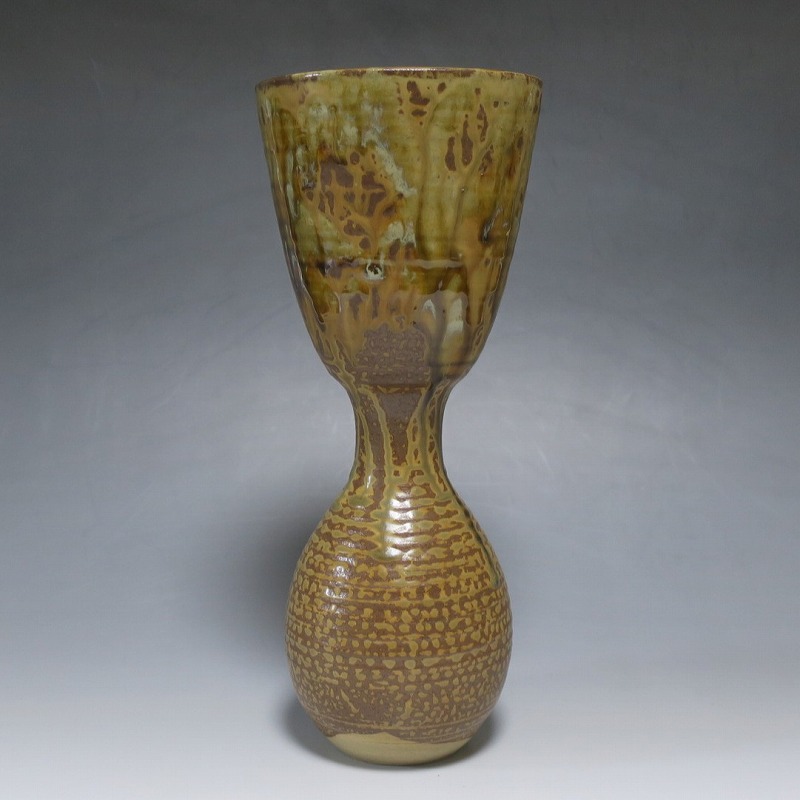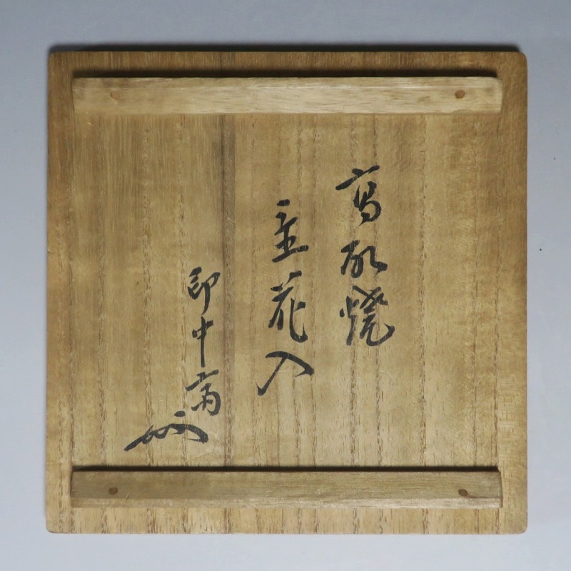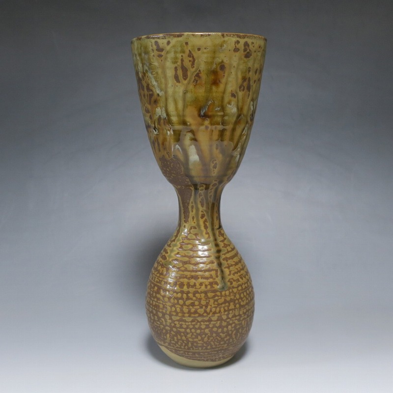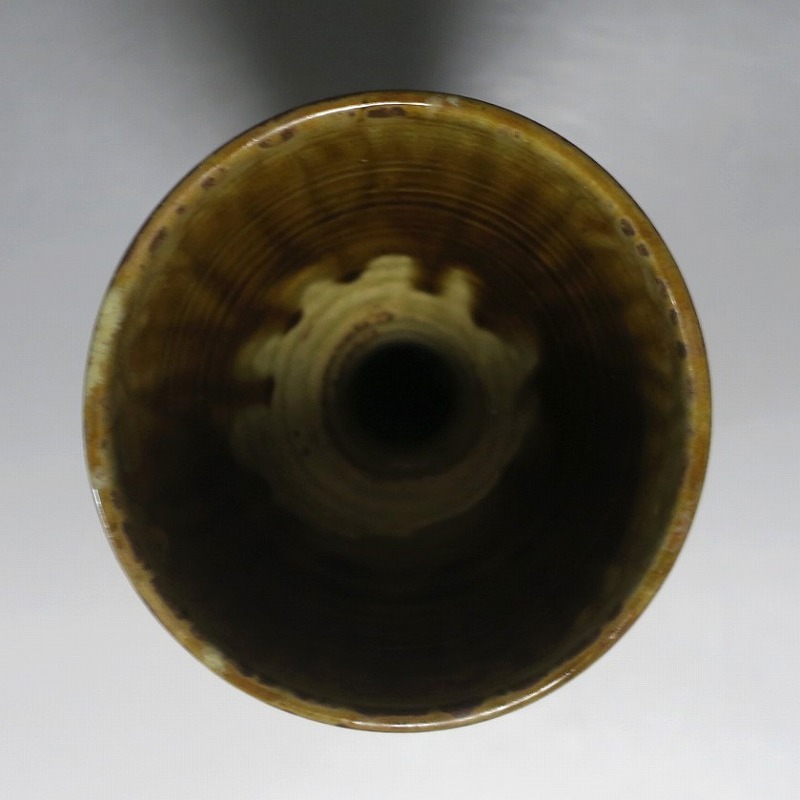 高さ 約29.3cm/口径 約12cm/高台径 約6cm 総じて良い状態です。状態は写真でご確認ください。 高取焼は17世紀後半、福岡藩3代・黒田光之の藩命によって開かれた窯です。初期は唐津焼に似た茶器を作っていましたが、元禄時代になると高取焼は本窯と小石原高取焼に別れ、独自の焼物を製作するようになりました。本品は昭和時代に作られた高取焼の花入れ。作風から十三代・高取八仙(1934年〜)の作品だと考えられます。表千家・即中斎(1901年〜1979年)の箱書きがあります。彫刻のような造形をしたモダンな花入れ。花器としてお楽しみください。 | ||