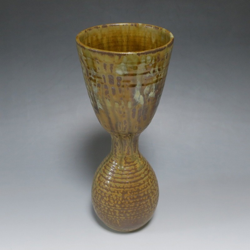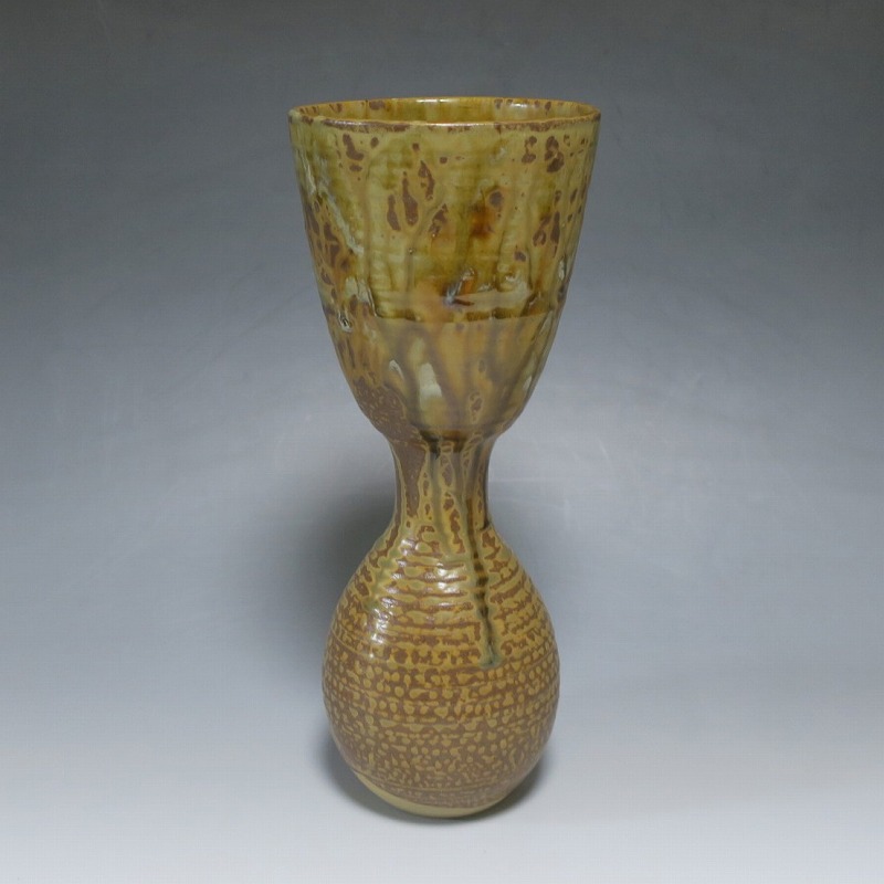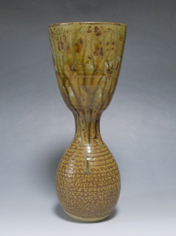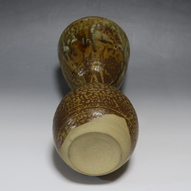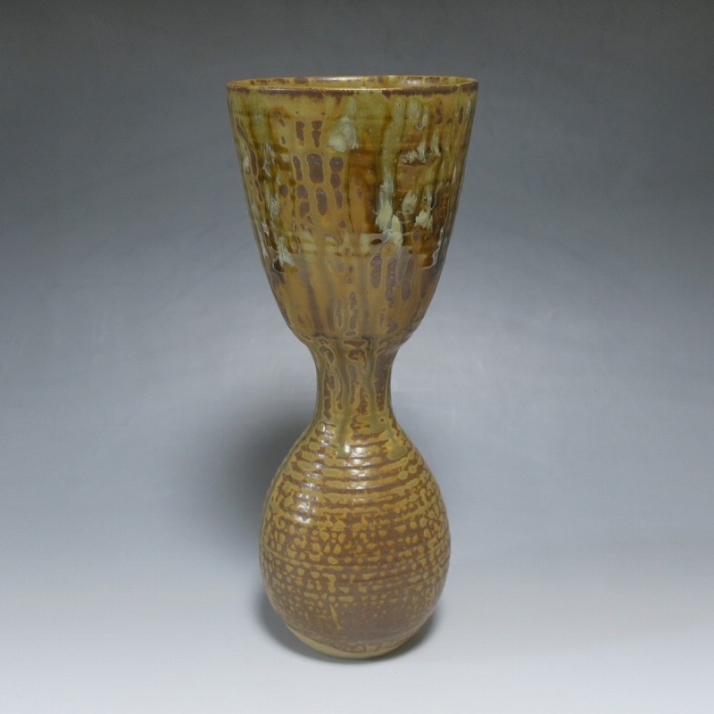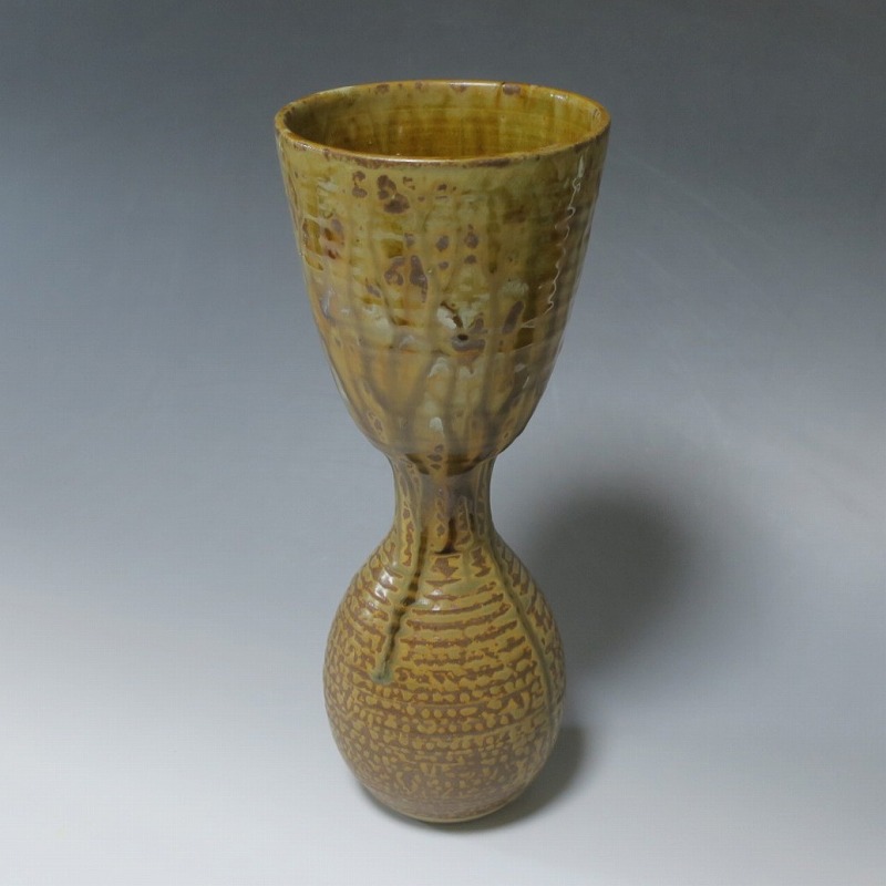 高さ 約29.3cm/口径 約12cm/高台径 約6cm 総じて良い状態です。状態は写真でご確認ください。 高取焼は17世紀後半、福岡藩3代・黒田光之の藩命によって開かれた窯です。初期は唐津焼に似た茶器を作っていましたが、元禄時代になると高取焼は本窯と小石原高取焼に別れ、独自の焼物を製作するようになりました。本品は昭和時代に作られた高取焼の花入れ。作風から十三代・高取八仙(1934年〜)の作品だと考えられます。表千家・即中斎(1901年〜1979年)の箱書きがあります。彫刻のような造形をしたモダンな花入れ。花器としてお楽しみください。 | ||