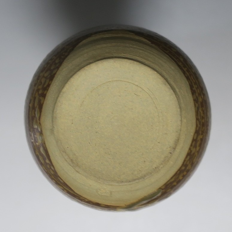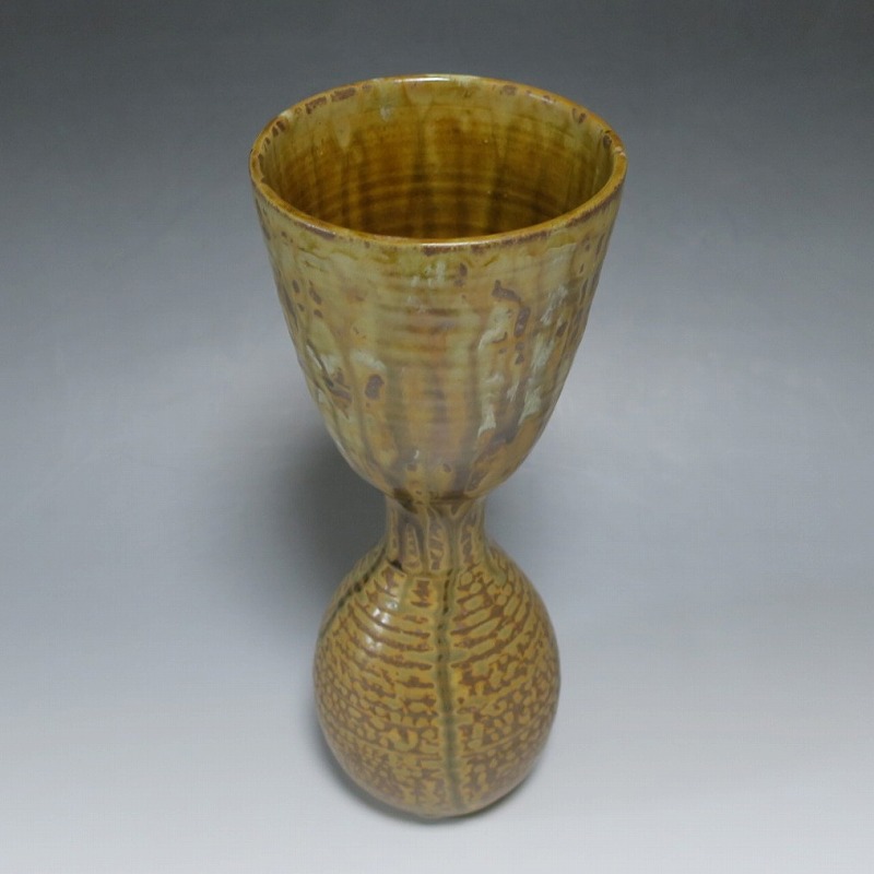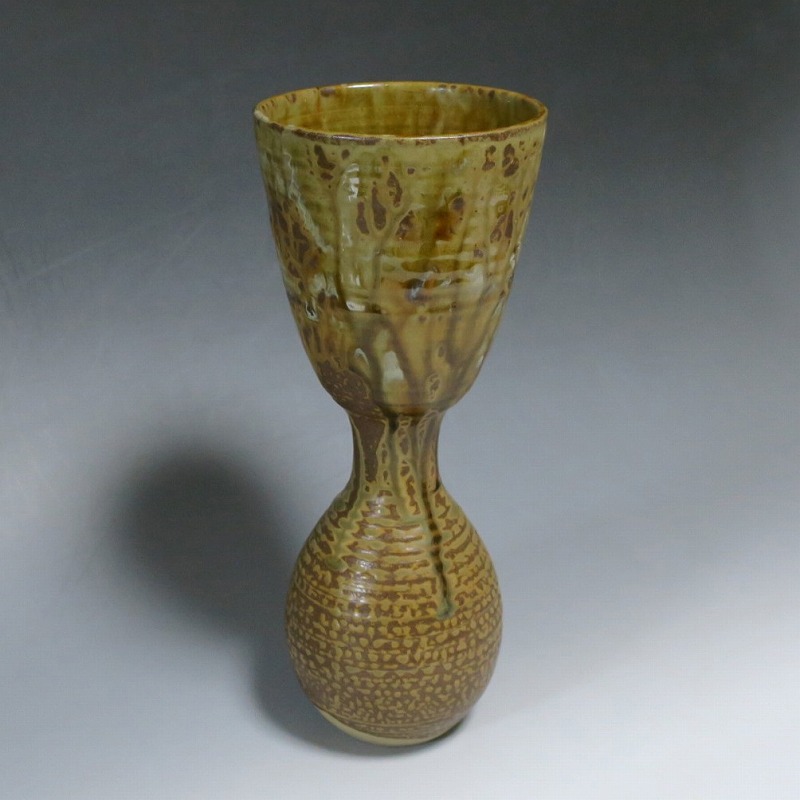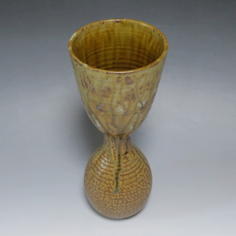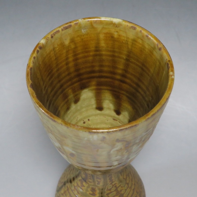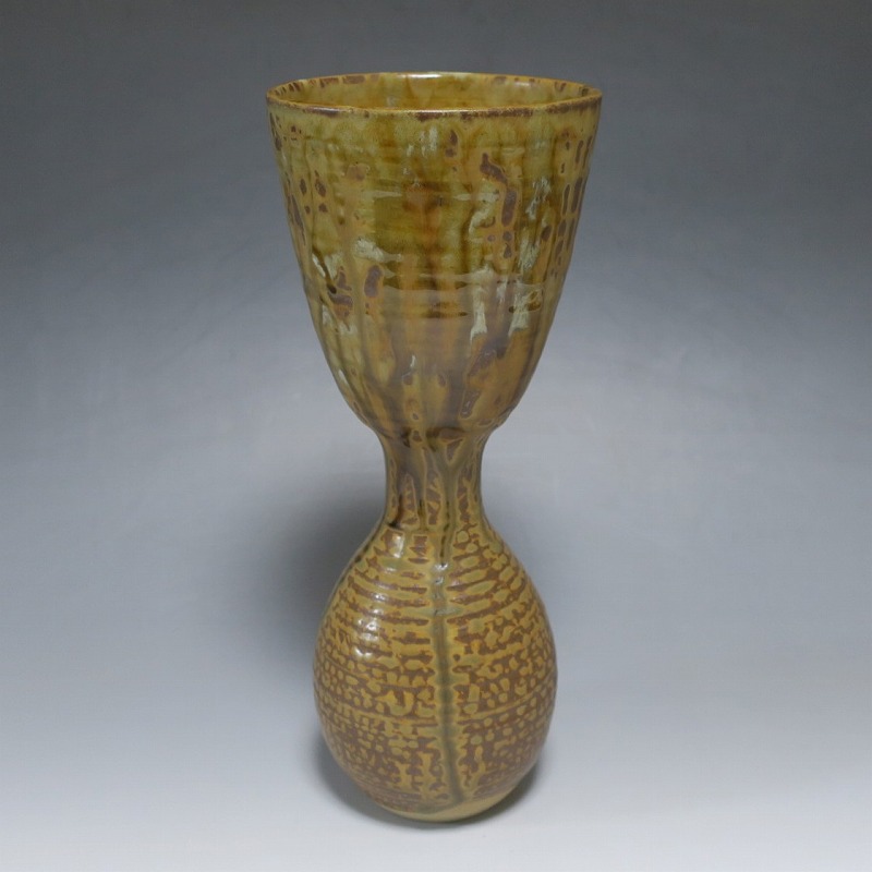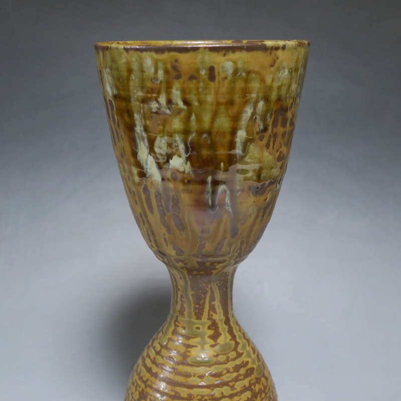 高さ 約29.3cm/口径 約12cm/高台径 約6cm 総じて良い状態です。状態は写真でご確認ください。 高取焼は17世紀後半、福岡藩3代・黒田光之の藩命によって開かれた窯です。初期は唐津焼に似た茶器を作っていましたが、元禄時代になると高取焼は本窯と小石原高取焼に別れ、独自の焼物を製作するようになりました。本品は昭和時代に作られた高取焼の花入れ。作風から十三代・高取八仙(1934年〜)の作品だと考えられます。表千家・即中斎(1901年〜1979年)の箱書きがあります。彫刻のような造形をしたモダンな花入れ。花器としてお楽しみください。 | ||