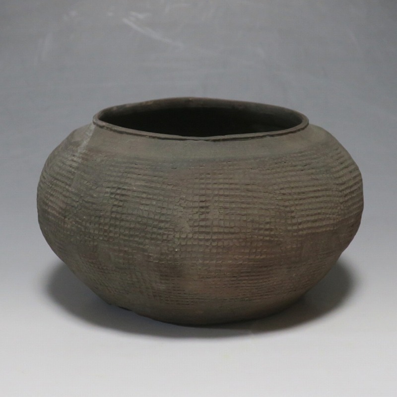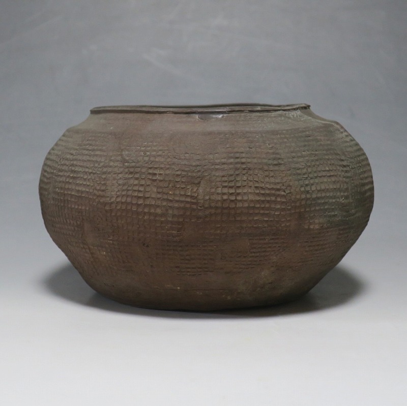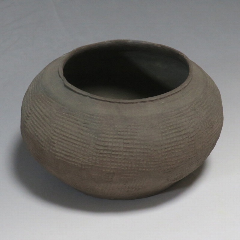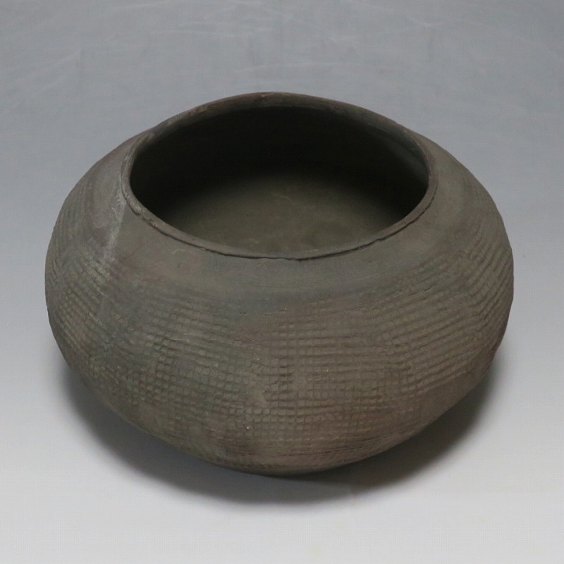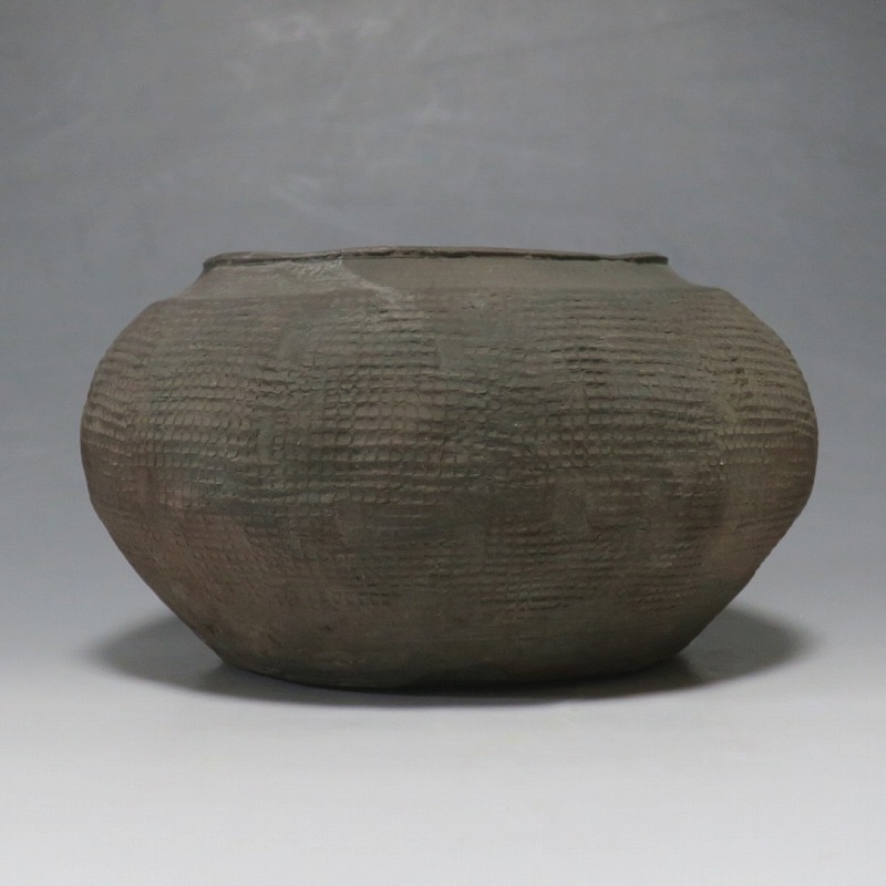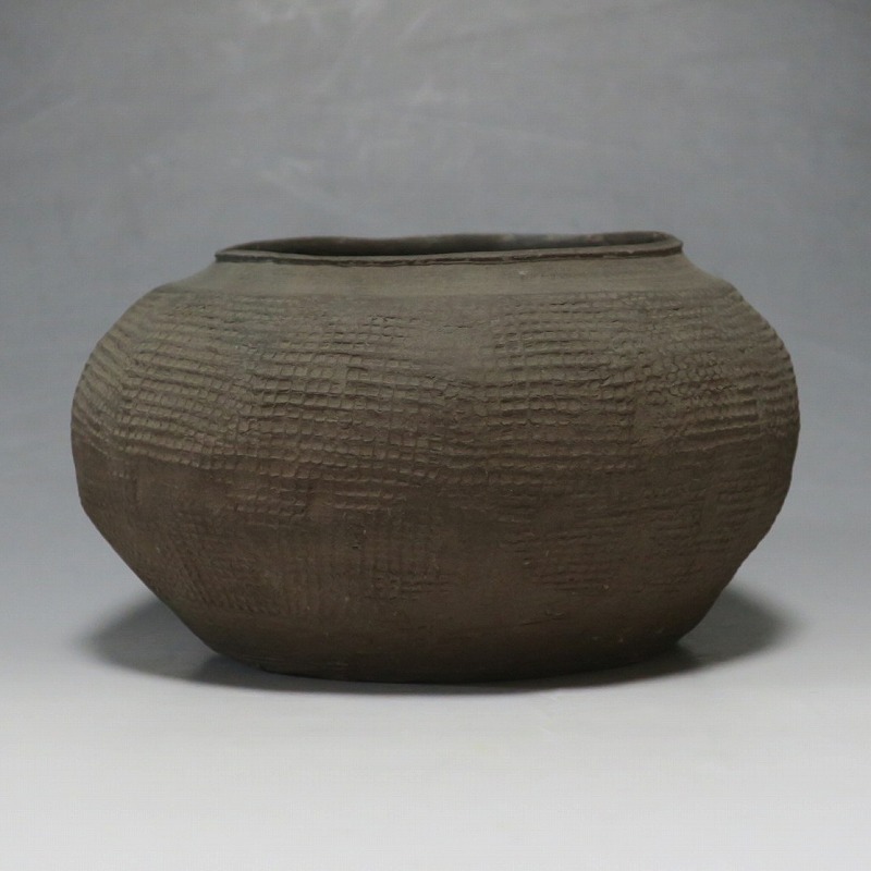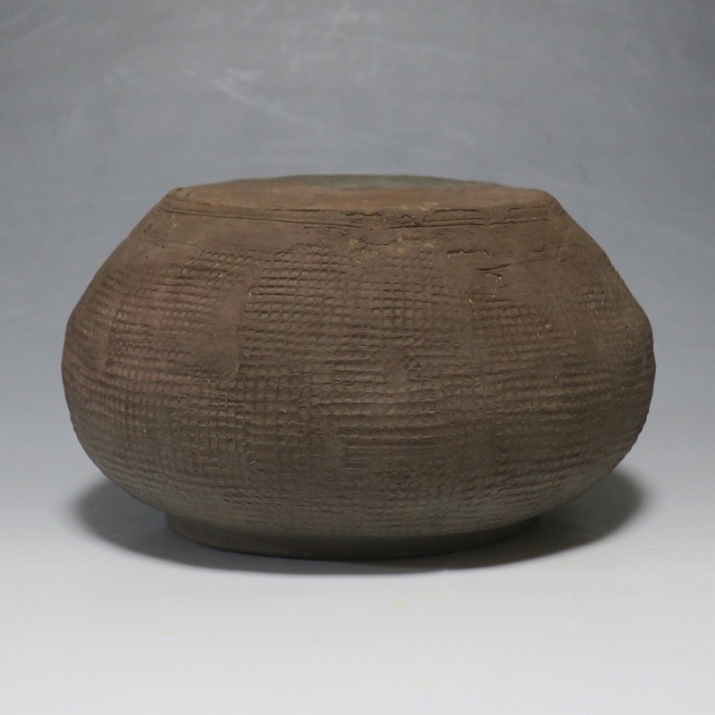 高さ 約8.5cm/胴径 約15.5cm 発掘品なので土が付着しており、口辺に約1.5p×7mmの直し、内側に若干の削げがあります。状態は写真でご確認ください。 中国では紀元前15世紀頃から瓷器(b器)が作られるようになります。 紀元前5世紀になると表面に装飾として印文が施された無釉の瓷器、備前焼のような焼締められた作品が出現しました。本品は前漢時代に製作された印文の小壺。胴部に叩き目のある作品です。小さいのですが古代の雰囲気を感じさせてくれます。観賞用、花器(落としを入れて)としてお楽しみください。 | ||