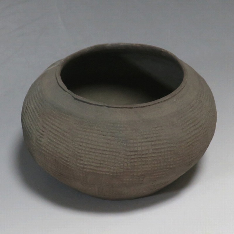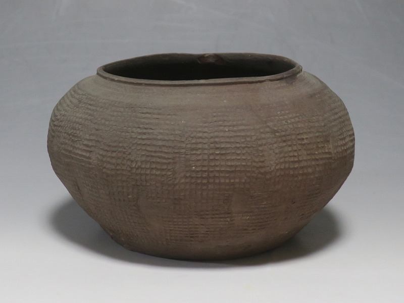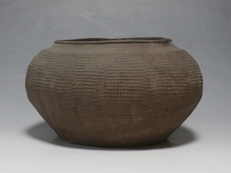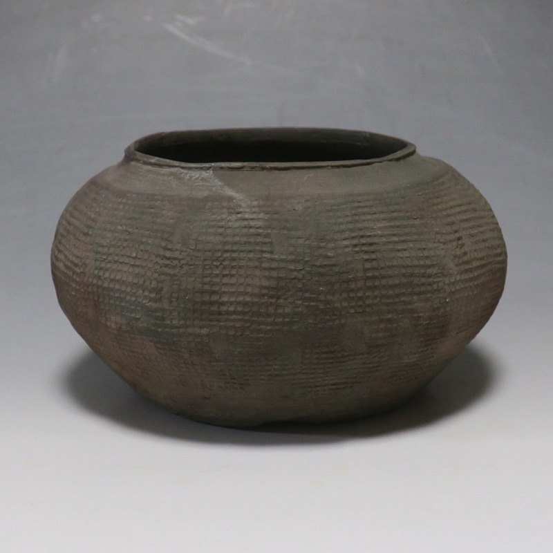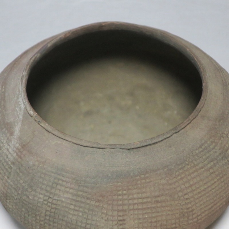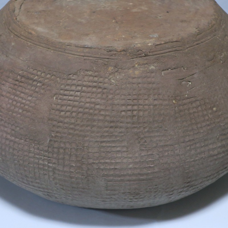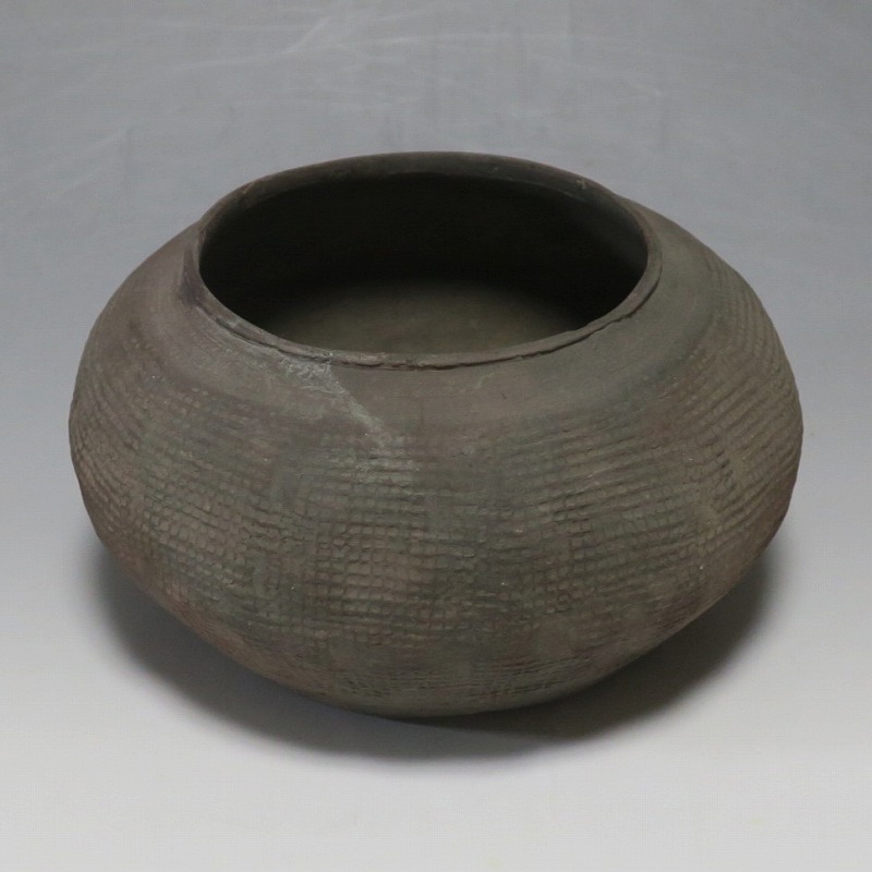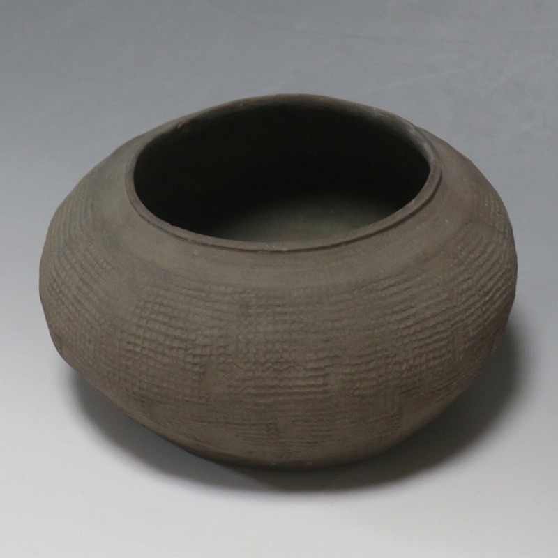 高さ 約8.5cm/胴径 約15.5cm 発掘品なので土が付着しており、口辺に約1.5p×7mmの直し、内側に若干の削げがあります。状態は写真でご確認ください。 中国では紀元前15世紀頃から瓷器(b器)が作られるようになります。 紀元前5世紀になると表面に装飾として印文が施された無釉の瓷器、備前焼のような焼締められた作品が出現しました。本品は前漢時代に製作された印文の小壺。胴部に叩き目のある作品です。小さいのですが古代の雰囲気を感じさせてくれます。観賞用、花器(落としを入れて)としてお楽しみください。 | ||