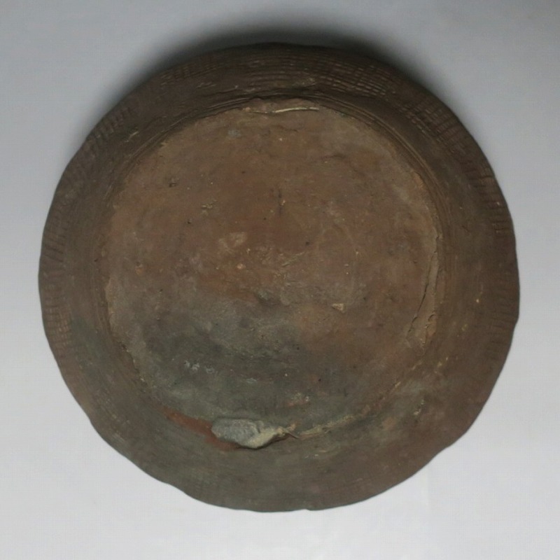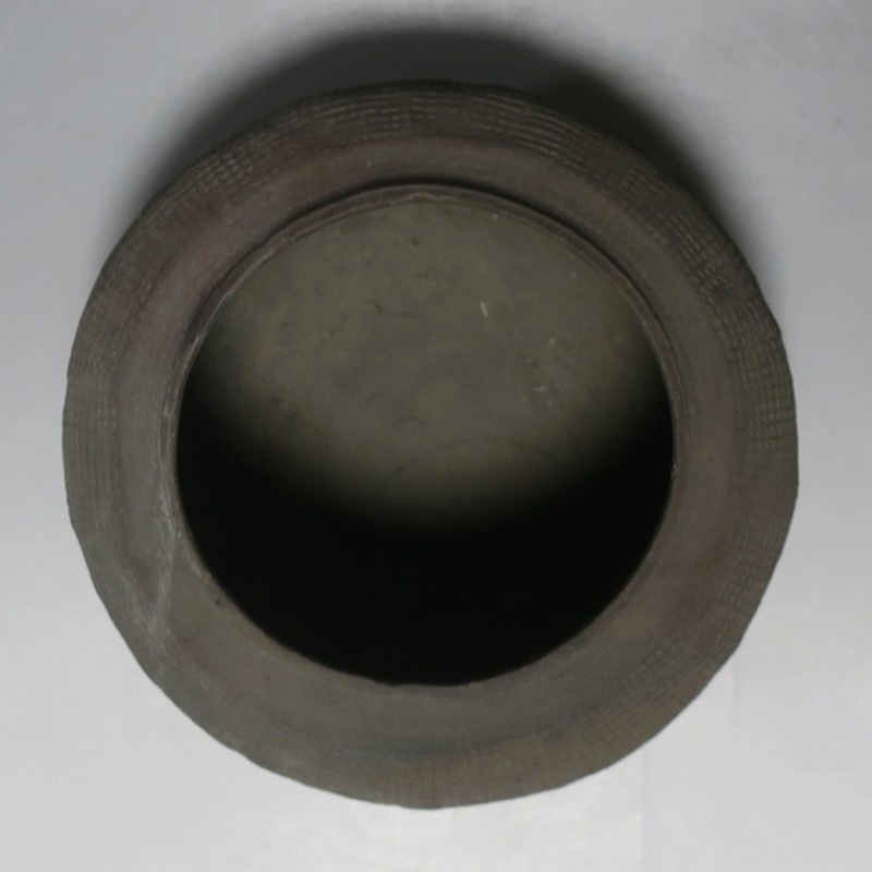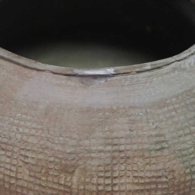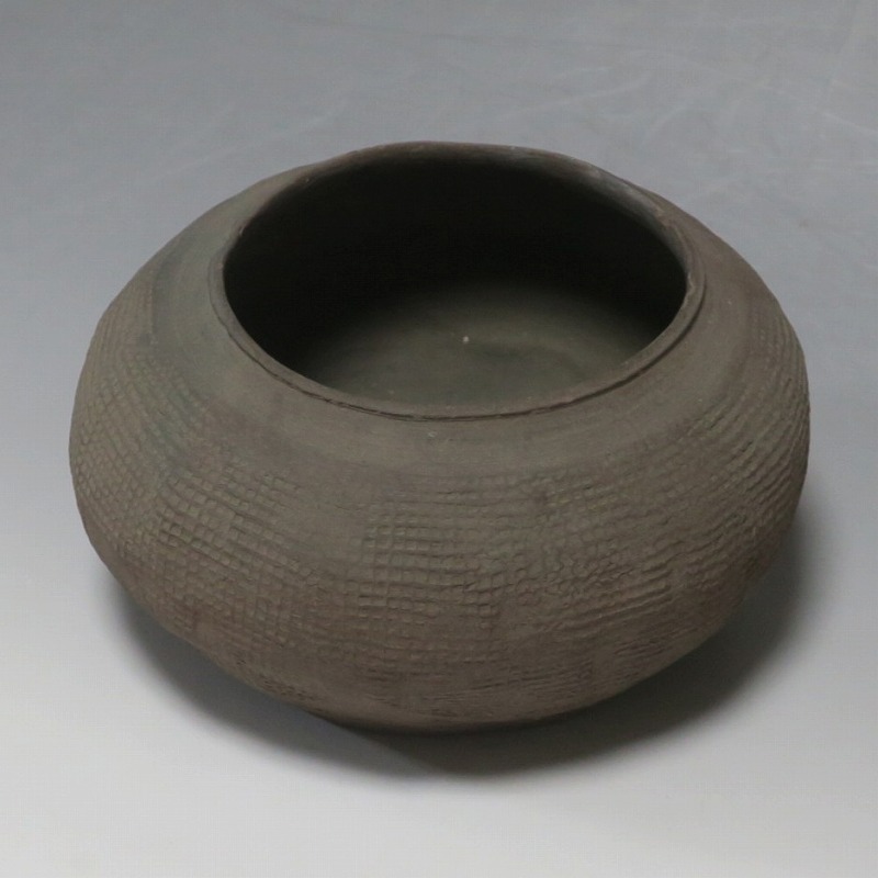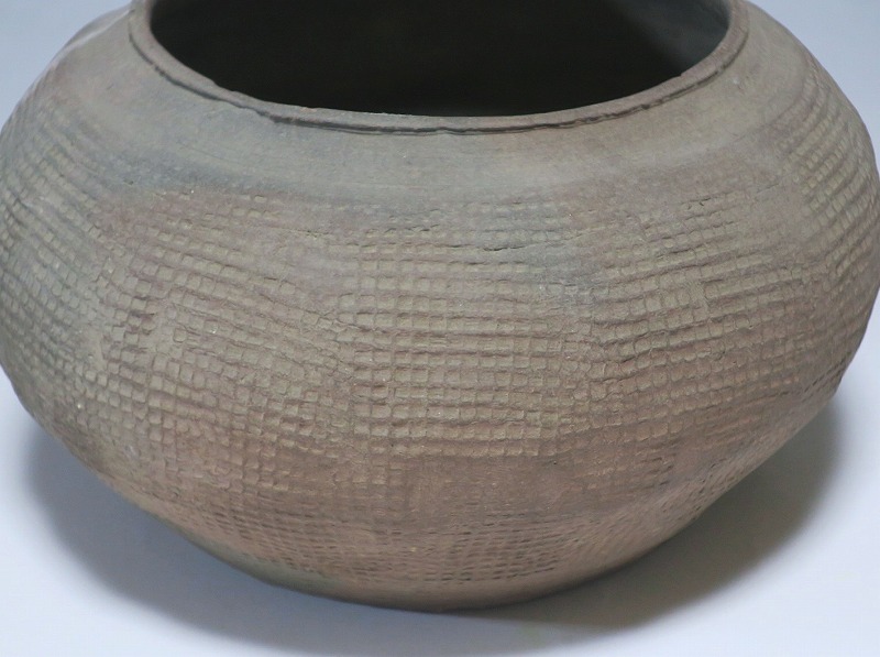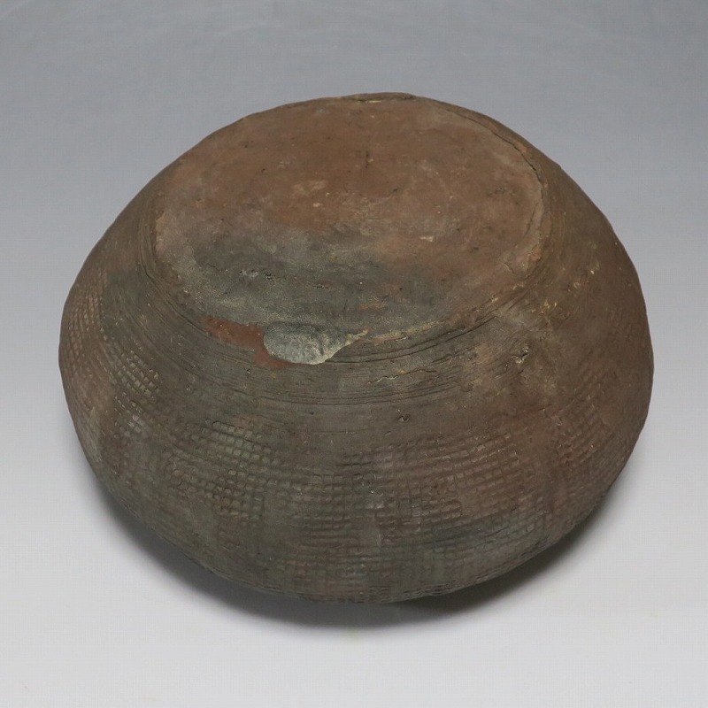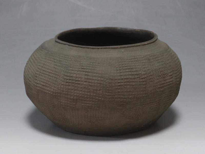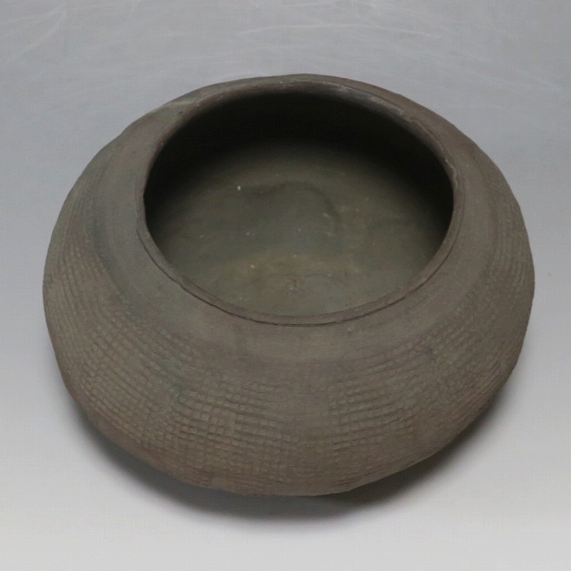 高さ 約8.5cm/胴径 約15.5cm 発掘品なので土が付着しており、口辺に約1.5p×7mmの直し、内側に若干の削げがあります。状態は写真でご確認ください。 中国では紀元前15世紀頃から瓷器(b器)が作られるようになります。 紀元前5世紀になると表面に装飾として印文が施された無釉の瓷器、備前焼のような焼締められた作品が出現しました。本品は前漢時代に製作された印文の小壺。胴部に叩き目のある作品です。小さいのですが古代の雰囲気を感じさせてくれます。観賞用、花器(落としを入れて)としてお楽しみください。 | ||