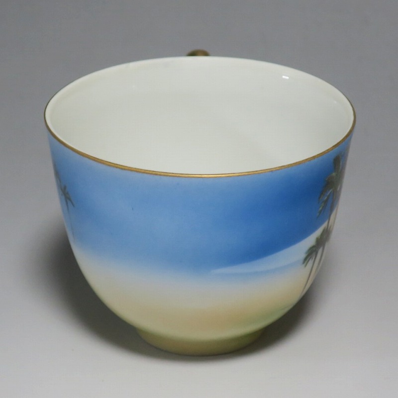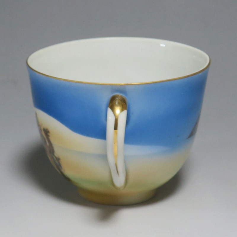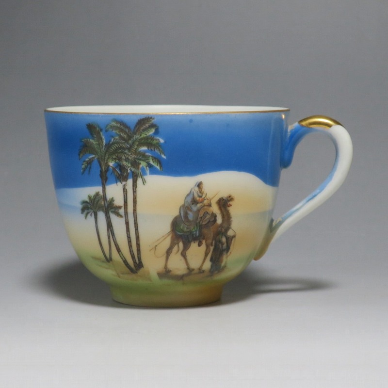 カップ 口径 約8cm/高さ 約6.4cm/高台径 約3.7cm 窯傷はありますが、総じて良い状態です。状態は写真でご確認ください。 オールドニッポンは明治、大正期に欧米へ輸出された輸出専用の日本陶磁器の総称です。オールドニッポンにはノリタケをはじめ薩摩焼、名古屋陶器など様々な会社が含まれています。それらの作品は一流の陶工、絵付師によって製作されたので海外で人気を博しました。本品はオールドノリタケ作品で有名になったマンオンキャメルのトリオ。オリエンタルな作品です。当時、欧米では中東や古代文化への関心が高まっていました。ノリタケのマンオンキャメルとは少し雰囲気の違う作品。本品でコーヒーと召し上がってください。 | ||