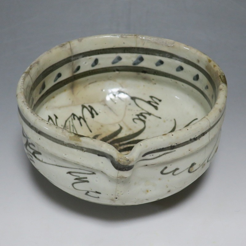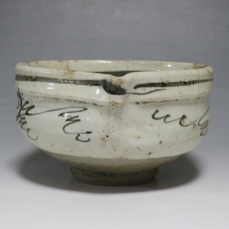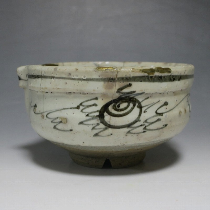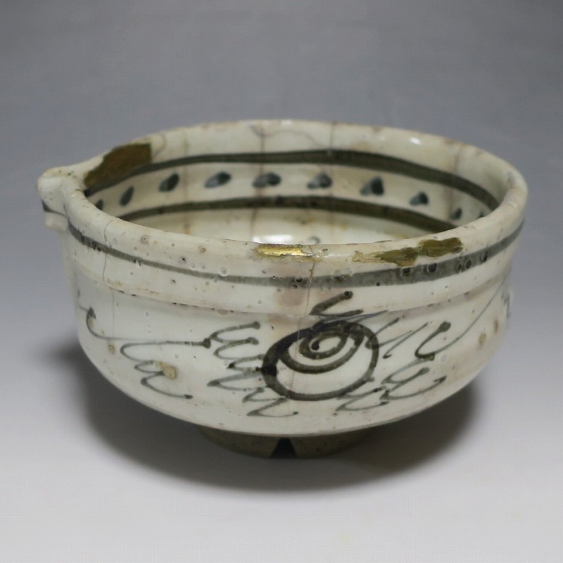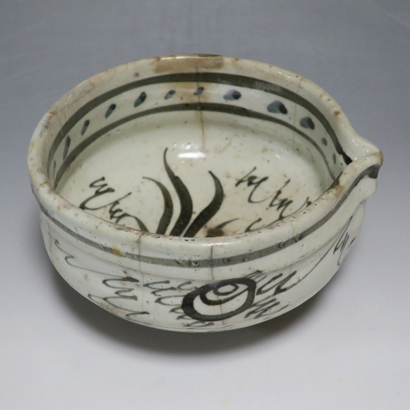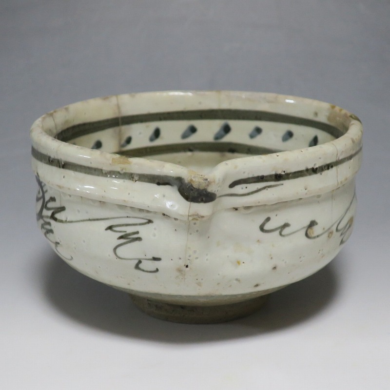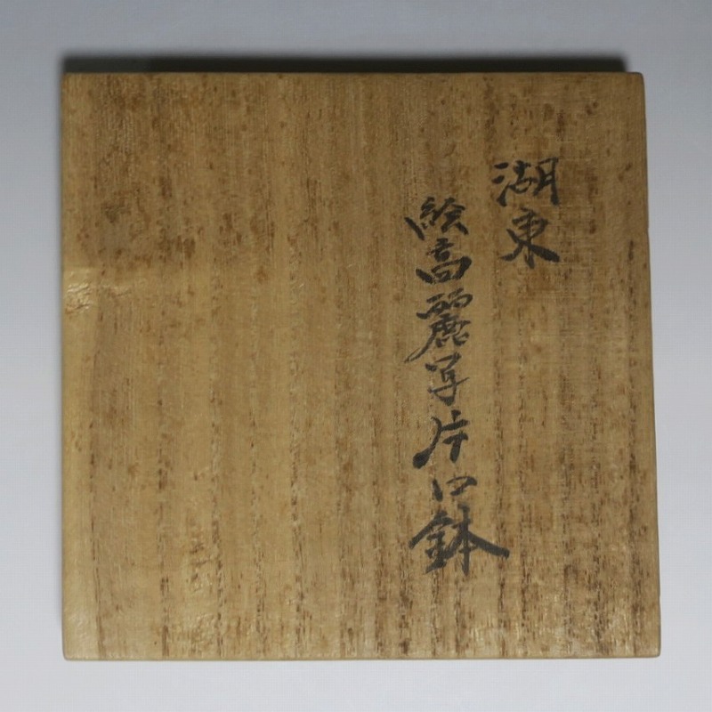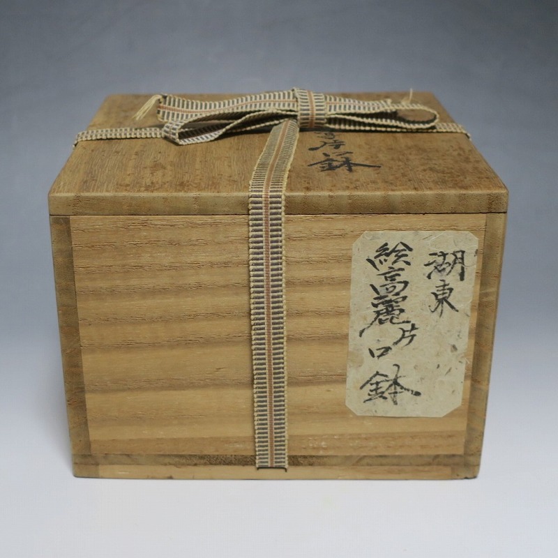 (江戸時代後期 19世紀中頃) 商品番号 4160 口径 約14.5〜15.6cm/高さ 約8.6cm/高台径 約6.5cm 口辺に1〜3.5の直しが8カ所、複数のニュウ、見込みの目跡や窯傷に直しがあります。状態は写真でご確認ください。 湖東焼は1829年(文政12年)、彦根城下に開かれた窯です。当初は事業も苦難続きでしたが、彦根藩の庇護を受け、秀作を生産するようになり、井伊直弼の時代に最高期を迎えます。 本品は19世紀中頃に作られた鉄絵鳳凰文の片口の鉢。高台近くに「湖東」の印が入っています。湖東焼は磁器が有名ですが、本品は磁器製作をする以前に作られた作品です。磁器作品に比べると陶器作品は市場に出てきません。出会うことの少ない貴重品です。料理を盛って時代の雰囲気を味わうことができるでしょう。 | ||