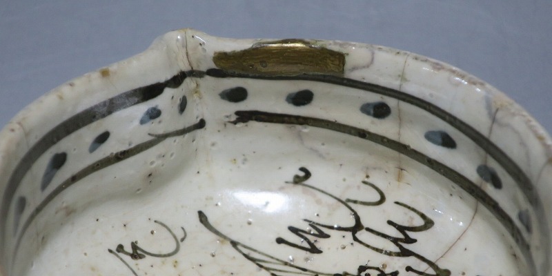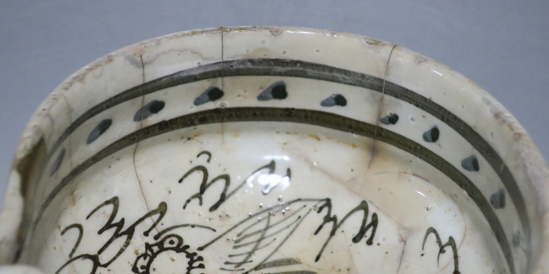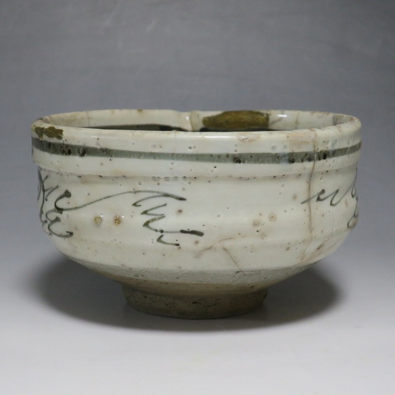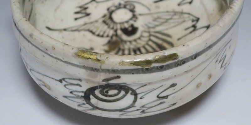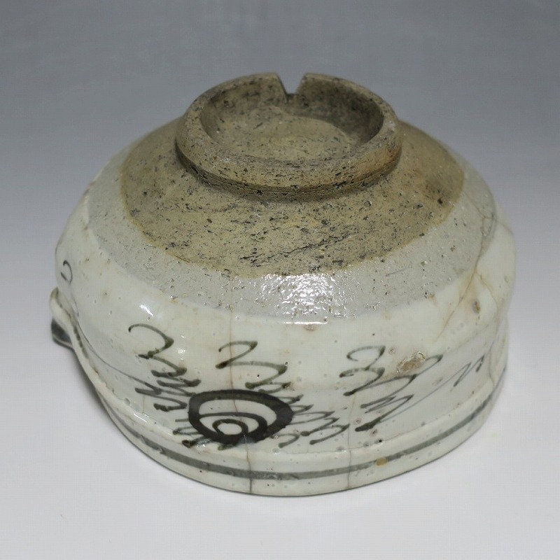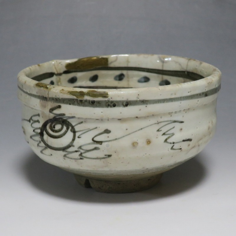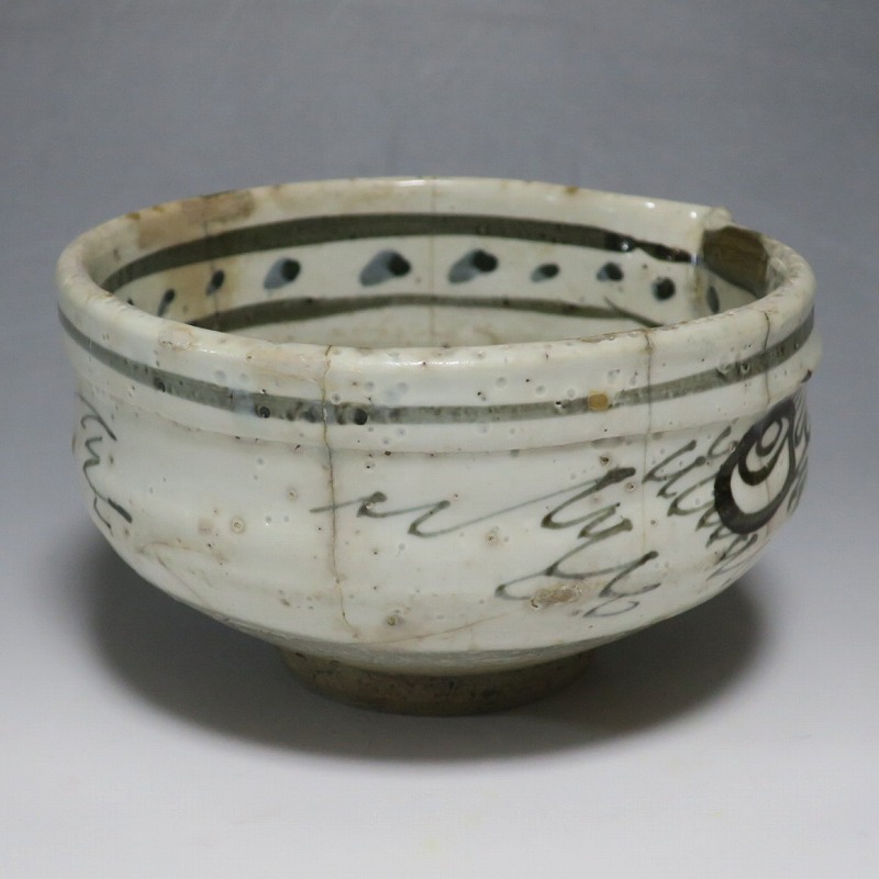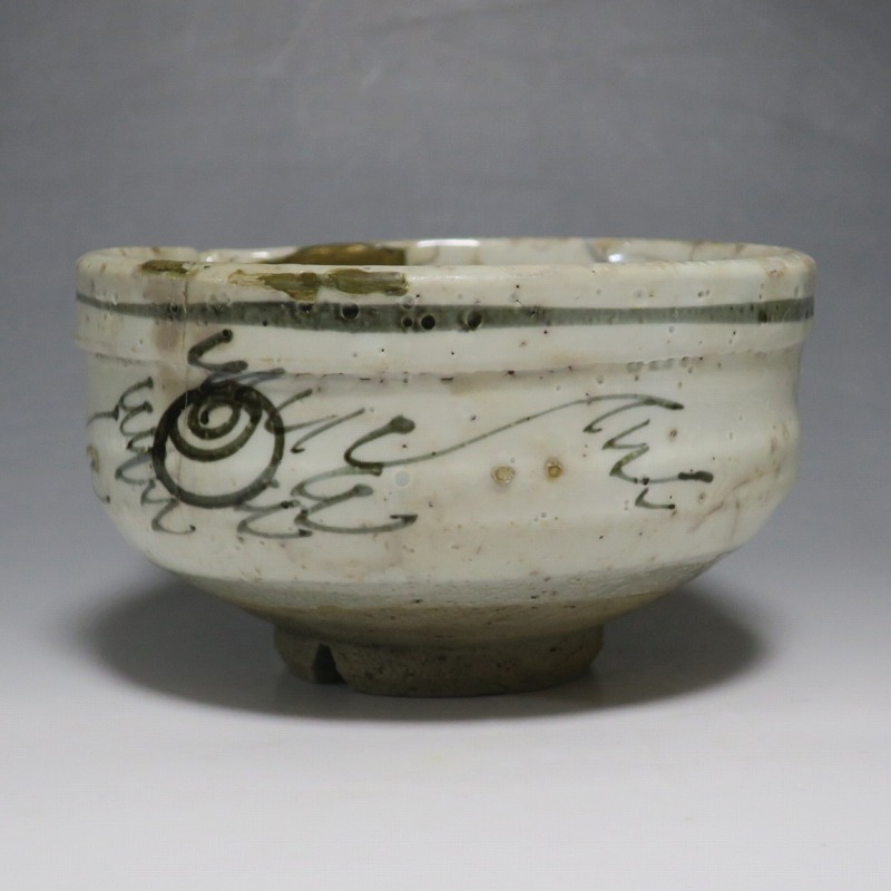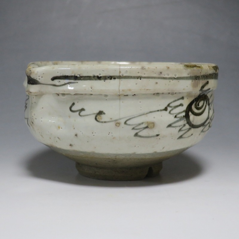 (江戸時代後期 19世紀中頃) 商品番号 4160 口径 約14.5〜15.6cm/高さ 約8.6cm/高台径 約6.5cm 口辺に1〜3.5の直しが8カ所、複数のニュウ、見込みの目跡や窯傷に直しがあります。状態は写真でご確認ください。 湖東焼は1829年(文政12年)、彦根城下に開かれた窯です。当初は事業も苦難続きでしたが、彦根藩の庇護を受け、秀作を生産するようになり、井伊直弼の時代に最高期を迎えます。 本品は19世紀中頃に作られた鉄絵鳳凰文の片口の鉢。高台近くに「湖東」の印が入っています。湖東焼は磁器が有名ですが、本品は磁器製作をする以前に作られた作品です。磁器作品に比べると陶器作品は市場に出てきません。出会うことの少ない貴重品です。料理を盛って時代の雰囲気を味わうことができるでしょう。 | ||
