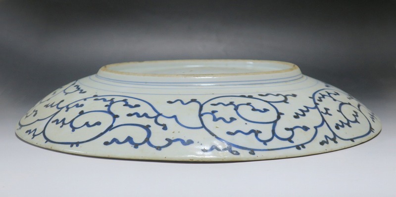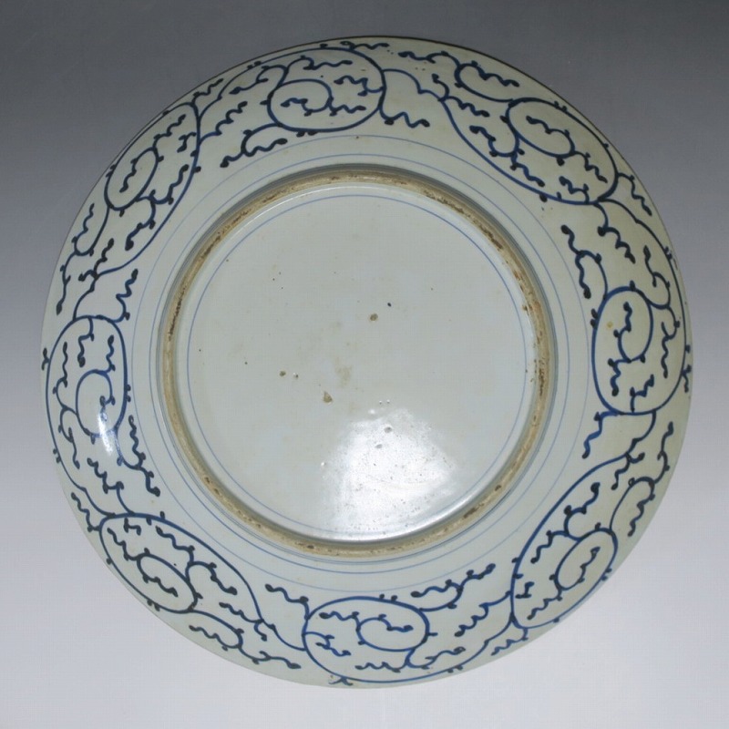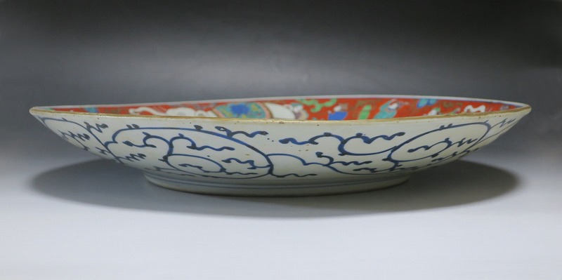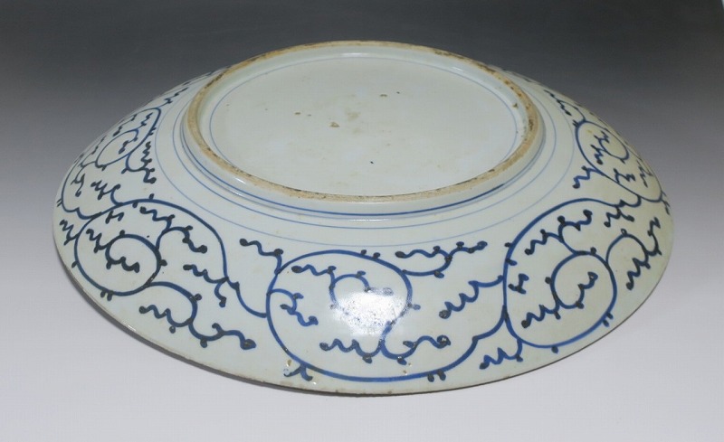 口径 約46cm/高さ 約7cm 窯傷はありますが、総じて良い状態です。状態は写真でご確認ください。 19世紀中頃になると長崎のオランダ人商人から有田へ磁器製品の注文が入ります。有田の商人はその注文を受け、輸出用の磁器の生産を職人に依頼しました。本品は江戸時代後期に作られた色絵の韃靼人と白象文大皿。細かな筆使いで中国人やベトナム人や象、コウモリ模様が描かれた作品です。徳川吉宗の時代に象が来日した時の資料を元にデザインしたのでしょう。伊藤若冲の象の作品を見ているような迫力のある美術品です。 | ||