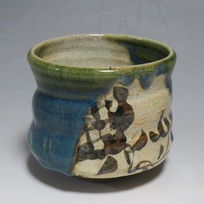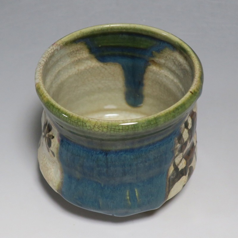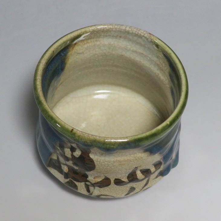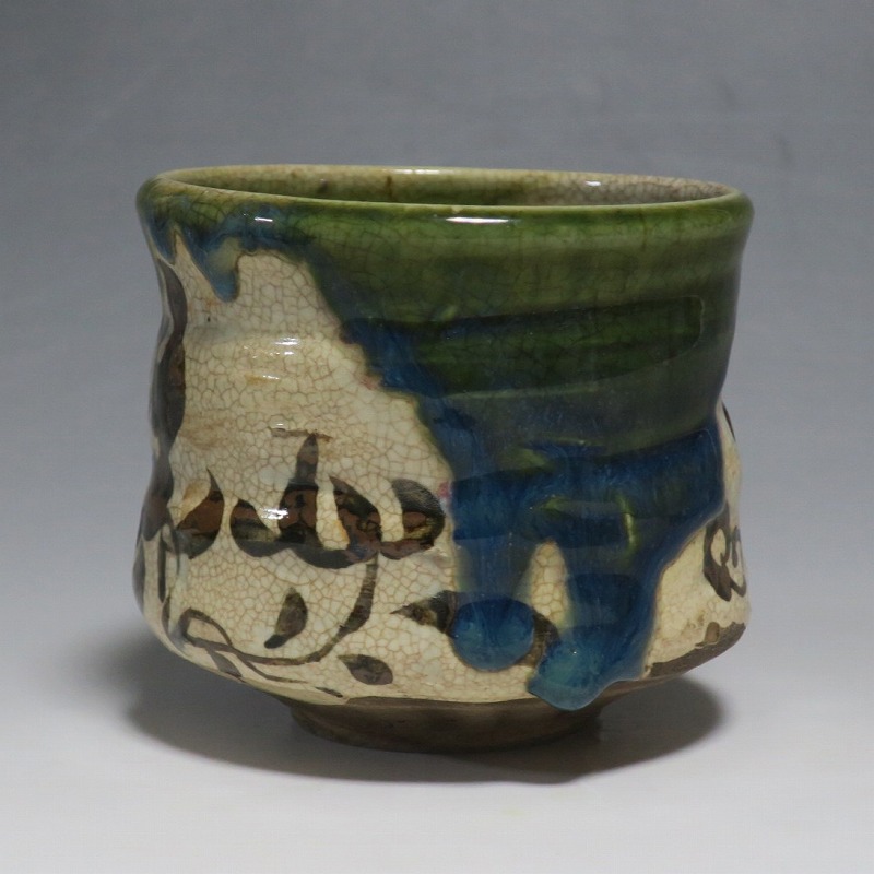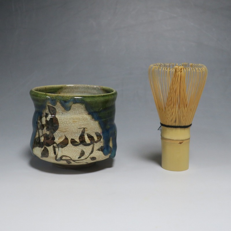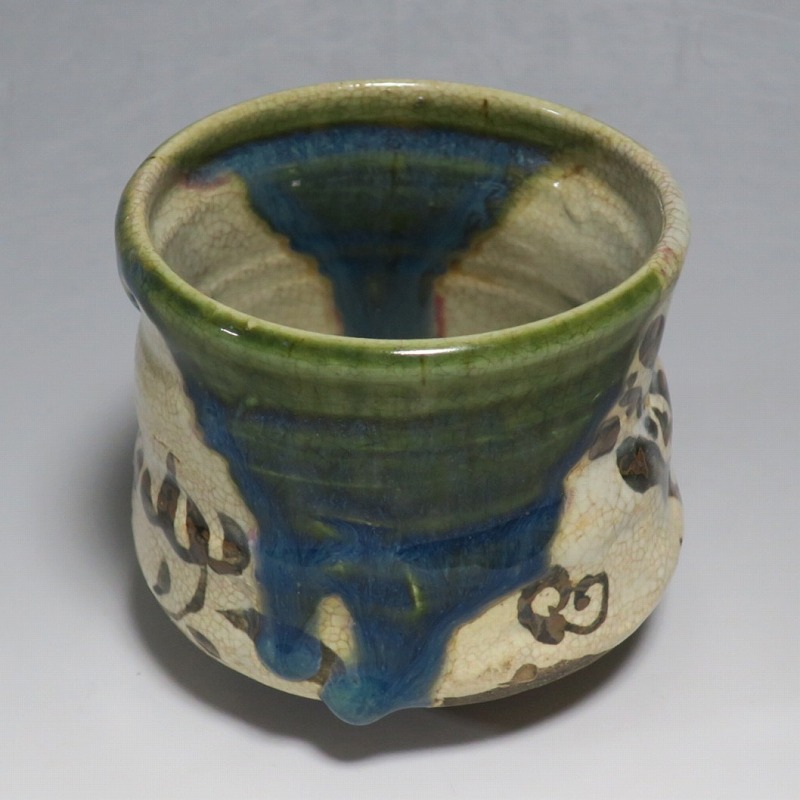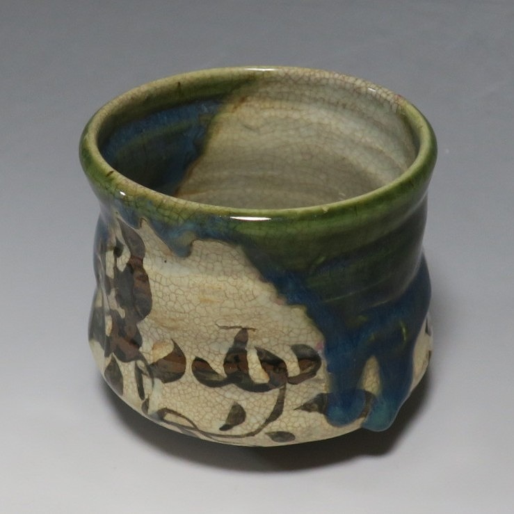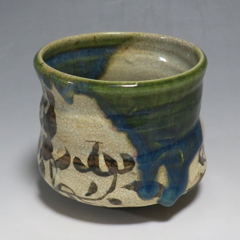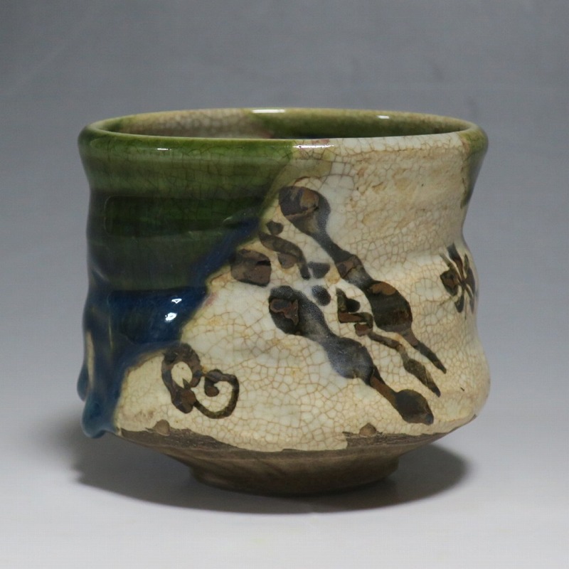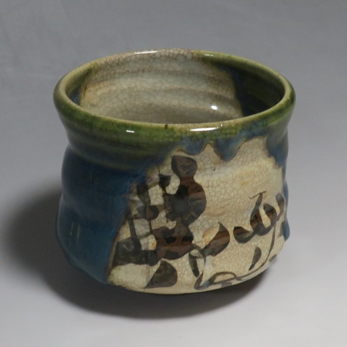 口径 約9.3cm/高さ 約8.3cm/高台径 約4.8cm 窯傷はありますが、総じて良い状態です。状態は写真でご確認ください。 織部焼は桃山時代、武将の古田織部の好みによってデザインされた美濃産の焼物です。歪みや独特の絵付けの面白さで一世を風靡しました。江戸時代前期に織部焼はすたれますが、18世紀後半になり再生産が始まると様々な作品が製作され人気を取り戻しました。本品は大正時代に作られた美濃焼織部の緑釉、鉄釉の小服茶碗。緑釉と鉄釉の模様がデザインされた作品です。鉄絵と緑釉の流れの対比が景色となっています。湯呑の他、お湯割りの酒器、向付として使用できます。 | ||
