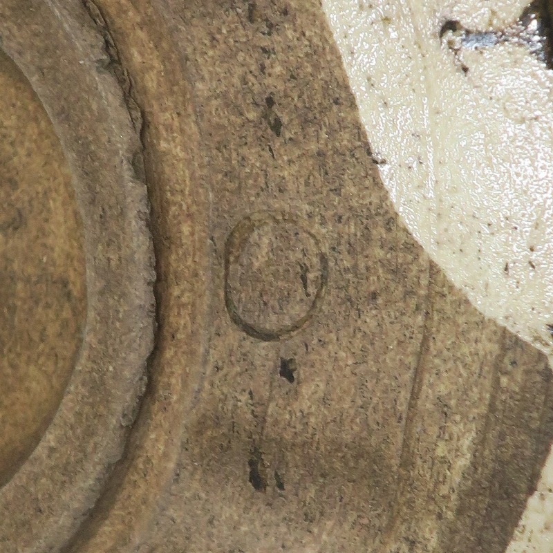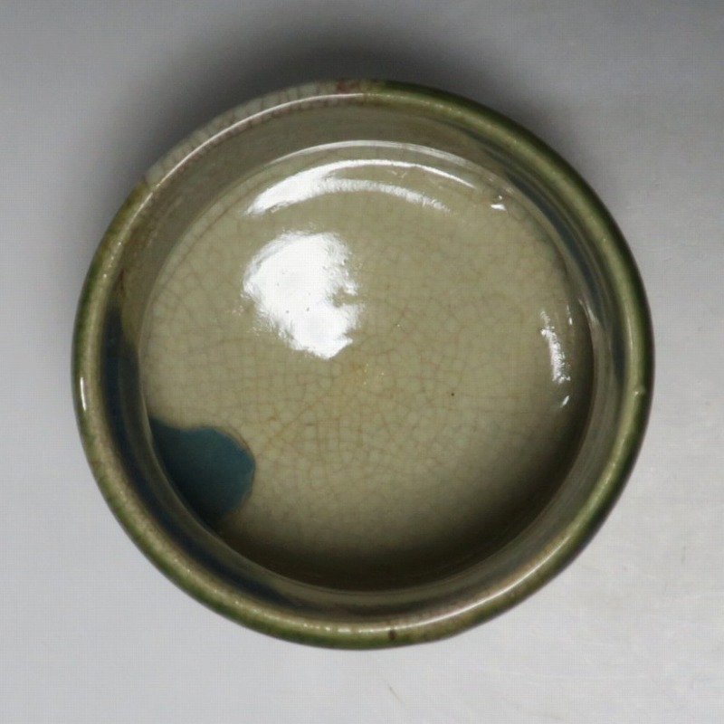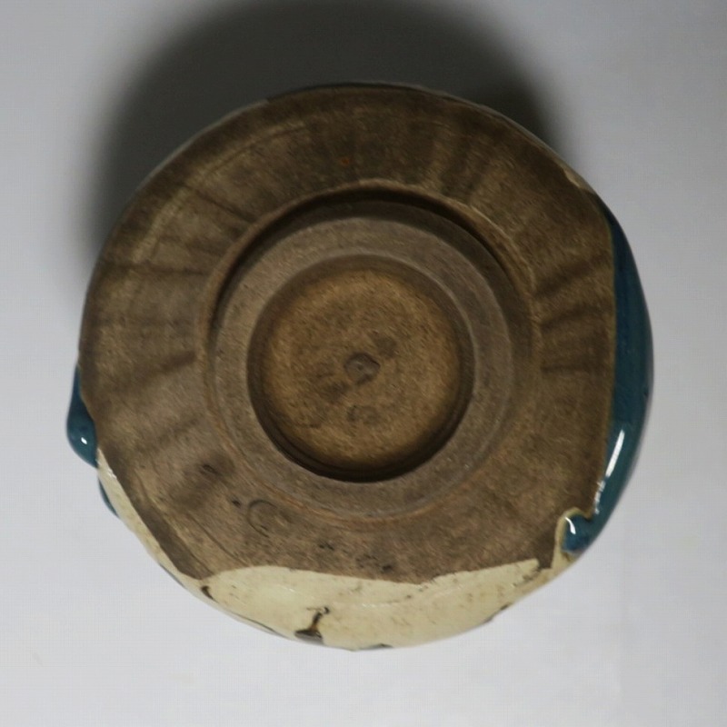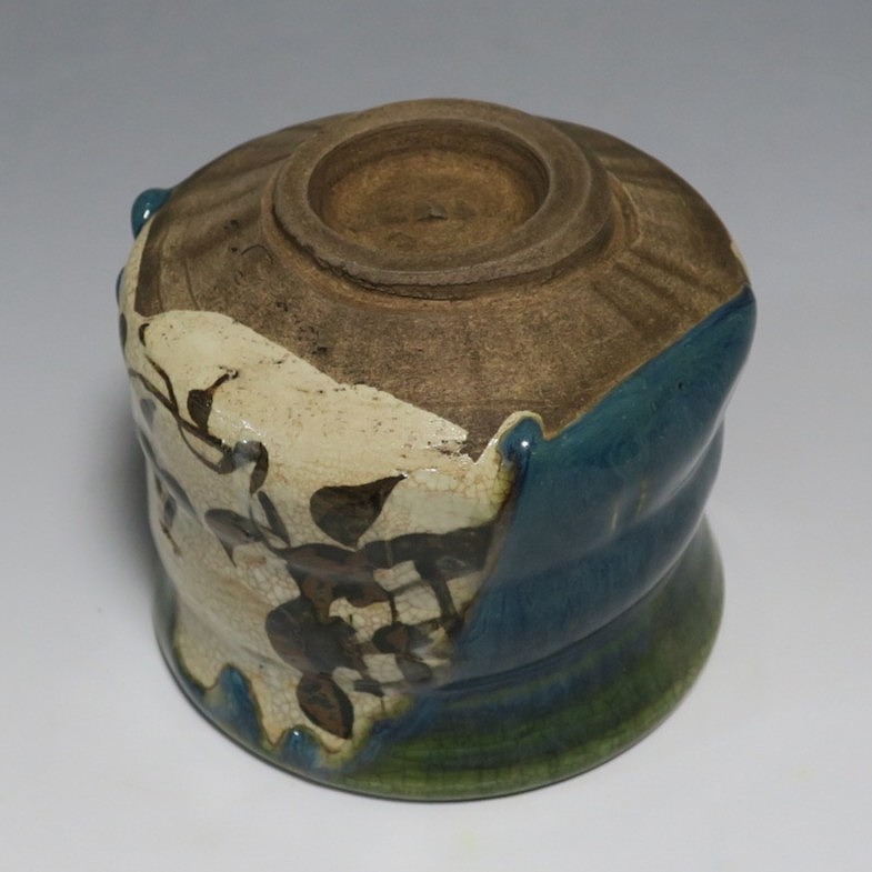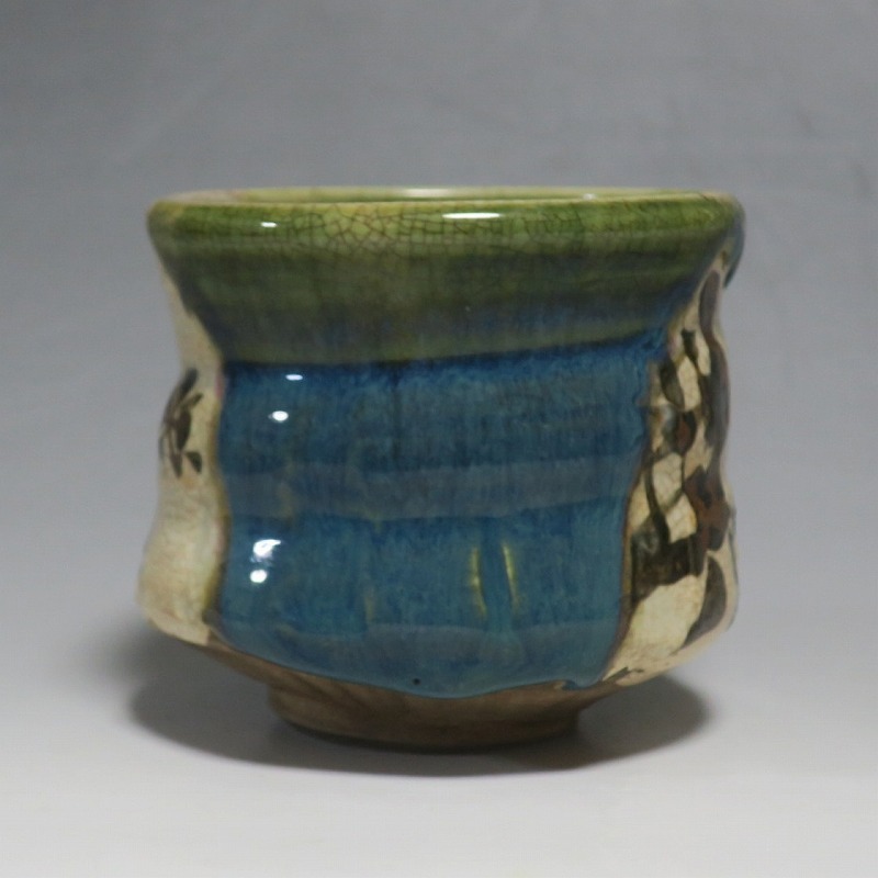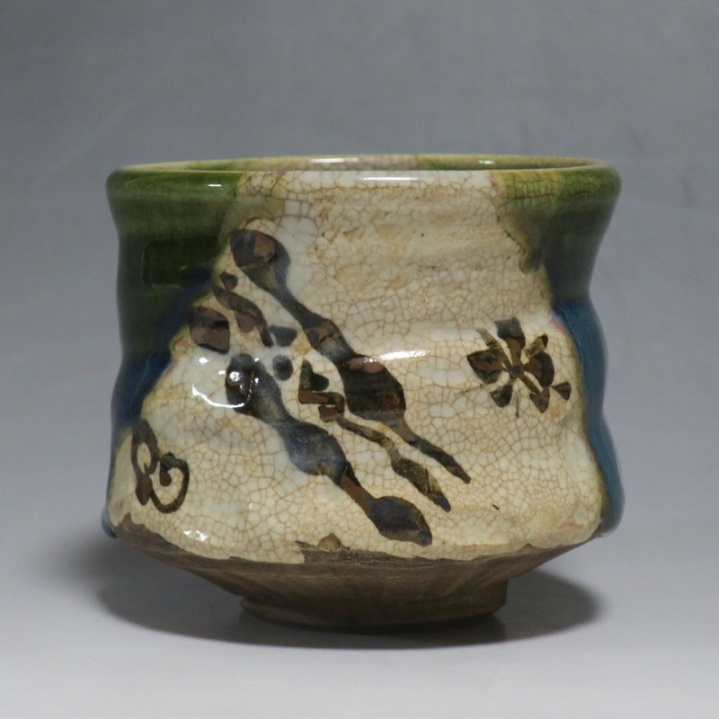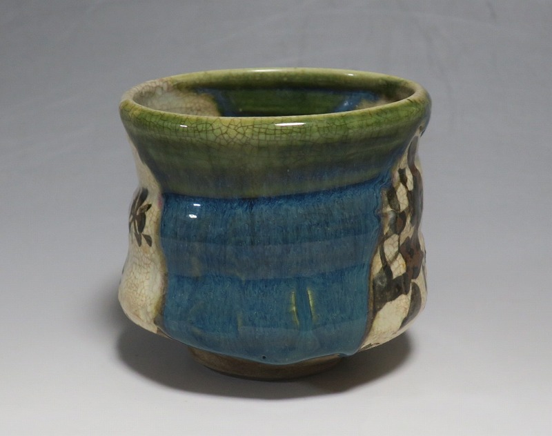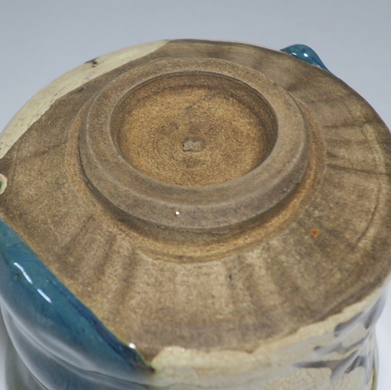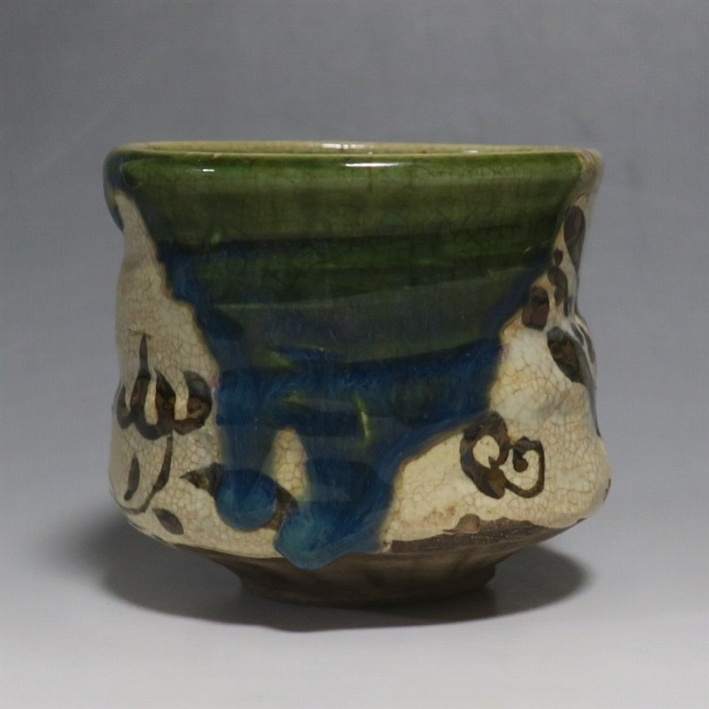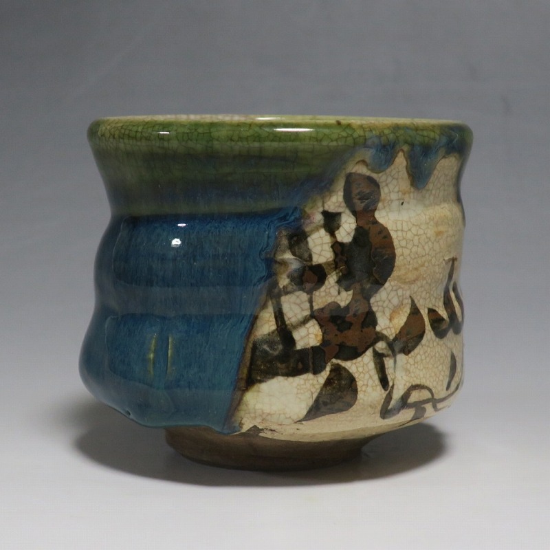 口径 約9.3cm/高さ 約8.3cm/高台径 約4.8cm 窯傷はありますが、総じて良い状態です。状態は写真でご確認ください。 織部焼は桃山時代、武将の古田織部の好みによってデザインされた美濃産の焼物です。歪みや独特の絵付けの面白さで一世を風靡しました。江戸時代前期に織部焼はすたれますが、18世紀後半になり再生産が始まると様々な作品が製作され人気を取り戻しました。本品は大正時代に作られた美濃焼織部の緑釉、鉄釉の小服茶碗。緑釉と鉄釉の模様がデザインされた作品です。鉄絵と緑釉の流れの対比が景色となっています。湯呑の他、お湯割りの酒器、向付として使用できます。 | ||