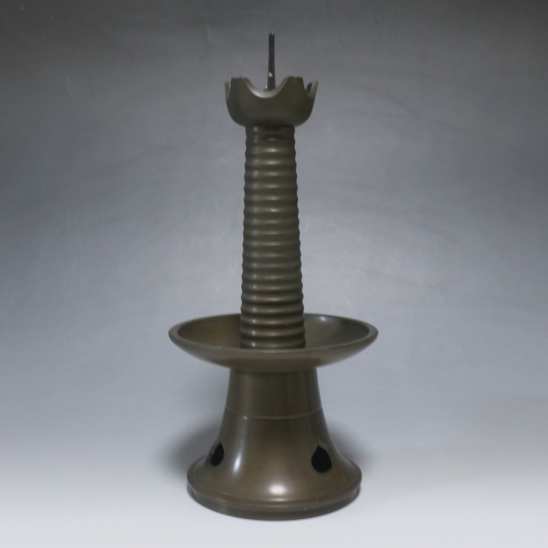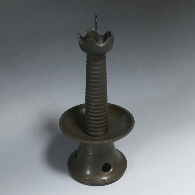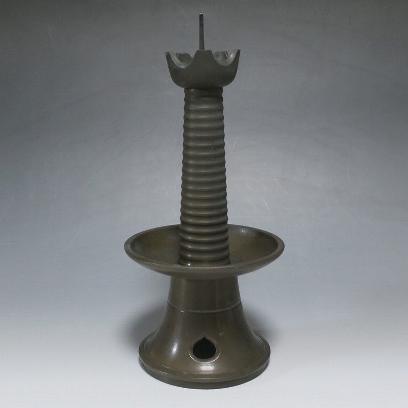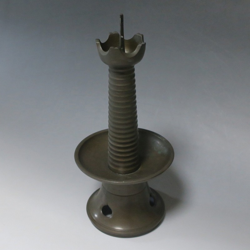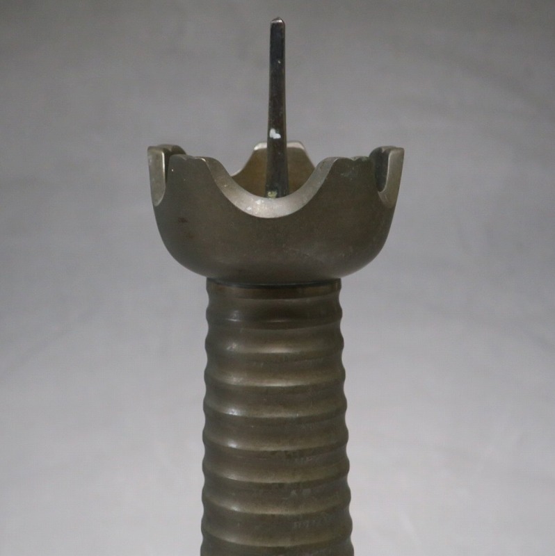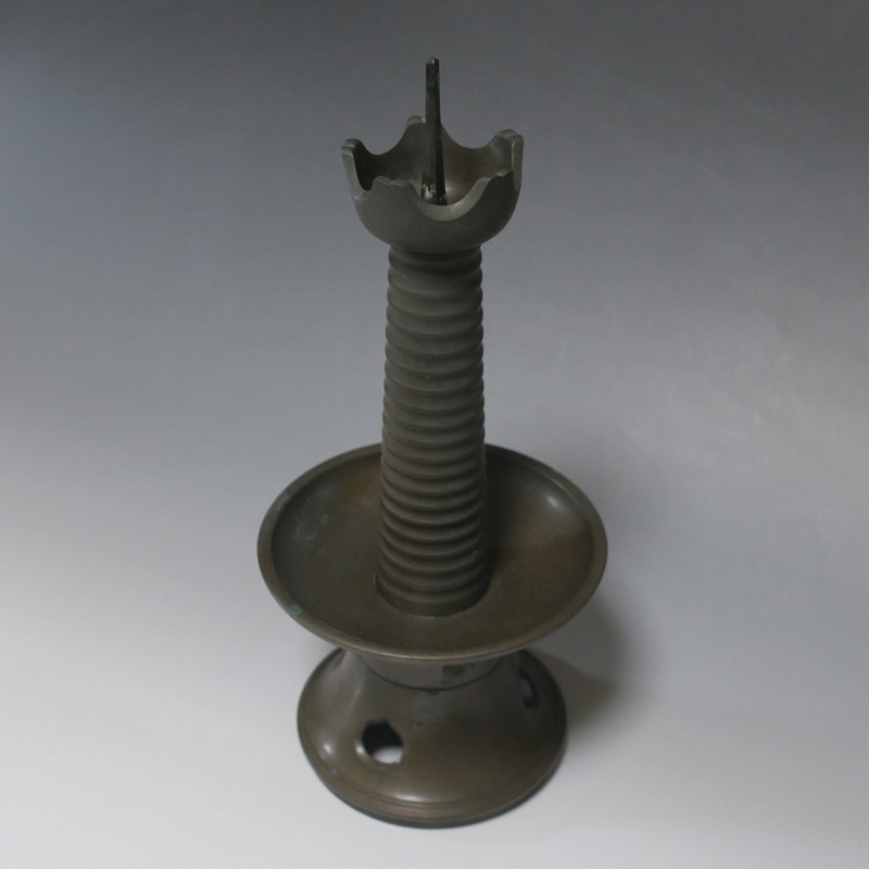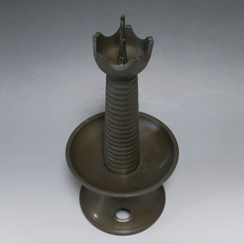 高さ 約31cm/横幅 約14cm 経年の傷みや錆がありますが、総じて良い状態です。状態は写真でご確認ください。 中川家は、京都で活動する千家十職の一人で金物師です。桃山時代、千利休の依頼・指導によって薬燗を作って以降、茶道具作りに専念しました。本品は「中川家中興の祖」と仰がれている7代中川浄益(1796年〜1859年、京都生まれ)が製作した銅製の灯火器。江戸時代に製作されたモダンな作品です。表千家9代・了々斎(1775年〜1825年)が好んだ形の燭台です。灯火器の他、インテリアとしても楽しむことができます。 | ||