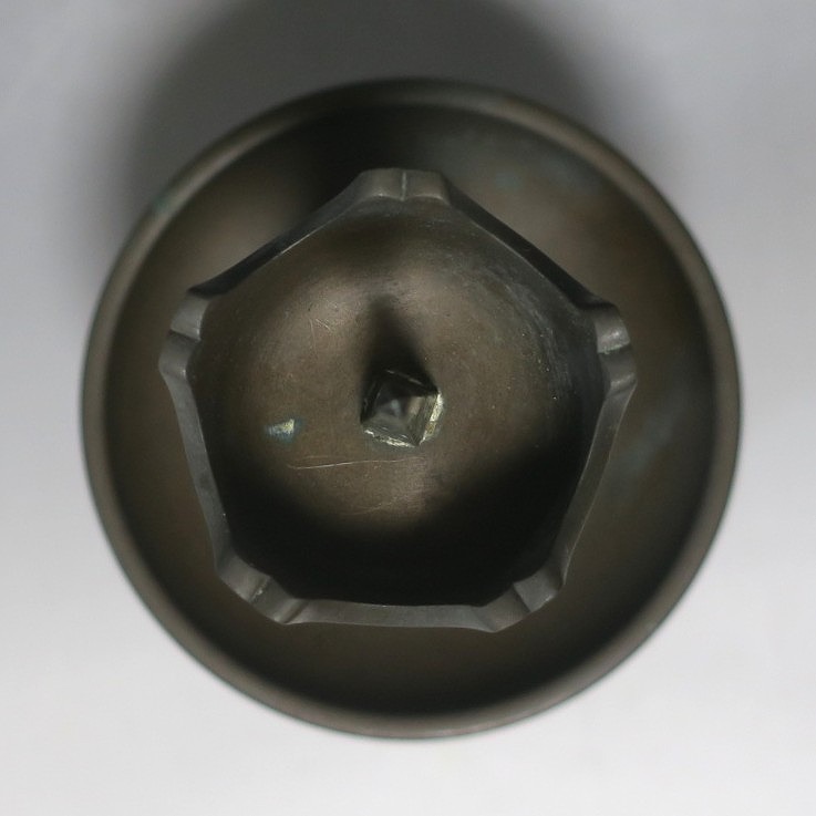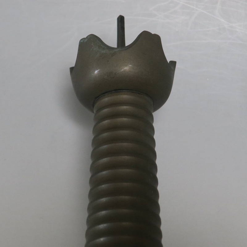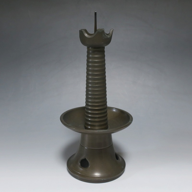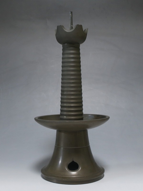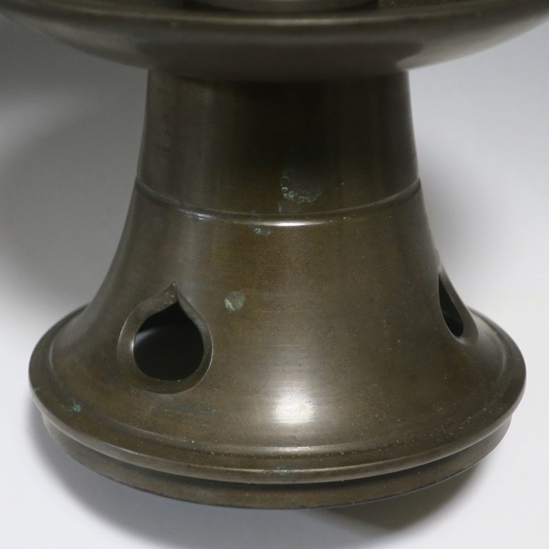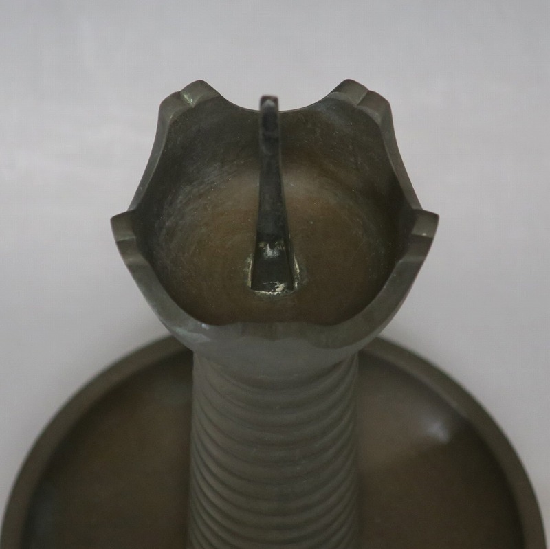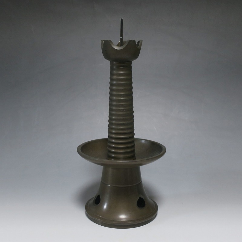 高さ 約31cm/横幅 約14cm 経年の傷みや錆がありますが、総じて良い状態です。状態は写真でご確認ください。 中川家は、京都で活動する千家十職の一人で金物師です。桃山時代、千利休の依頼・指導によって薬燗を作って以降、茶道具作りに専念しました。本品は「中川家中興の祖」と仰がれている7代中川浄益(1796年〜1859年、京都生まれ)が製作した銅製の灯火器。江戸時代に製作されたモダンな作品です。表千家9代・了々斎(1775年〜1825年)が好んだ形の燭台です。灯火器の他、インテリアとしても楽しむことができます。 | ||