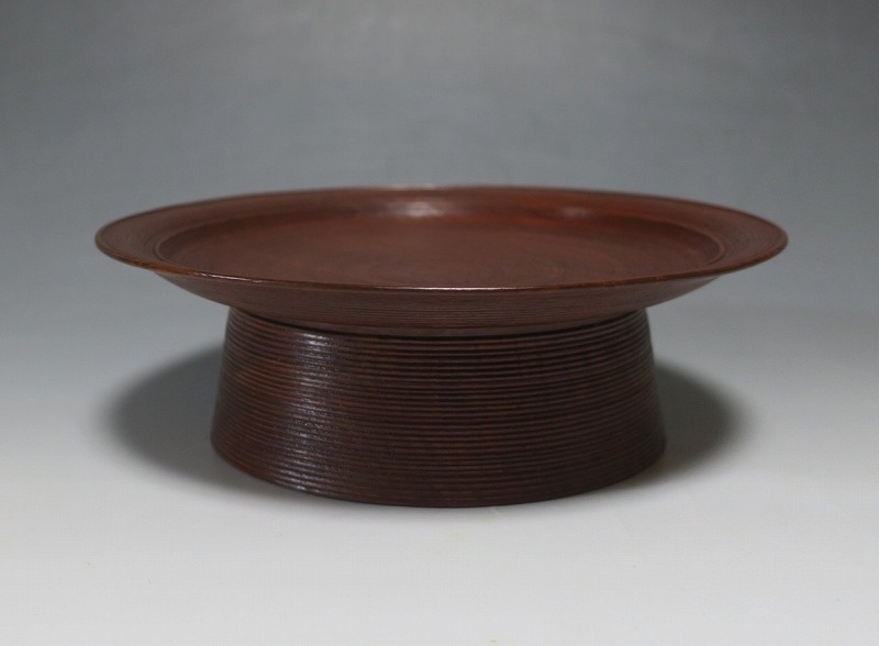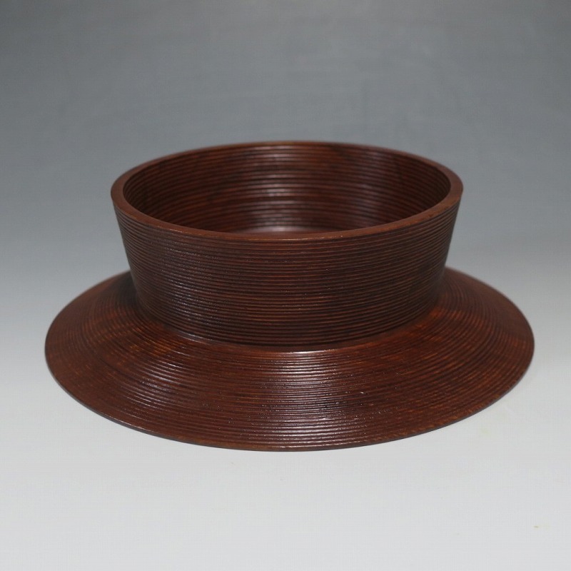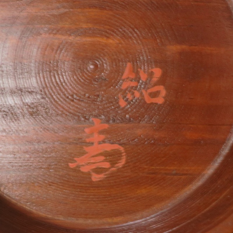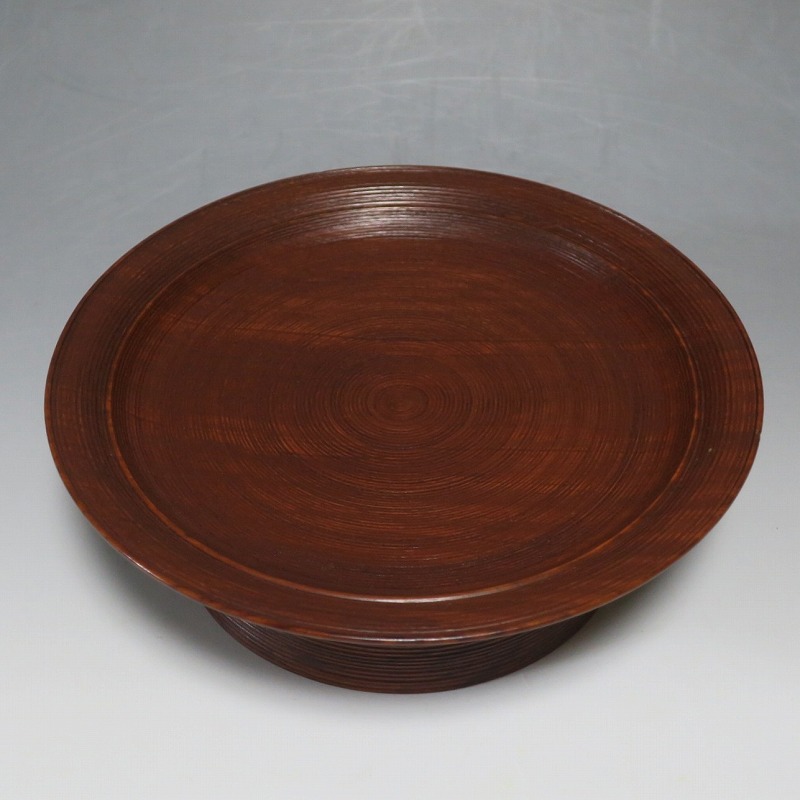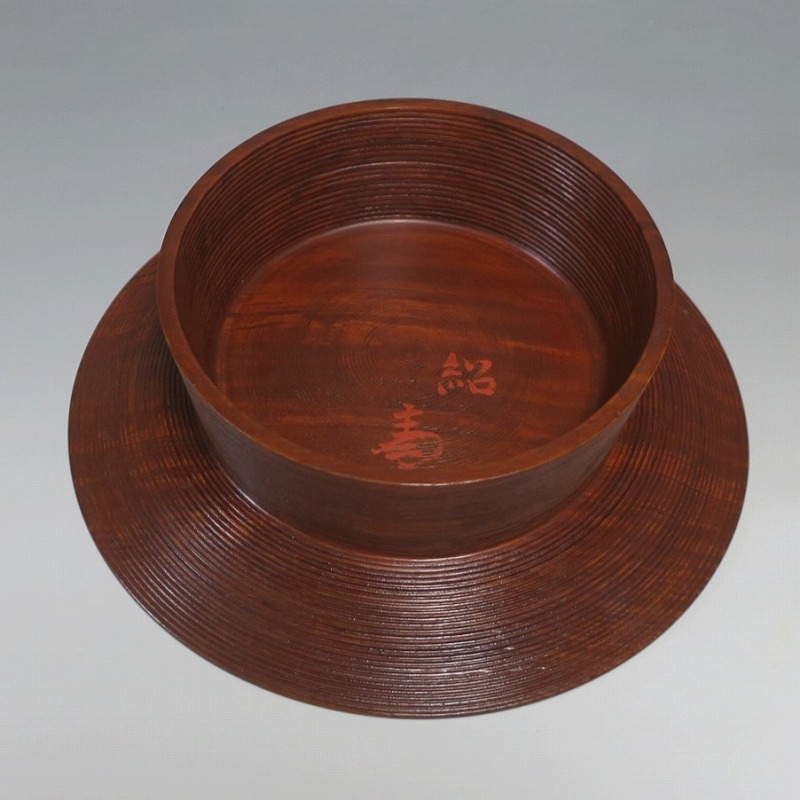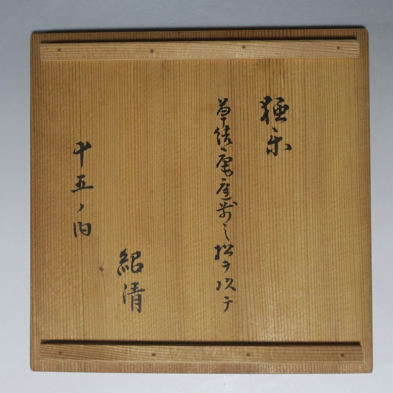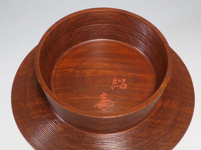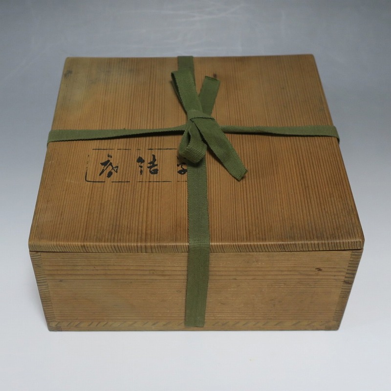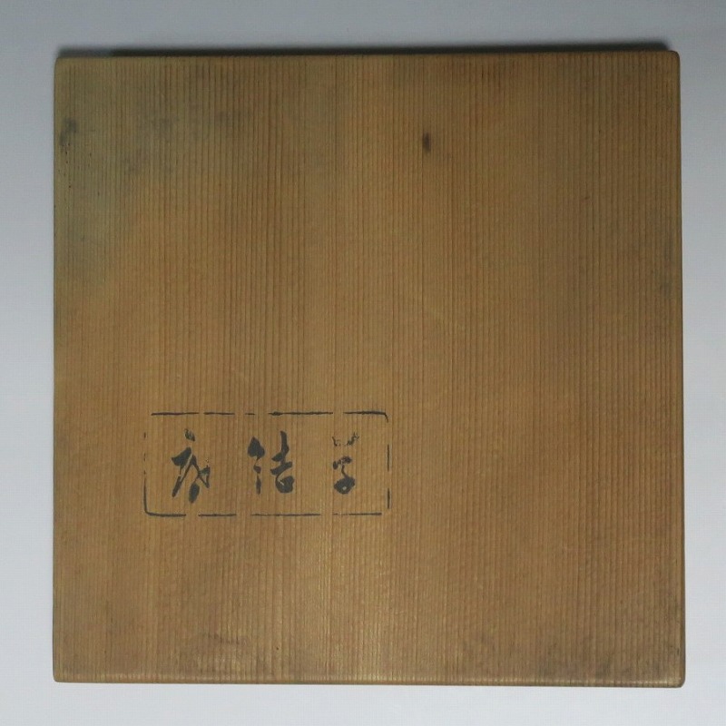 口径 約18.8cm/高さ 約6cm/高台径 約13cm 口辺に約3mmのアタリがありますが、総じて良い状態です。状態は写真でご確認ください。 吉田生風庵は江戸時代末期、名古屋の吉田紹和が表千家流堀内家の堀内不識斎、表千家10代家元吸江斎に師事して表千家の宗匠となった茶道家です。本品は吉田生風庵4代・吉田紹清の箱書きのある漆器の独楽高台付き菓子器。轆轤で引いた木目の美しい作品です。箱蓋の裏に「独楽 草結庵庭前之松以 紹清 十五ノ内」の書付があります。表千家流派の道具だけあって質素な感じのする菓子器です。菓子器の他、見立ての食器として使用できます。 | ||