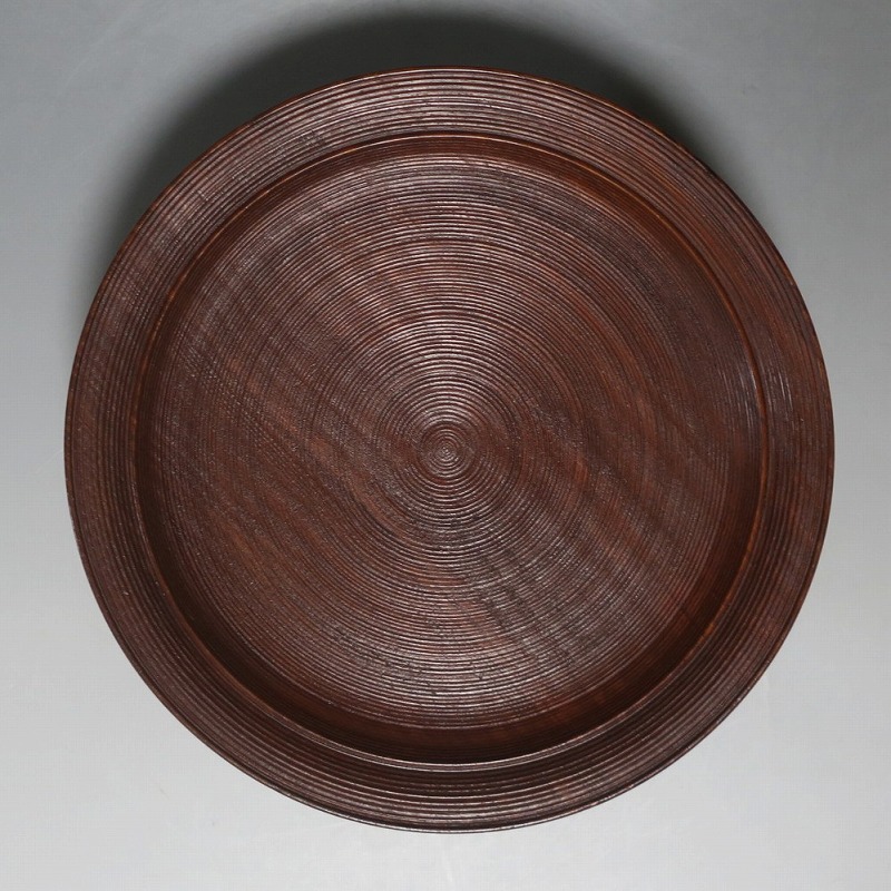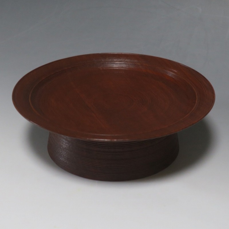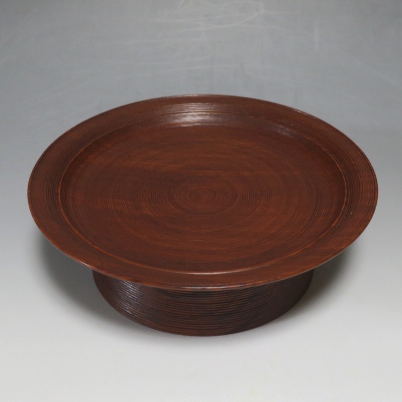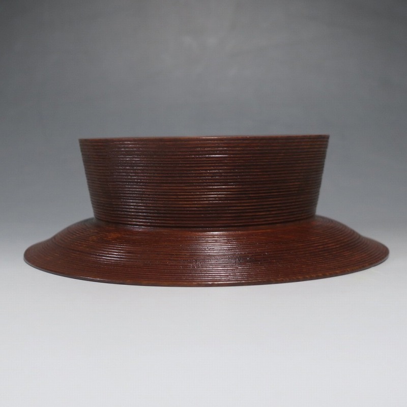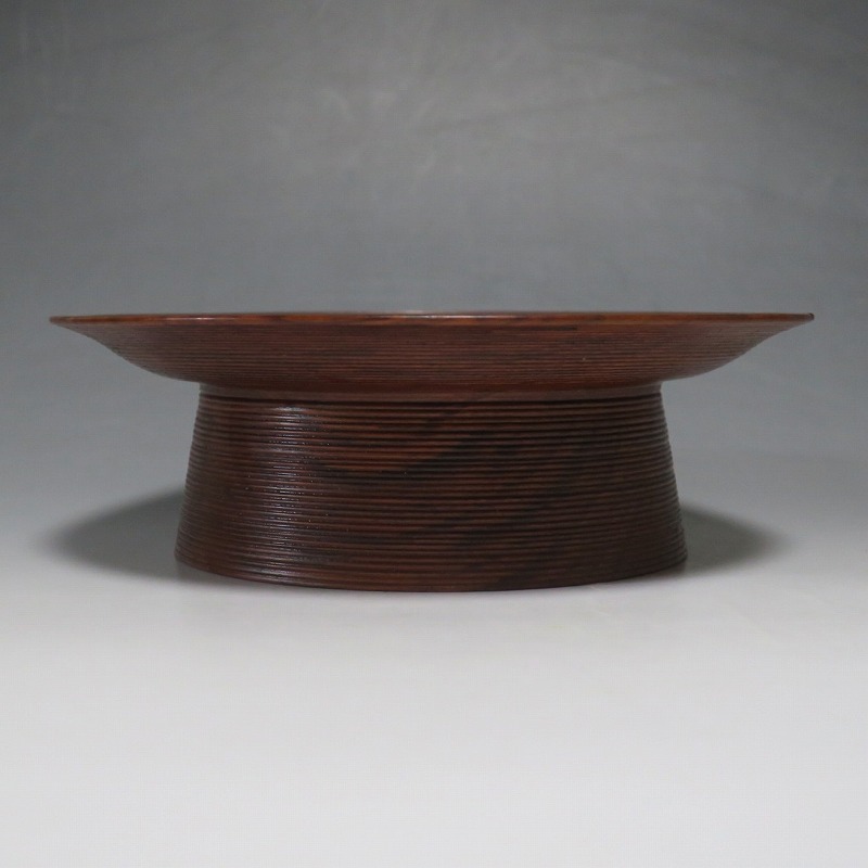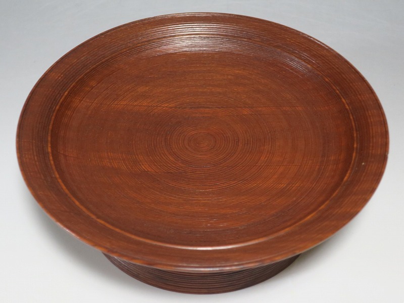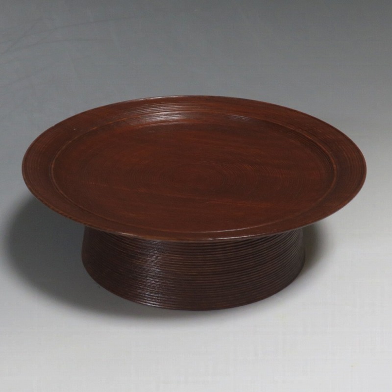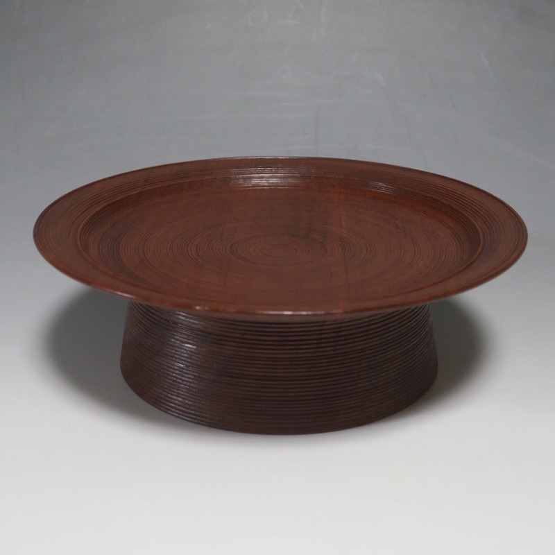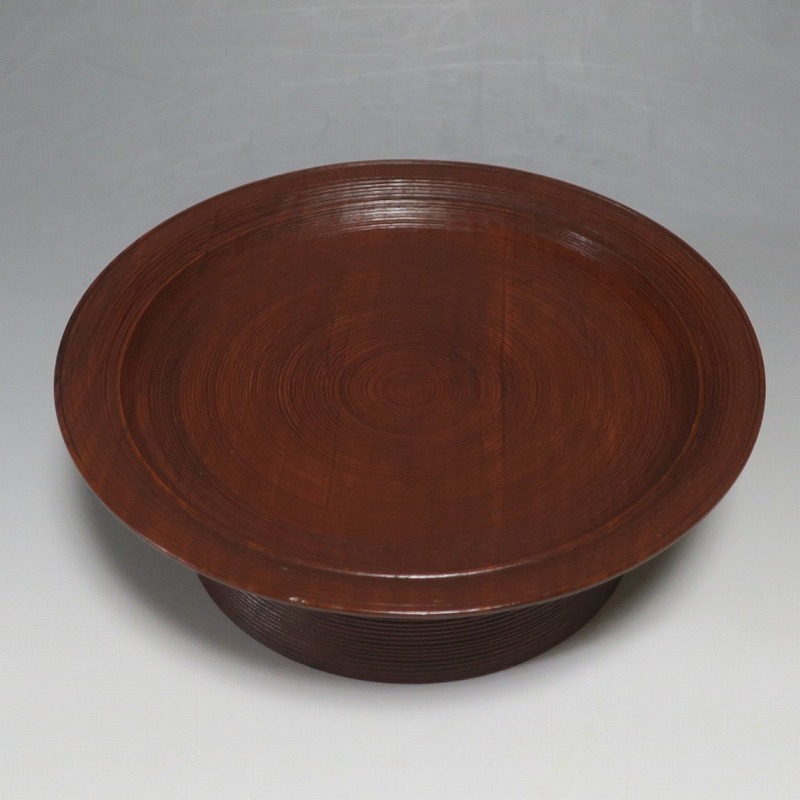 口径 約18.8cm/高さ 約6cm/高台径 約13cm 口辺に約3mmのアタリがありますが、総じて良い状態です。状態は写真でご確認ください。 吉田生風庵は江戸時代末期、名古屋の吉田紹和が表千家流堀内家の堀内不識斎、表千家10代家元吸江斎に師事して表千家の宗匠となった茶道家です。本品は吉田生風庵4代・吉田紹清の箱書きのある漆器の独楽高台付き菓子器。轆轤で引いた木目の美しい作品です。箱蓋の裏に「独楽 草結庵庭前之松以 紹清 十五ノ内」の書付があります。表千家流派の道具だけあって質素な感じのする菓子器です。菓子器の他、見立ての食器として使用できます。 | ||
