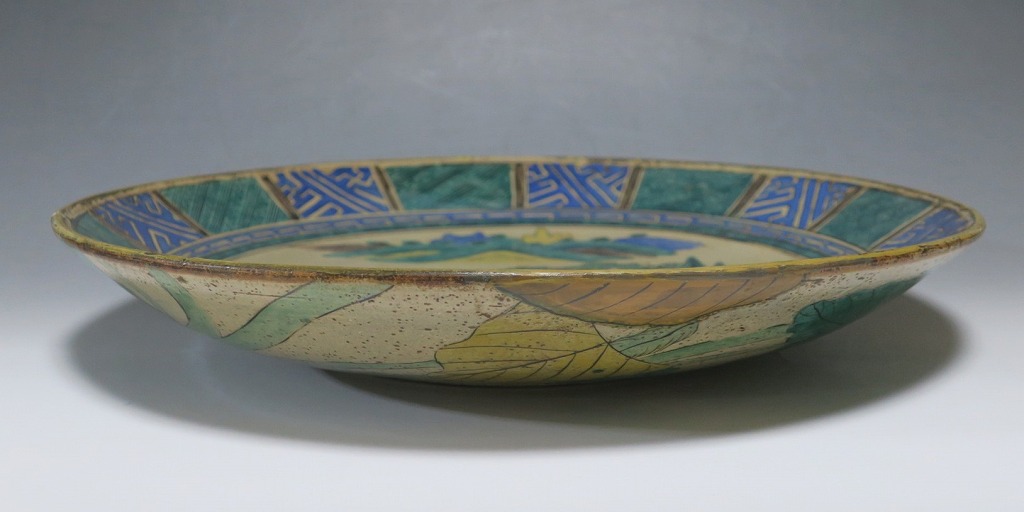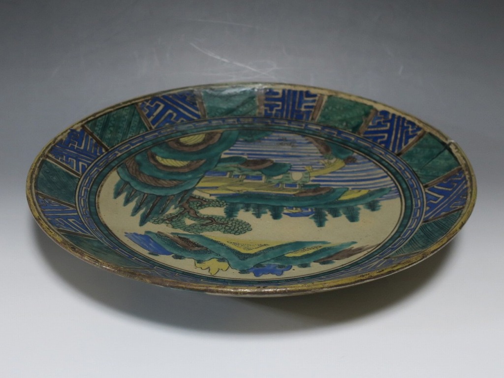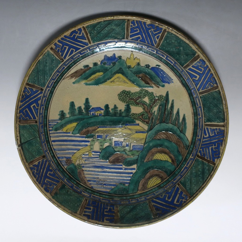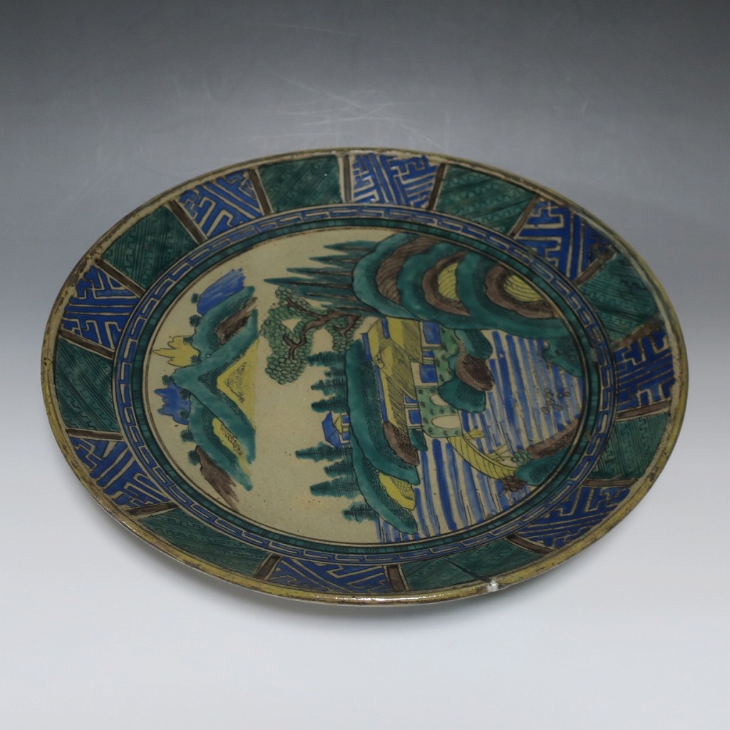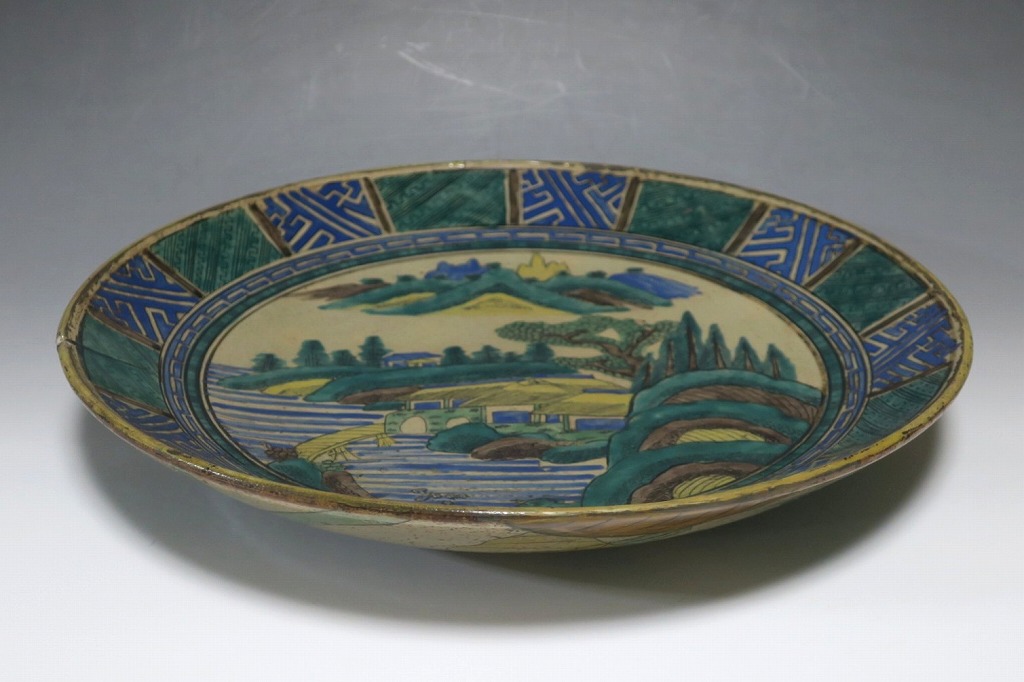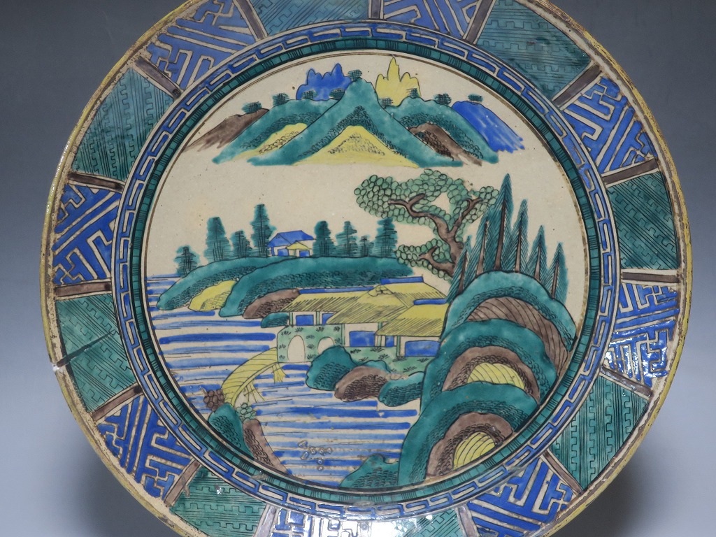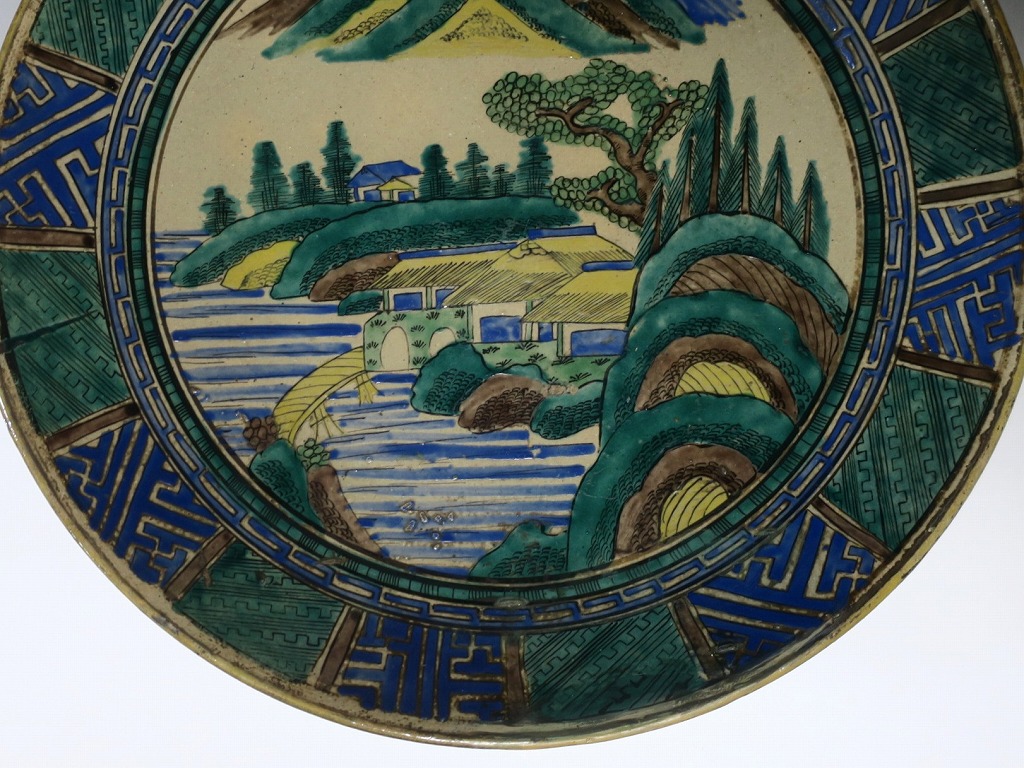 口径 約37.8cm/高さ 約5.5cm/高台径 約17cm 経年の汚れがつき、口辺に約10×2.5cmの直しがあります。状態は写真でご確認ください。 正院焼は江戸時代後期、石川県の能登半島にある珠洲市で活動した窯です。19世紀前半に開窯され、天保時代頃から九谷風の色絵を生産し、嘉永年間(1850年頃)に窯の活動を止めました。本品は19世紀前半期に作られた青手九谷の山水文の大皿。山水文と芙蓉手のような幾何学文が合いまったグッドデザインの作品です。全体的に寒色(青、緑)が使用されているので爽やかな感じがします。地の色が薄黄土色なので民芸風の味わいがあります。インテリア、食器としてお楽しみください。 | ||