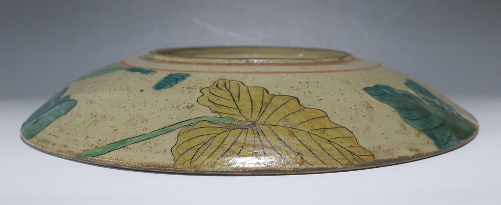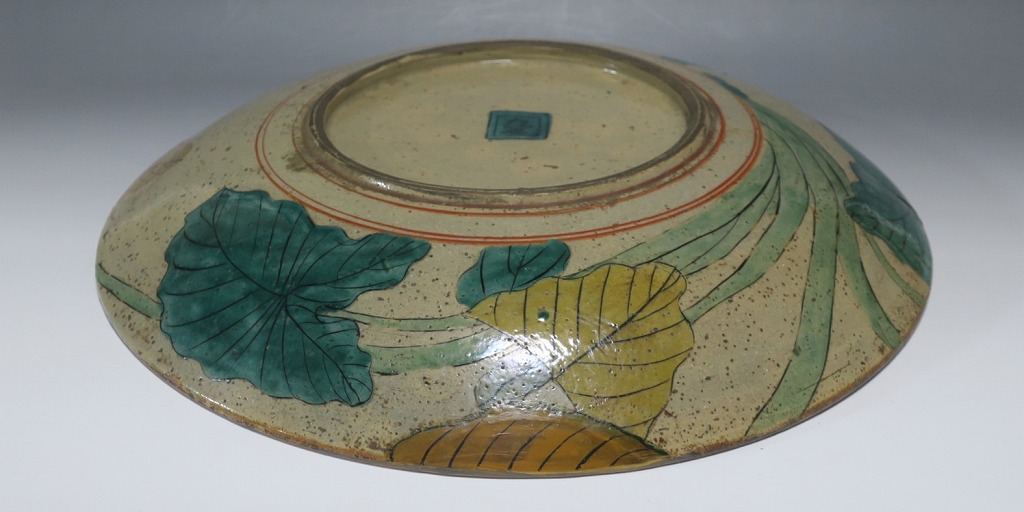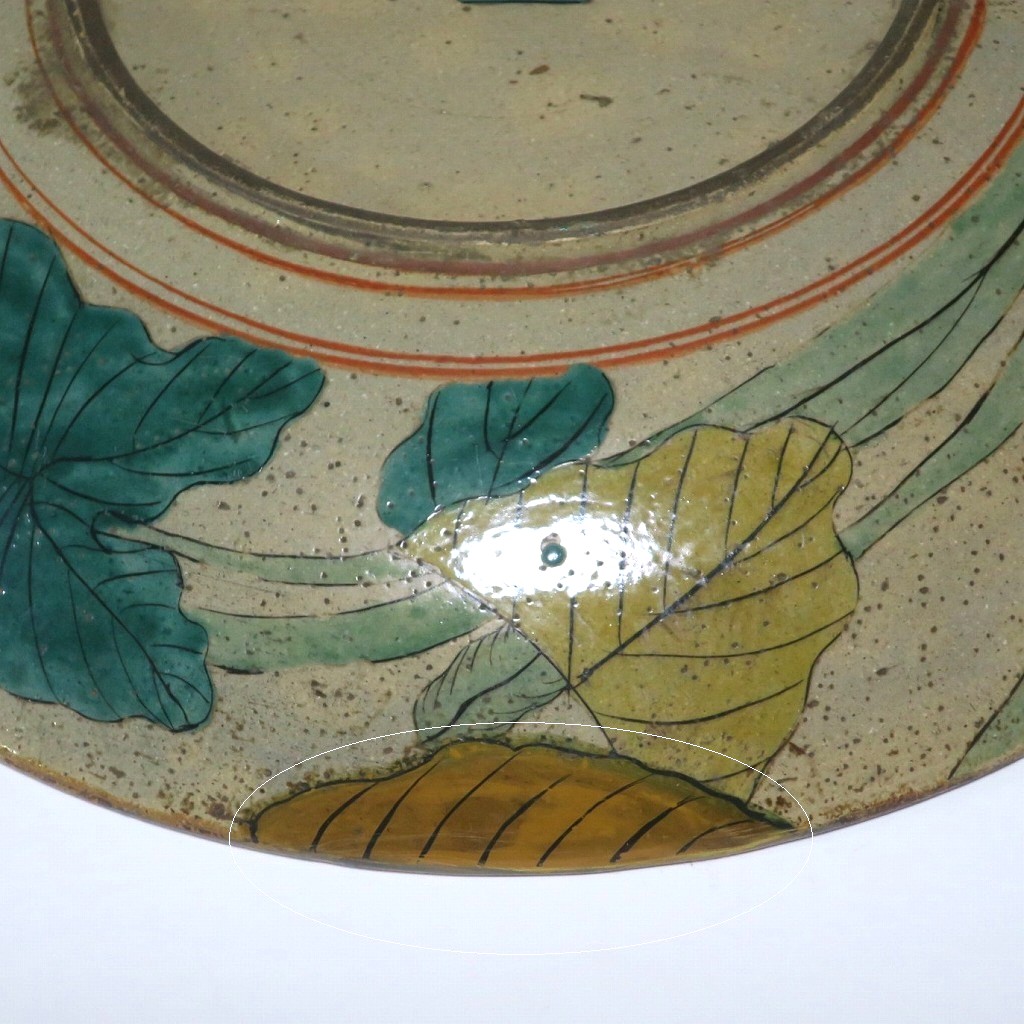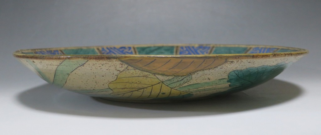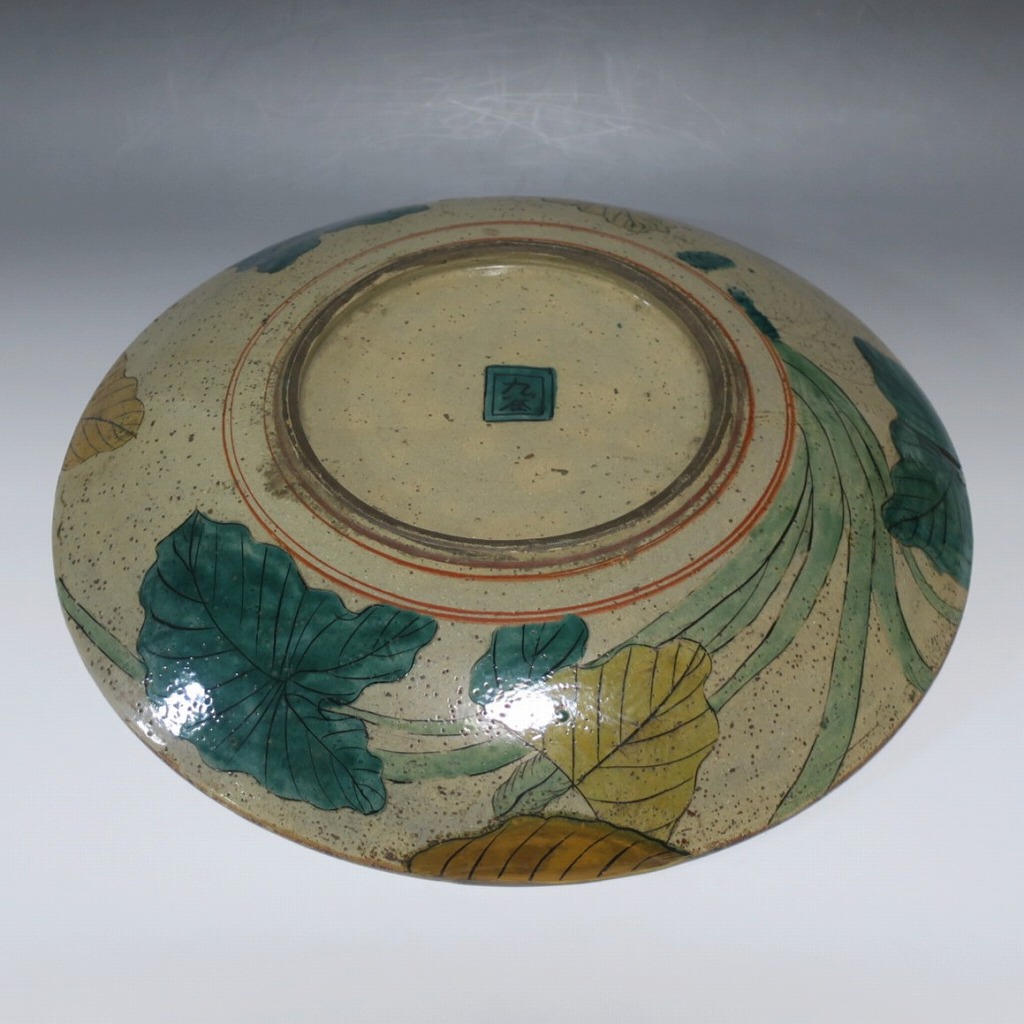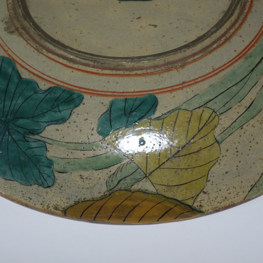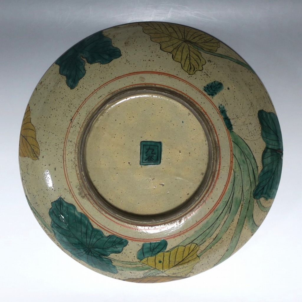 口径 約37.8cm/高さ 約5.5cm/高台径 約17cm 経年の汚れがつき、口辺に約10×2.5cmの直しがあります。状態は写真でご確認ください。 正院焼は江戸時代後期、石川県の能登半島にある珠洲市で活動した窯です。19世紀前半に開窯され、天保時代頃から九谷風の色絵を生産し、嘉永年間(1850年頃)に窯の活動を止めました。本品は19世紀前半期に作られた青手九谷の山水文の大皿。山水文と芙蓉手のような幾何学文が合いまったグッドデザインの作品です。全体的に寒色(青、緑)が使用されているので爽やかな感じがします。地の色が薄黄土色なので民芸風の味わいがあります。インテリア、食器としてお楽しみください。 | ||