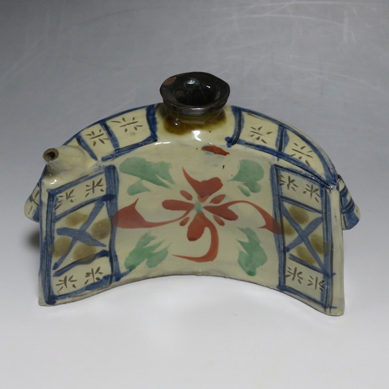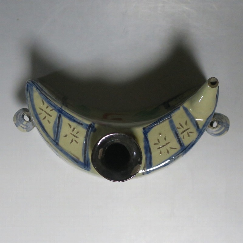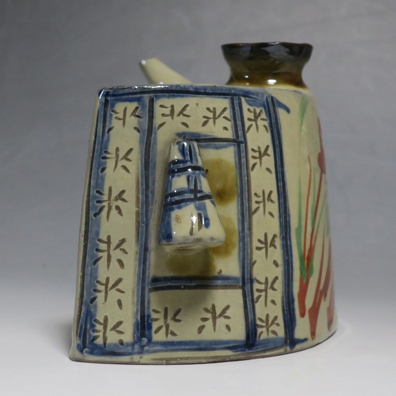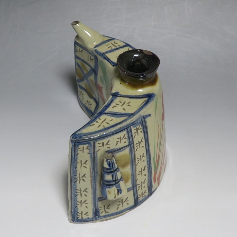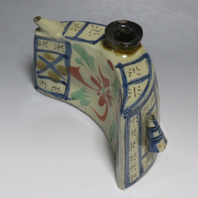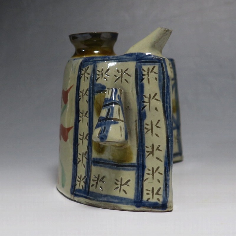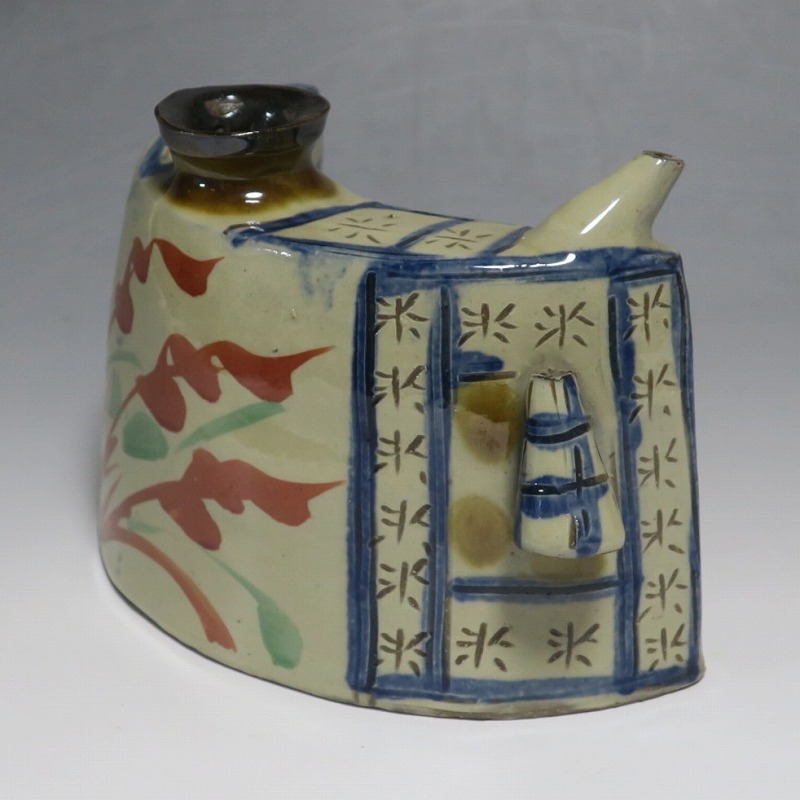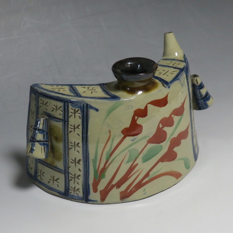 (昭和時代 20世紀後半) 商品番号 4193 高さ 約12cm/横幅 約18.7cm/奥行 約7cm 完品です。状態は写真でご確認ください。 新垣栄三郎(1921年〜84年)は沖縄県那覇市にある壺屋焼の陶工です。浜田庄司、河井寛次郎に学び、初等学校勤務のあと作陶に専念、金城次郎、小橋川永昌と共に「壺屋三人男」として名声を博しました。国画会会員。琉球大学の助教授。本品は胴部に伸びやかなタッチできび文を描いた抱瓶。きびと幾何学模様がマッチしている作品です。泡盛を飲む時、使用すると楽しいでしょう。 | ||