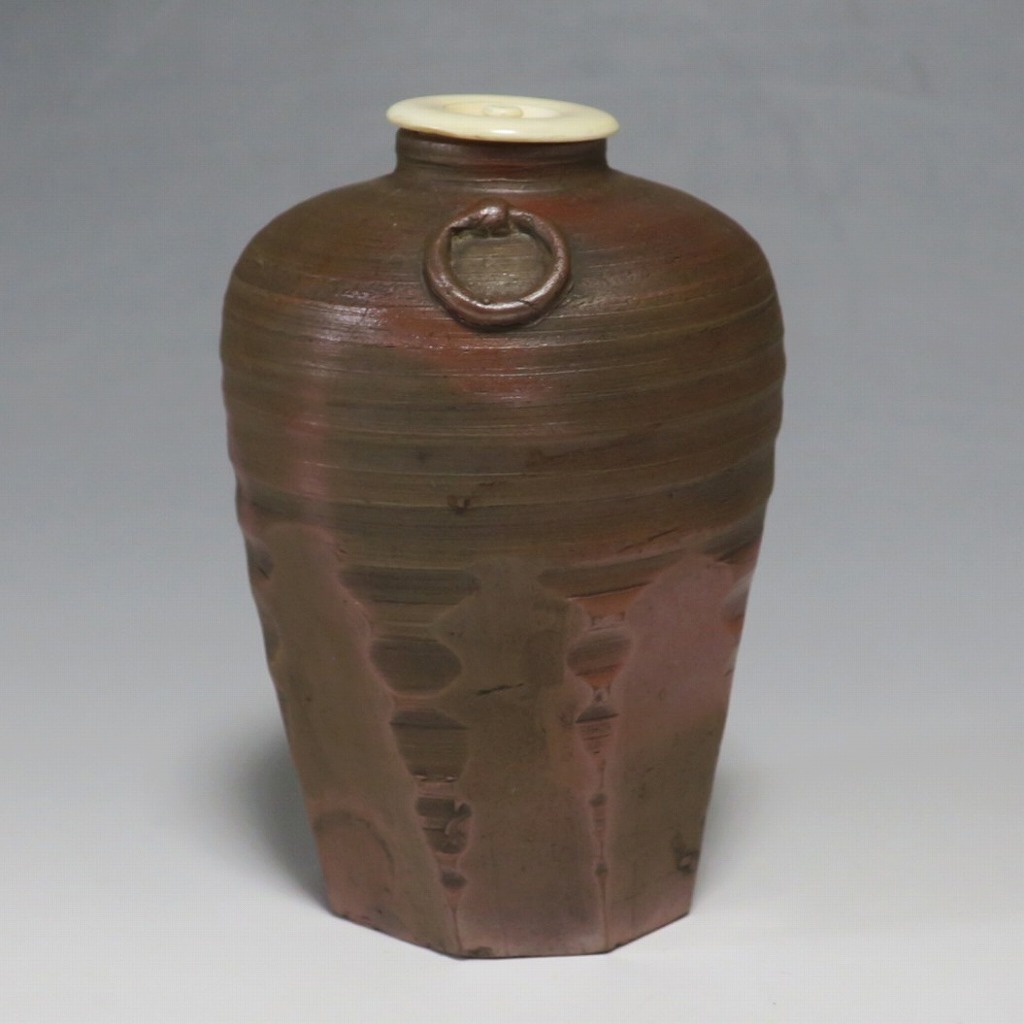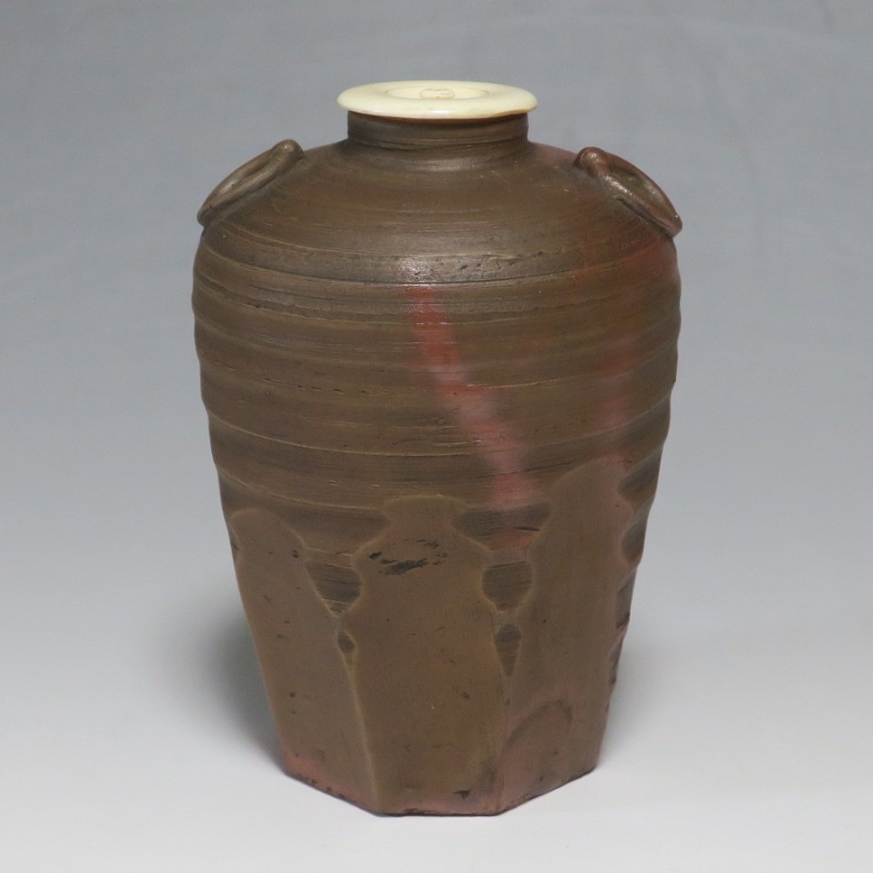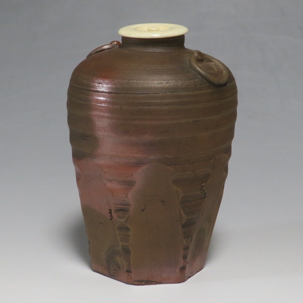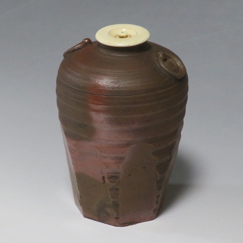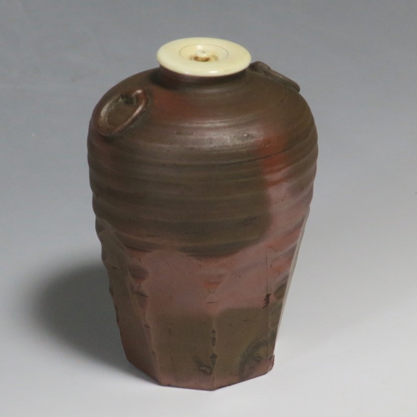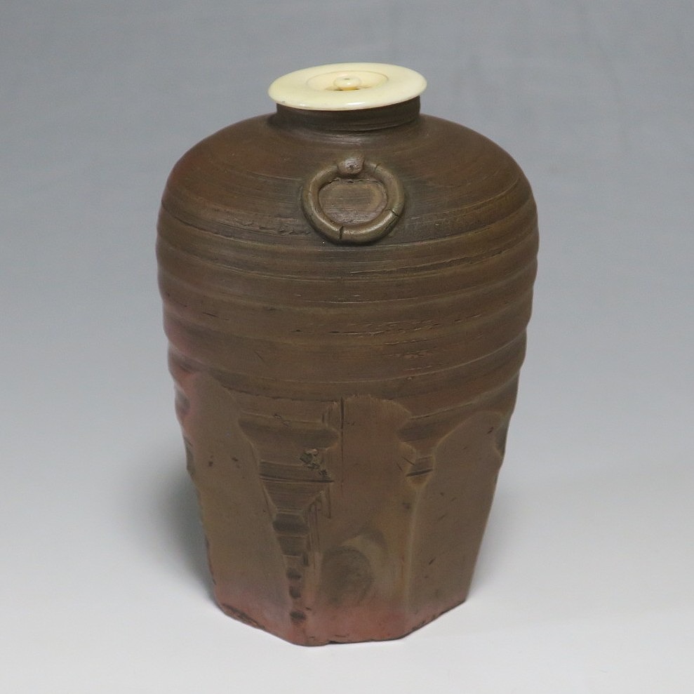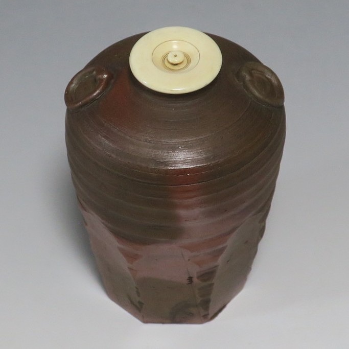 高さ 約9.5cm/胴径 約6.7cm 経年の汚れがありますが、総じて良い状態です。状態は写真でご確認ください。 備前焼は古代から吉備地方(岡山県)で製作される須恵器の流れを汲んだb器です。中世六古窯の一つで桃山時代は茶陶を作る窯として栄え、現在に至っています。本品は江戸時代後期に作られた茶入。胴部に火襷がかかり、下部が面取りになっている造形的な作品です。広島藩茶道の上田宗箇流の茶人は面取りの道具を好んだので、宗箇流の茶人が注文したのかもしれません。彫刻作品のような武家好みの茶入れです。黒い漆盆の上などに飾ると映えるでしょう。 | ||