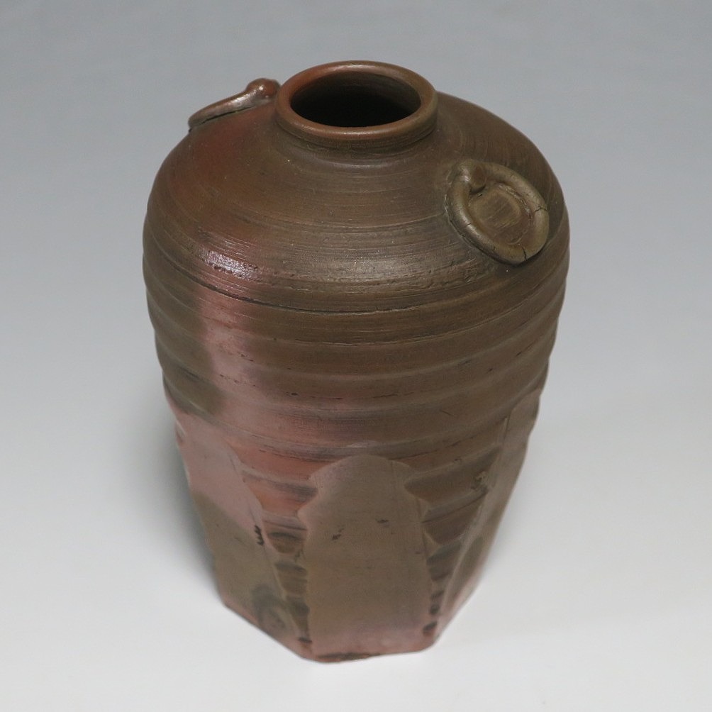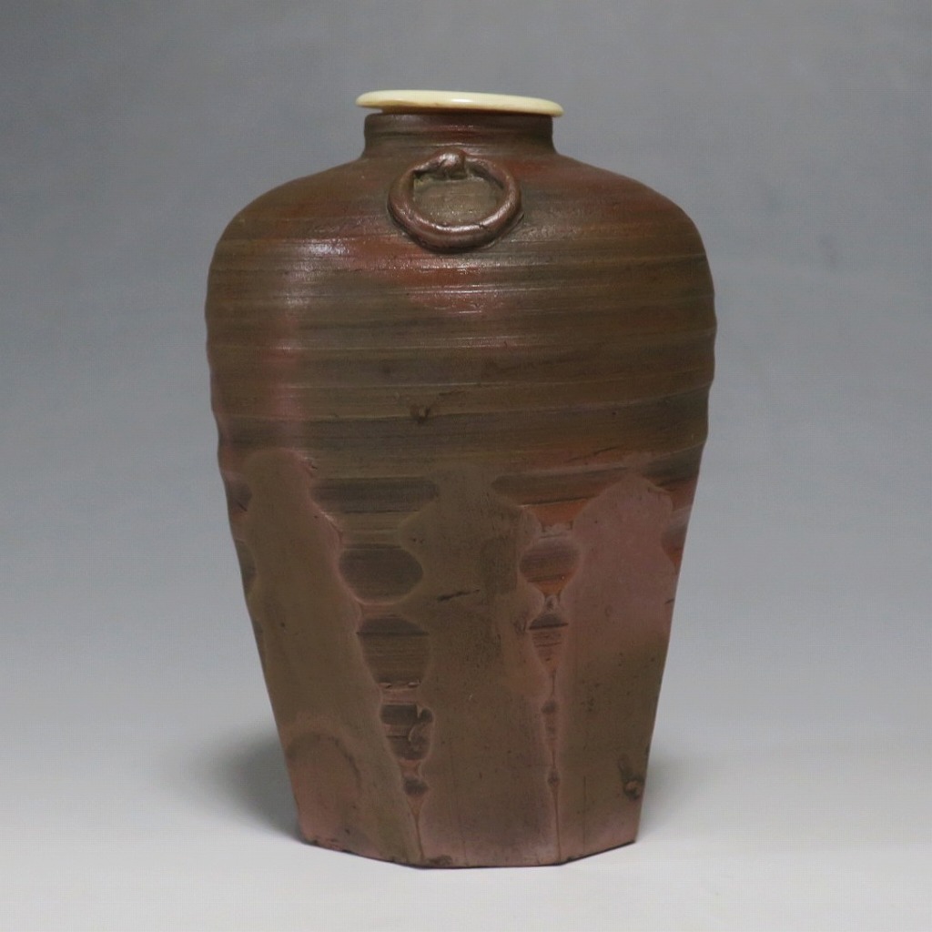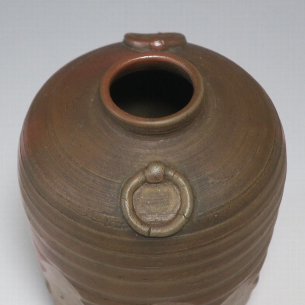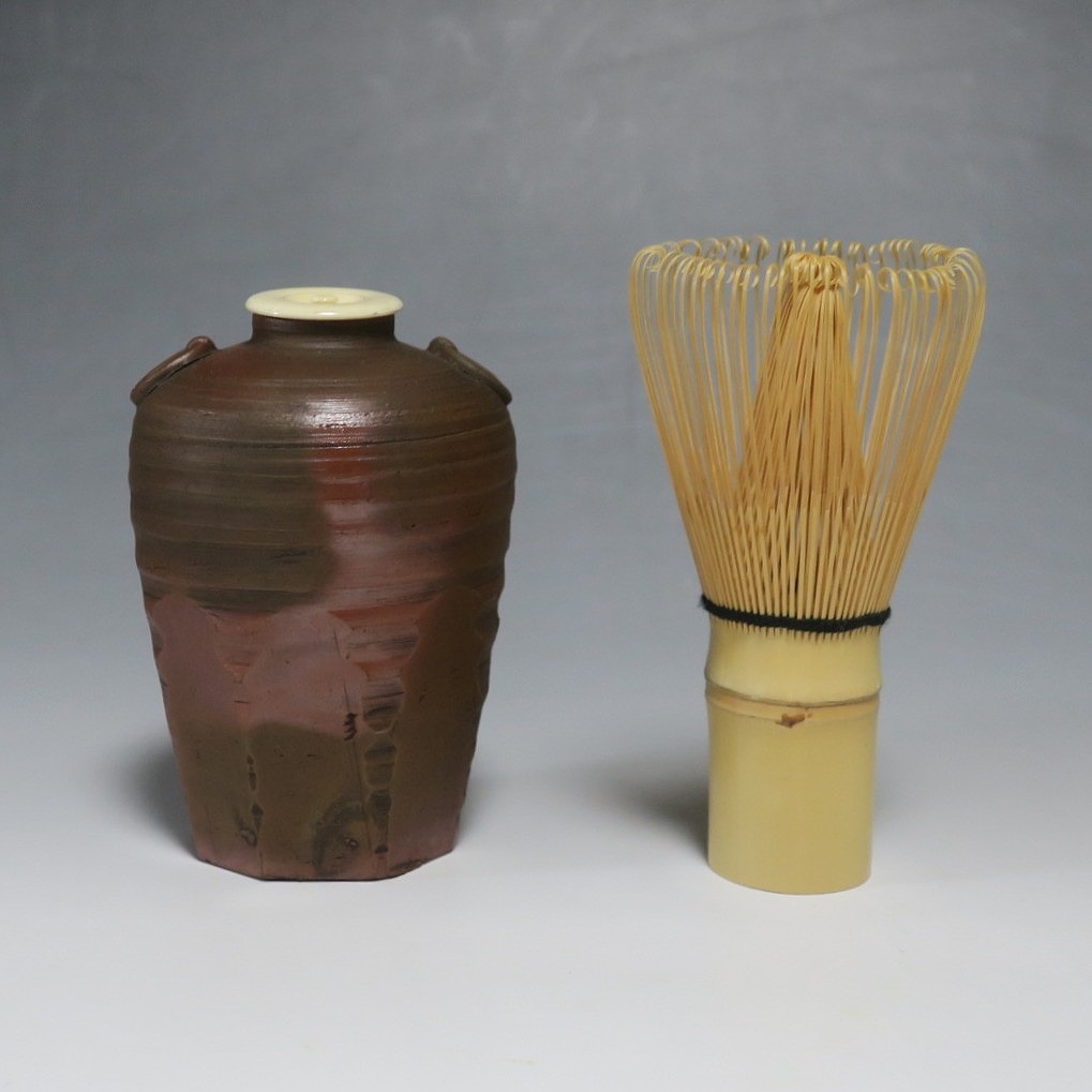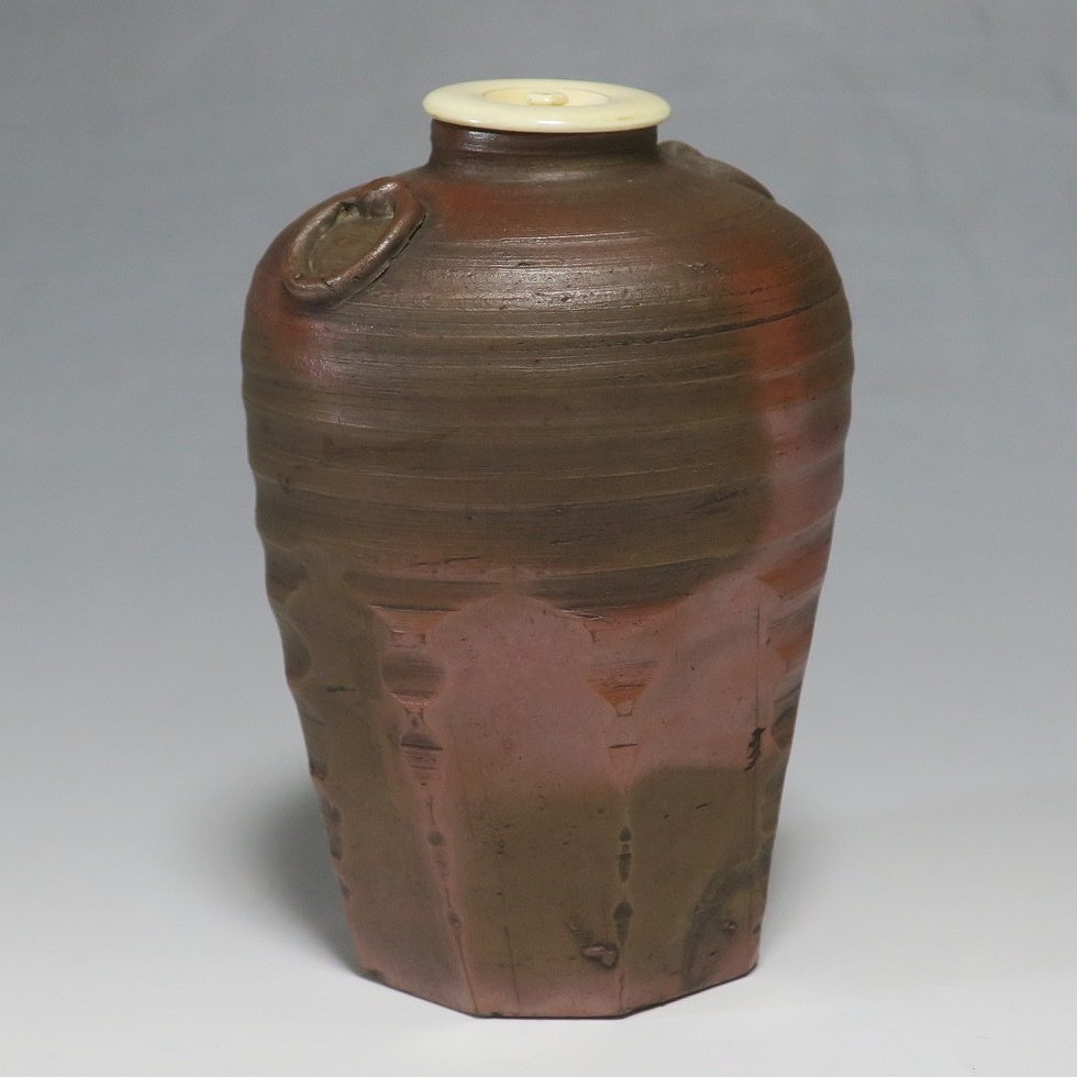 高さ 約9.5cm/胴径 約6.7cm 経年の汚れがありますが、総じて良い状態です。状態は写真でご確認ください。 備前焼は古代から吉備地方(岡山県)で製作される須恵器の流れを汲んだb器です。中世六古窯の一つで桃山時代は茶陶を作る窯として栄え、現在に至っています。本品は江戸時代後期に作られた茶入。胴部に火襷がかかり、下部が面取りになっている造形的な作品です。広島藩茶道の上田宗箇流の茶人は面取りの道具を好んだので、宗箇流の茶人が注文したのかもしれません。彫刻作品のような武家好みの茶入れです。黒い漆盆の上などに飾ると映えるでしょう。 | ||