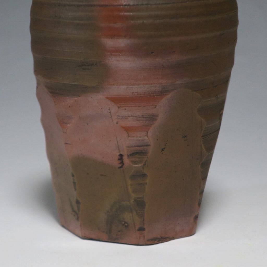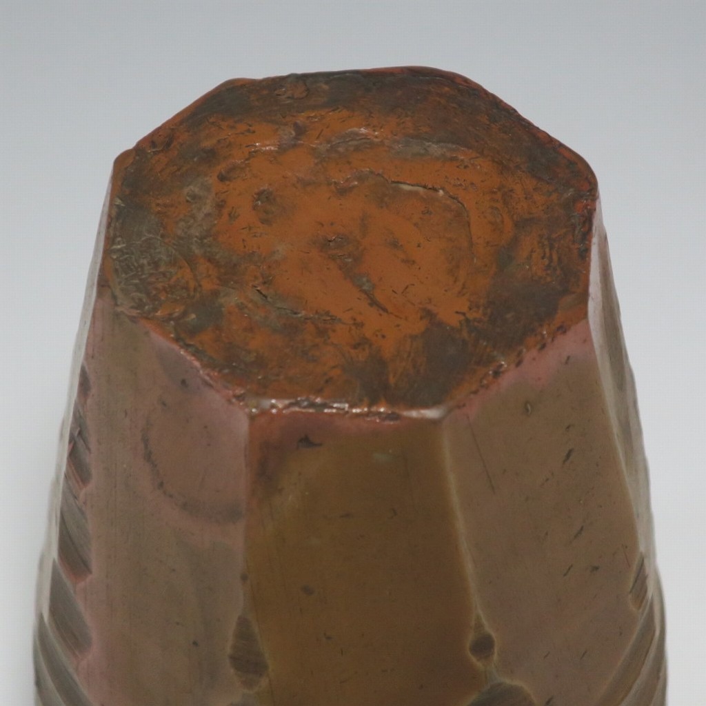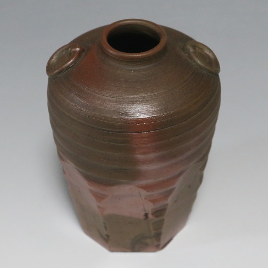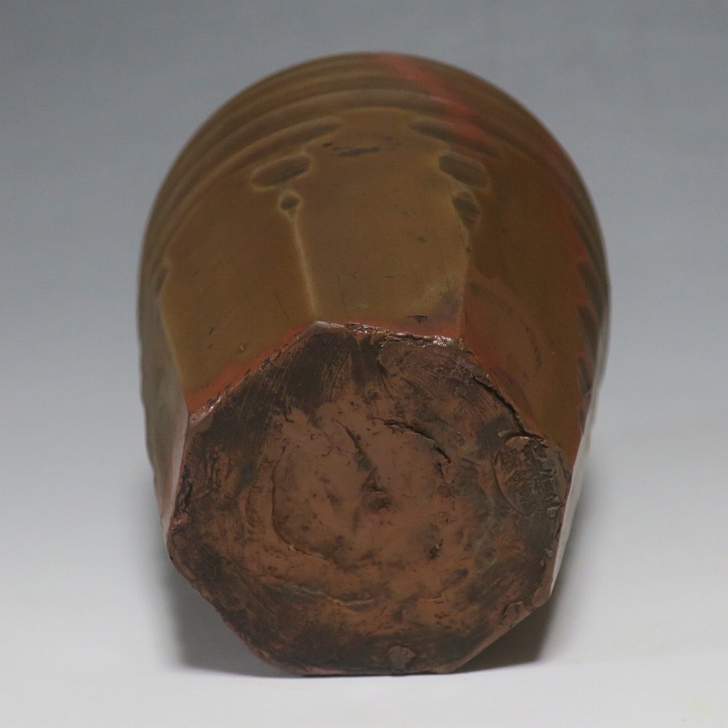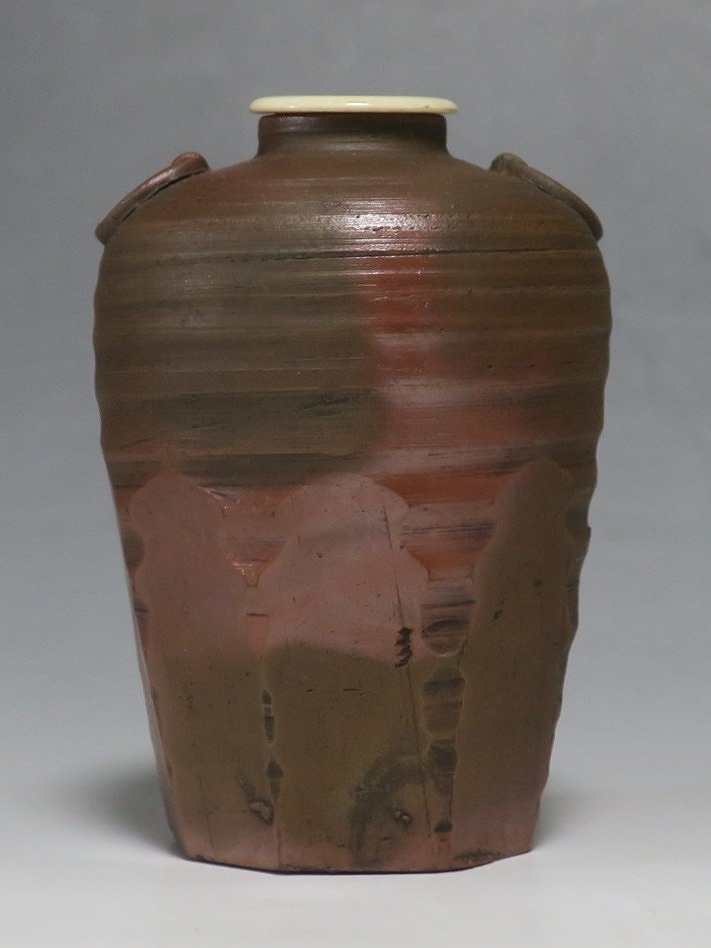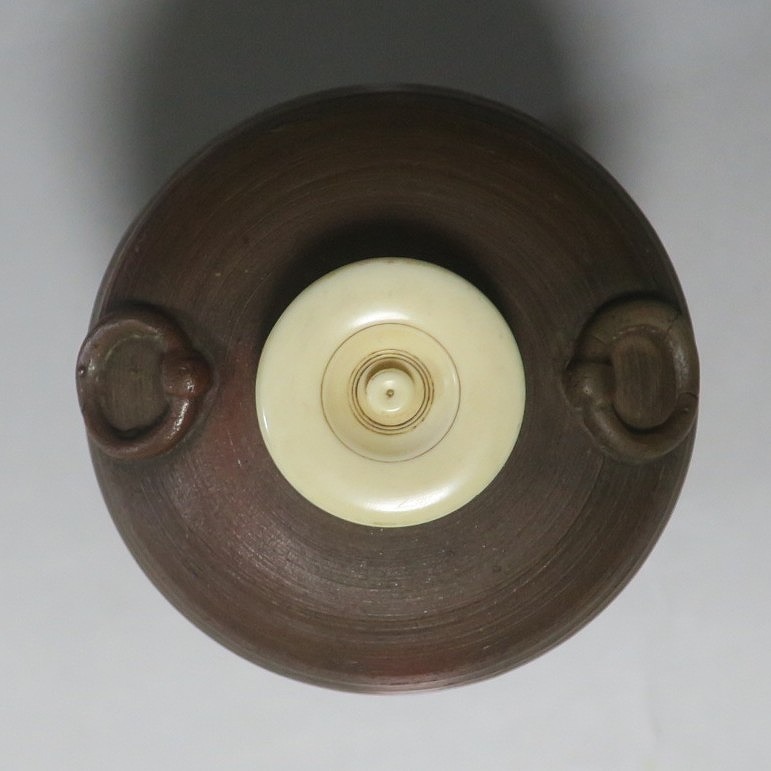 高さ 約9.5cm/胴径 約6.7cm 経年の汚れがありますが、総じて良い状態です。状態は写真でご確認ください。 備前焼は古代から吉備地方(岡山県)で製作される須恵器の流れを汲んだb器です。中世六古窯の一つで桃山時代は茶陶を作る窯として栄え、現在に至っています。本品は江戸時代後期に作られた茶入。胴部に火襷がかかり、下部が面取りになっている造形的な作品です。広島藩茶道の上田宗箇流の茶人は面取りの道具を好んだので、宗箇流の茶人が注文したのかもしれません。彫刻作品のような武家好みの茶入れです。黒い漆盆の上などに飾ると映えるでしょう。 | ||