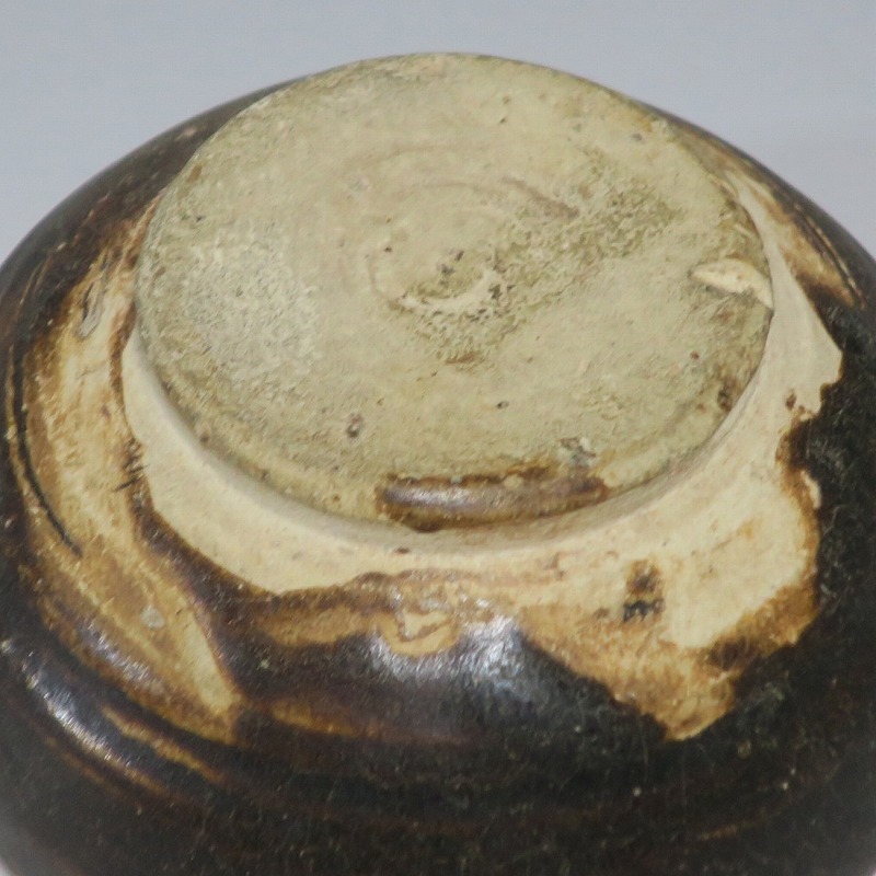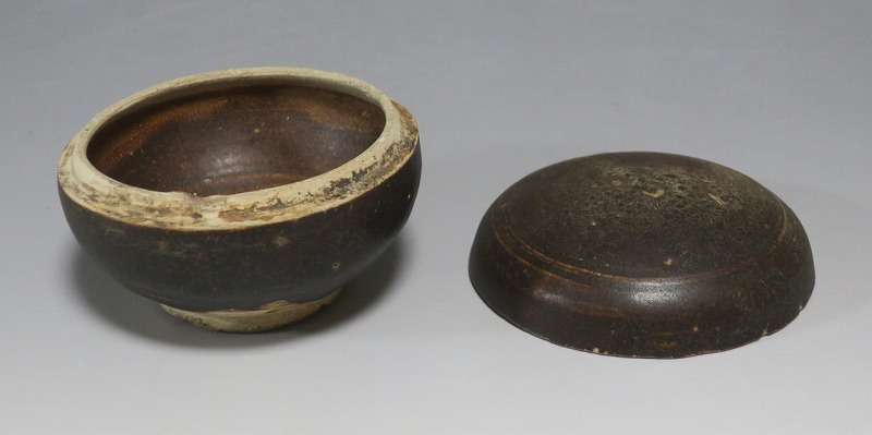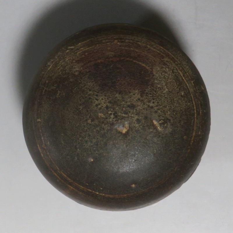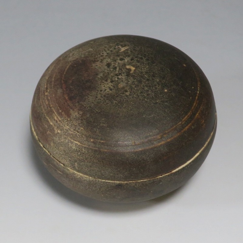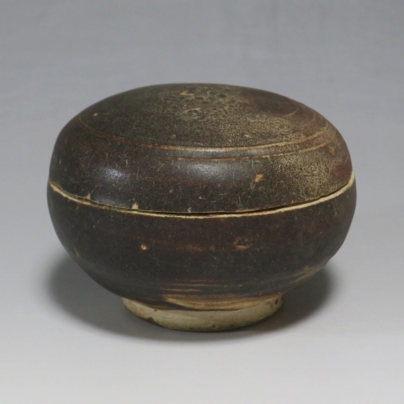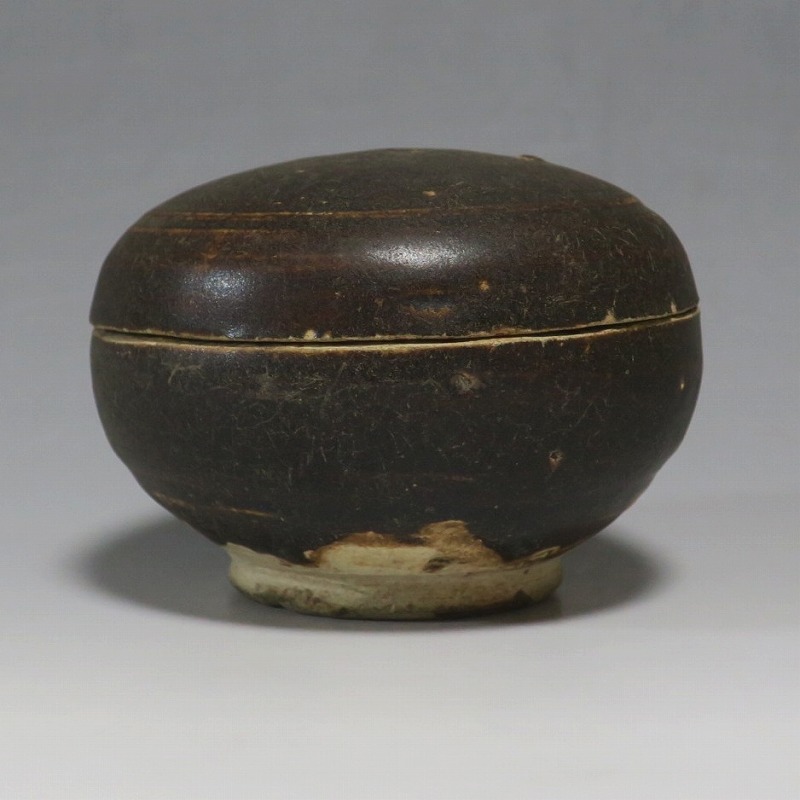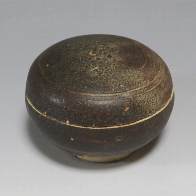 横幅 約8cm/高さ 約5.5cm 窯傷や小ホツはありますが、総じて良い状態です。状態は写真でご確認ください。 スンコロク(宋胡録)は14世紀前後から、タイ中北部のスワンカロークで作られた鉄絵、黒釉、青磁、褐釉などの古陶磁の総称です。 桃山時代から江戸時代初期にかけて、日本に蓋物などが輸入され、茶入れや香合など茶道具として用いられました。本品は香料入れなどに使用されたと考えられる褐釉の合子。同時代の中国、磁州窯などの影響を受けて作られたのでしょう。小ぶりなサイズの香合。飾りとして使用できます。 | ||
