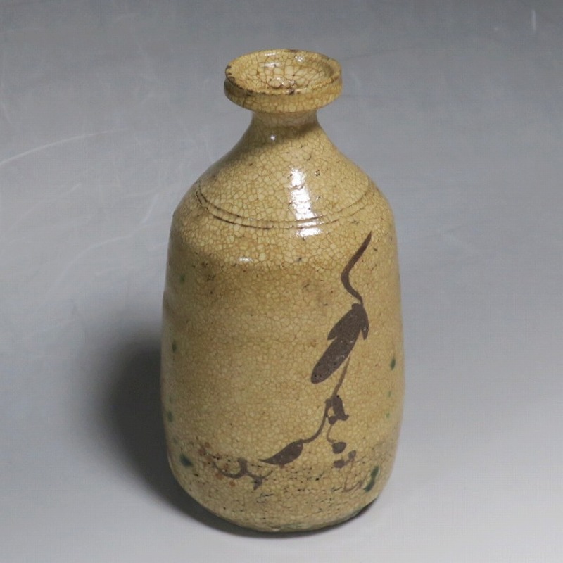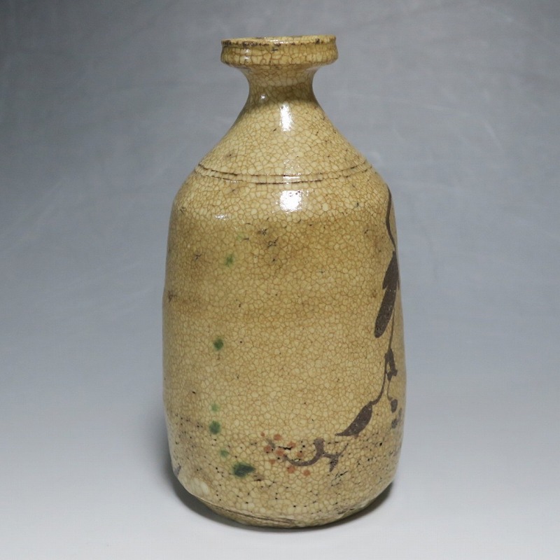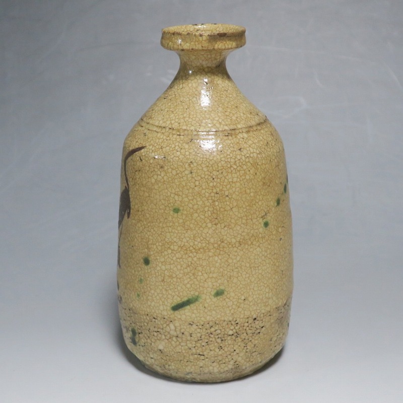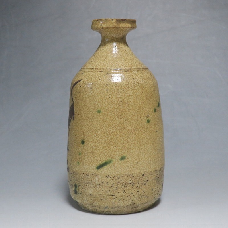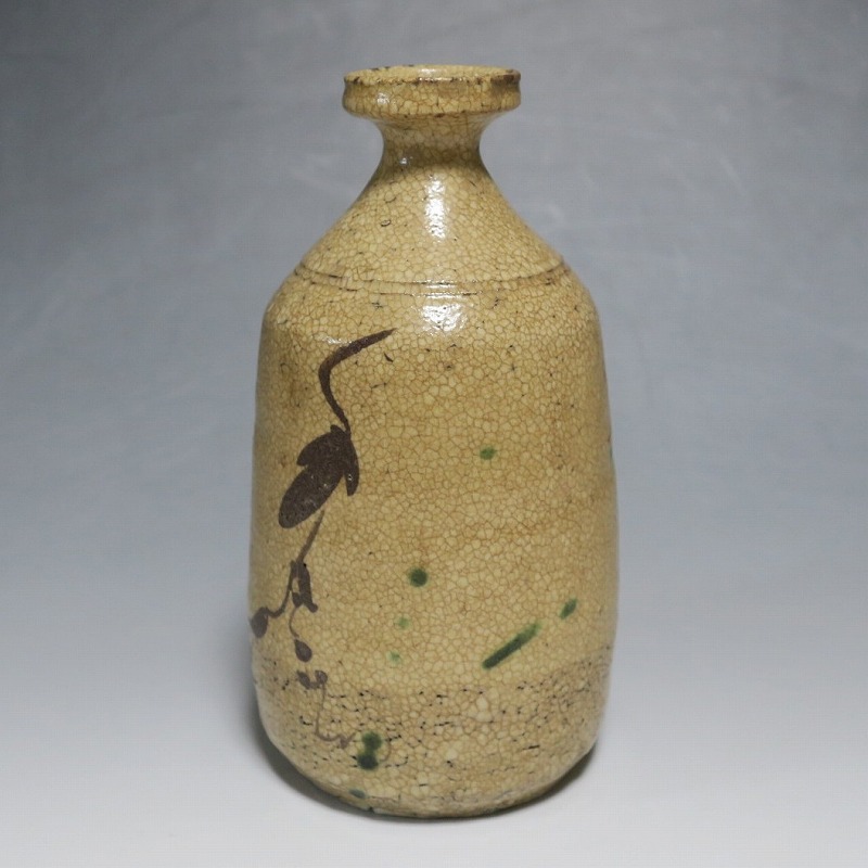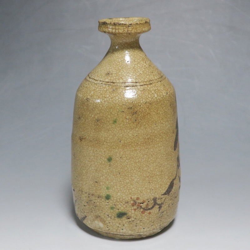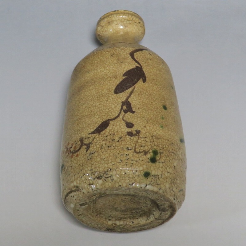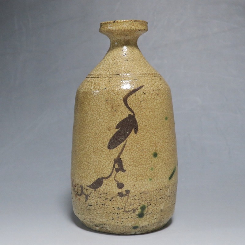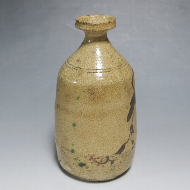 高さ 約16.2cm/胴径 約8.7cm 口辺に約5mmの小ホツ、窯傷や経年の汚れがありますが、総じて良い状態です。状態は写真でご確認ください。 織部焼は桃山時代、美濃地方で古田織部の指導によって創作された焼物です。茶人たちに珍重された緑黄釉の交趾焼(華南三彩)を手本に、和風独特の歪みを取り入れて製作されました。江戸時代前期、織部焼は一時廃れますが、18世紀後半になり再生産が始まると様々な作品が製作され人気を取り戻しました。本品は幕末期に作られた織部焼のお預け徳利。鉄絵や緑釉、紅釉を使って草花文が描かれた作品です。美濃焼なので長石釉のかいらぎが出て志野や黄瀬戸に通じる焼物になっています。民芸品のような素朴さがあります。日本酒器としてお楽しみください。 | ||