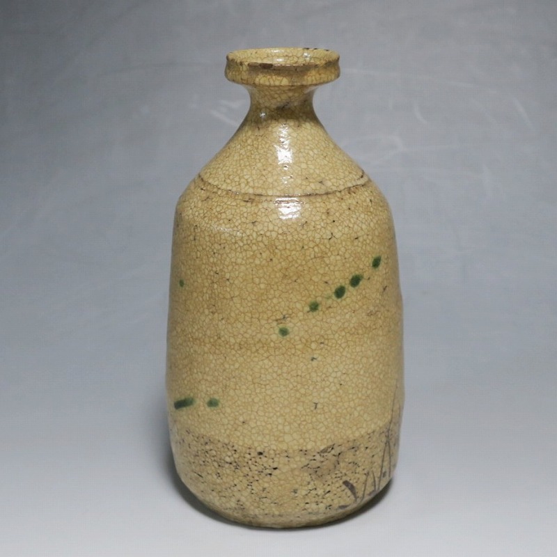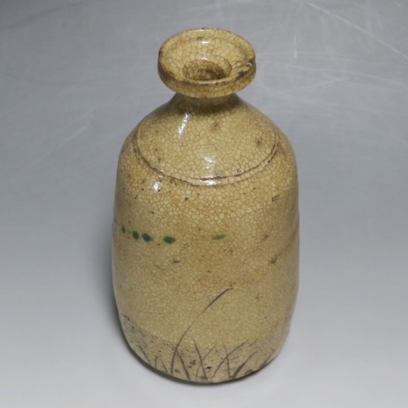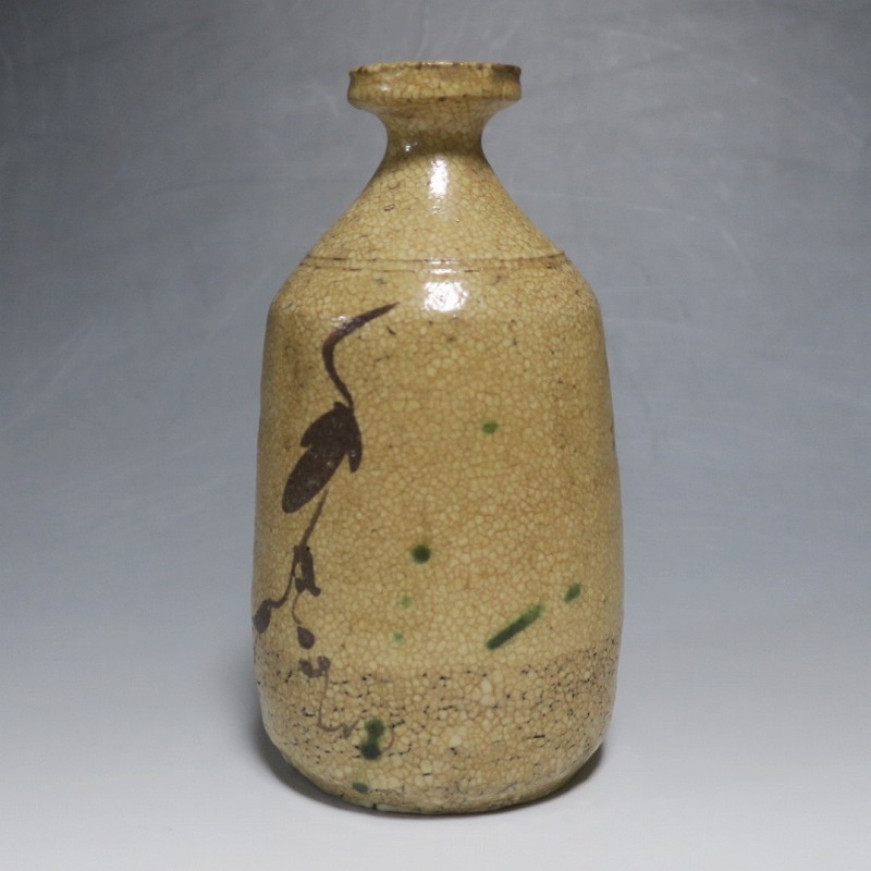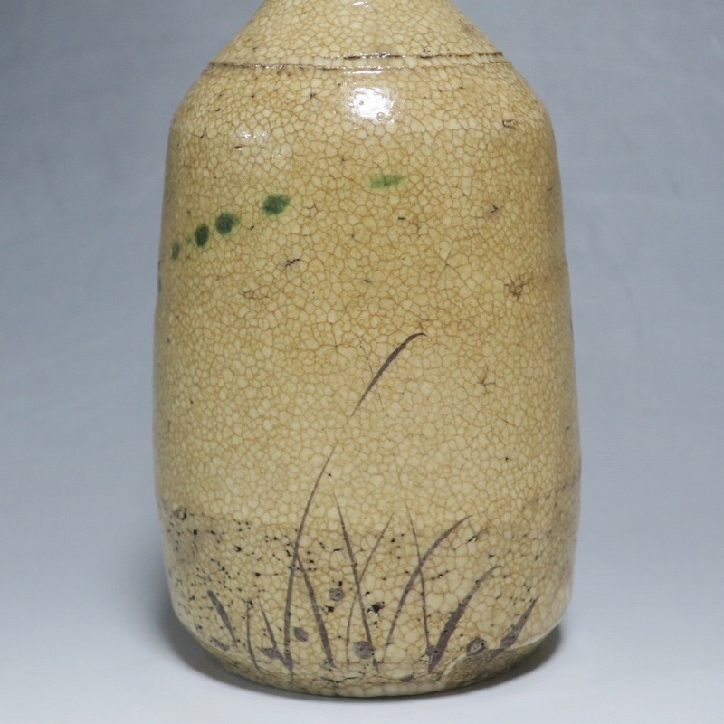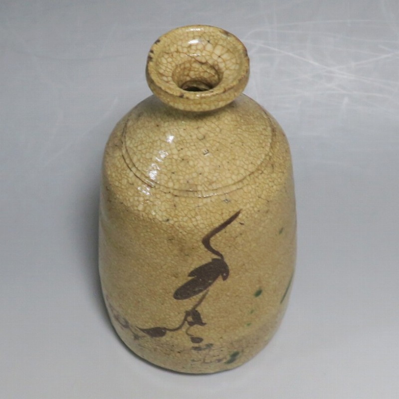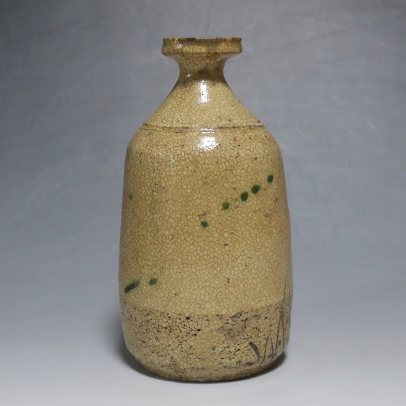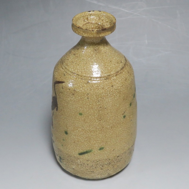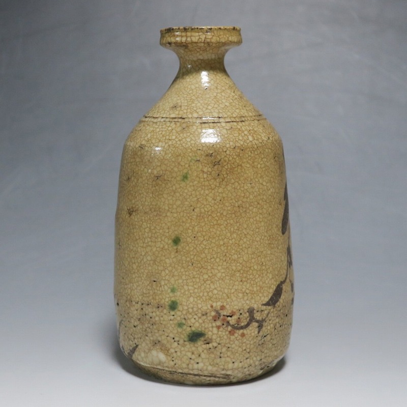 高さ 約16.2cm/胴径 約8.7cm 口辺に約5mmの小ホツ、窯傷や経年の汚れがありますが、総じて良い状態です。状態は写真でご確認ください。 織部焼は桃山時代、美濃地方で古田織部の指導によって創作された焼物です。茶人たちに珍重された緑黄釉の交趾焼(華南三彩)を手本に、和風独特の歪みを取り入れて製作されました。江戸時代前期、織部焼は一時廃れますが、18世紀後半になり再生産が始まると様々な作品が製作され人気を取り戻しました。本品は幕末期に作られた織部焼のお預け徳利。鉄絵や緑釉、紅釉を使って草花文が描かれた作品です。美濃焼なので長石釉のかいらぎが出て志野や黄瀬戸に通じる焼物になっています。民芸品のような素朴さがあります。日本酒器としてお楽しみください。 | ||