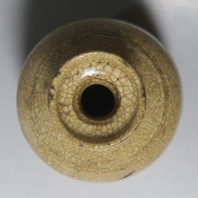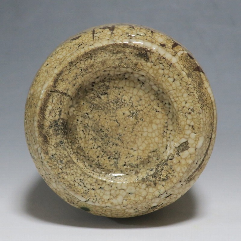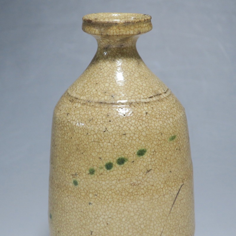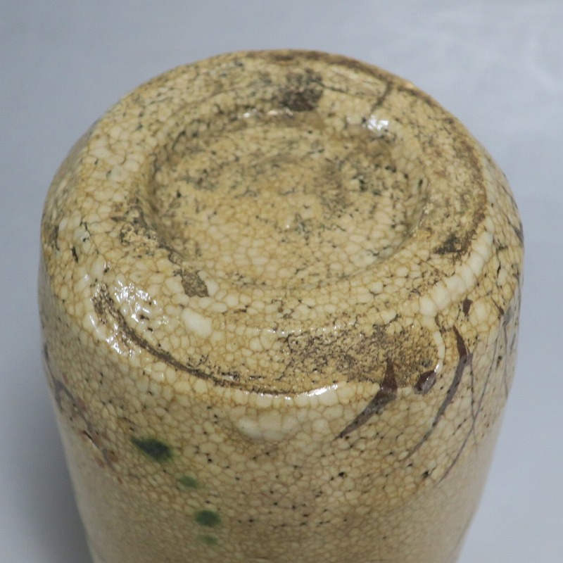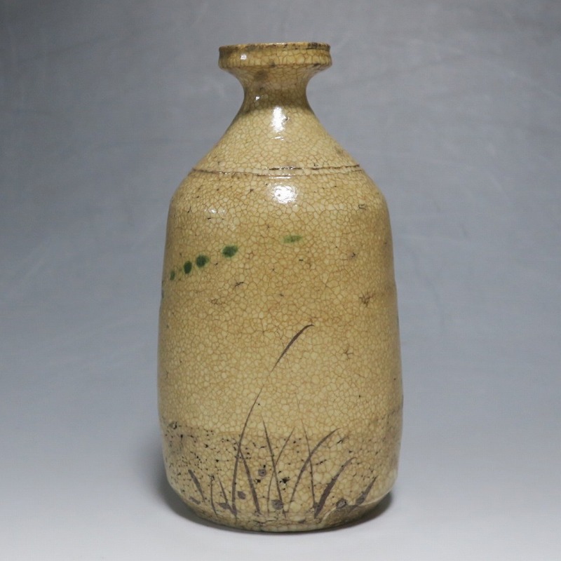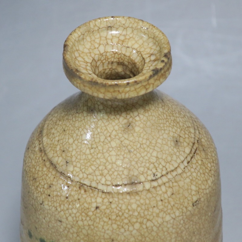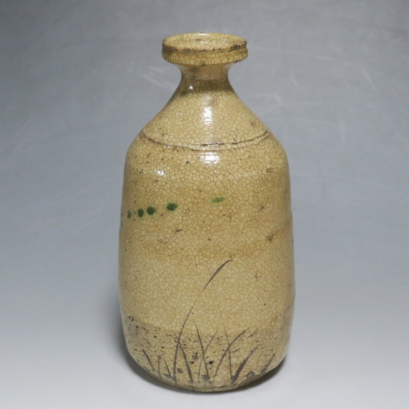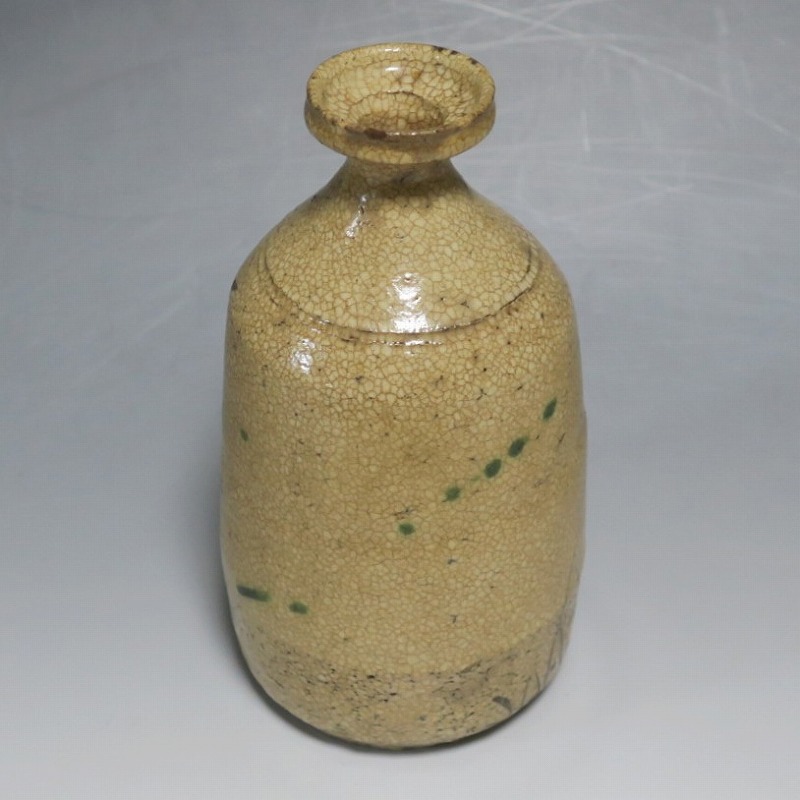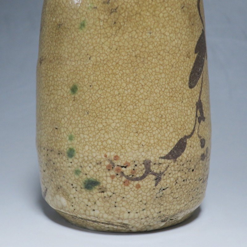 高さ 約16.2cm/胴径 約8.7cm 口辺に約5mmの小ホツ、窯傷や経年の汚れがありますが、総じて良い状態です。状態は写真でご確認ください。 織部焼は桃山時代、美濃地方で古田織部の指導によって創作された焼物です。茶人たちに珍重された緑黄釉の交趾焼(華南三彩)を手本に、和風独特の歪みを取り入れて製作されました。江戸時代前期、織部焼は一時廃れますが、18世紀後半になり再生産が始まると様々な作品が製作され人気を取り戻しました。本品は幕末期に作られた織部焼のお預け徳利。鉄絵や緑釉、紅釉を使って草花文が描かれた作品です。美濃焼なので長石釉のかいらぎが出て志野や黄瀬戸に通じる焼物になっています。民芸品のような素朴さがあります。日本酒器としてお楽しみください。 | ||