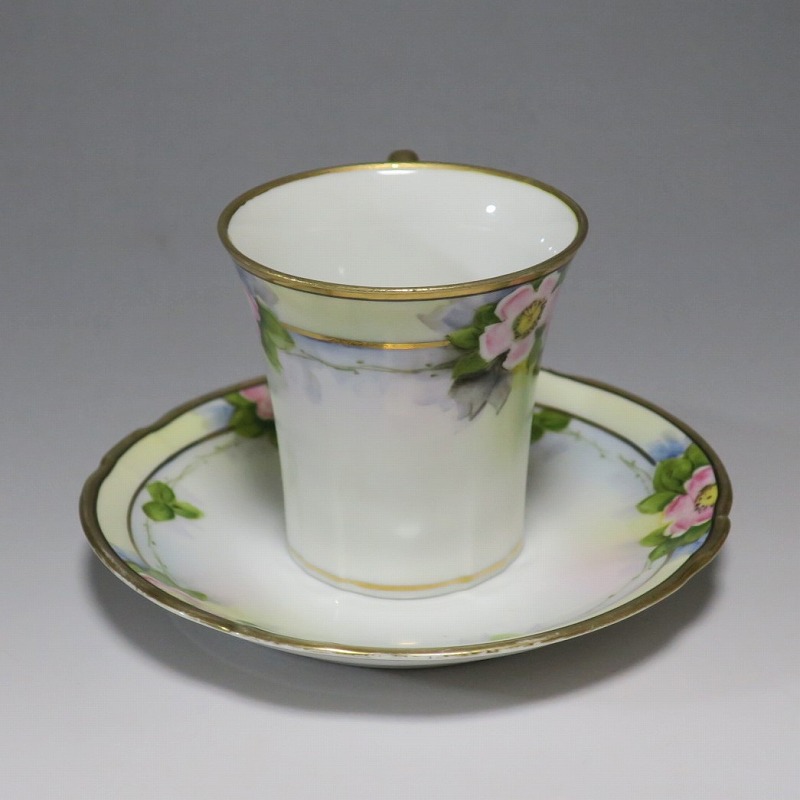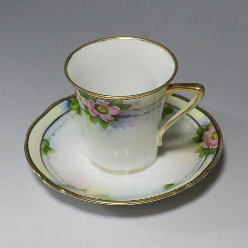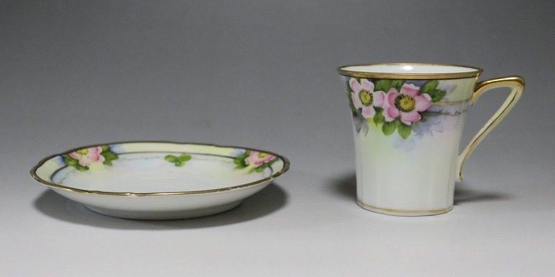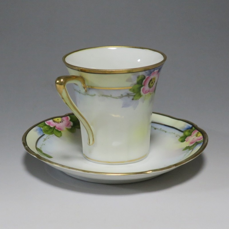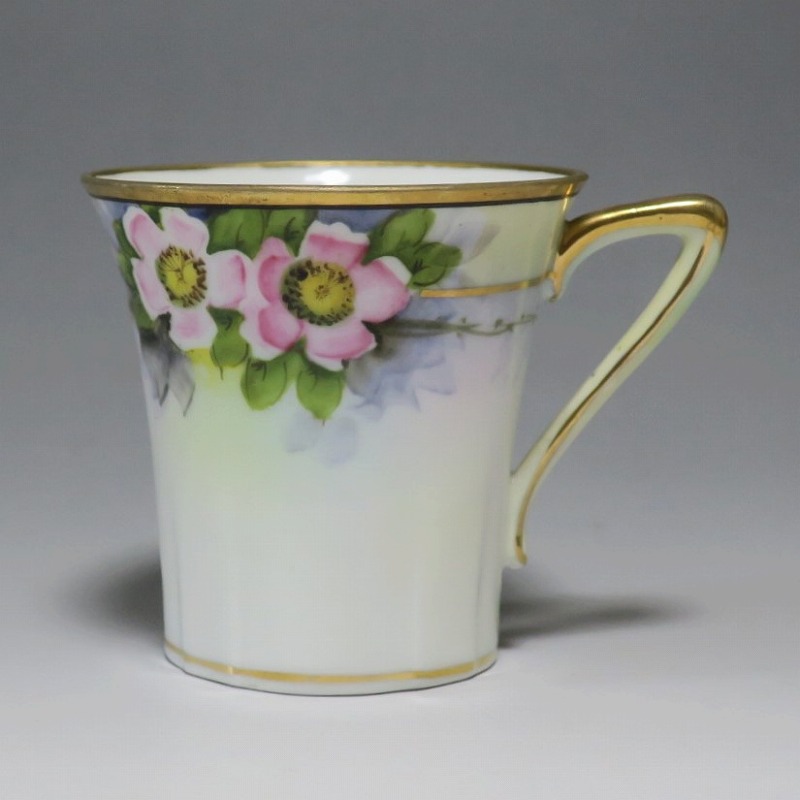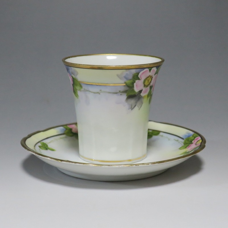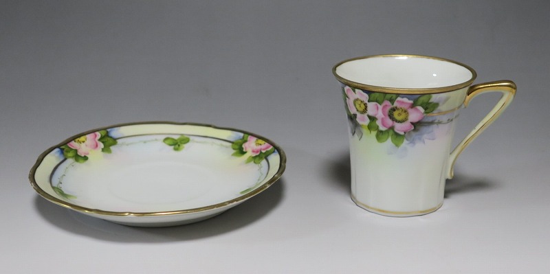 カップ 口径 約6.8cm/高さ 約6.7cm/高台径 約4.5cm 窯傷はありますが、完品です。状態は写真でご確認ください。 「オールドノリタケ」は、日本陶器合名会社(現ノリタケ・カンパニー・リミティッド)が明治時代から戦前に欧米へ輸出した陶磁器の名称です。芸術的な絵付けや繊細な細工が施された作品は現在でも人気があります。本品は胴部やソーサーの縁にばら文が描かれたカップ&ソーサー。余白を活かしたシンプルなデザインの作品です。1918年(大正7年)から使用されたバックスタンプが入っています。本品でコーヒーをお楽しみください。 | ||