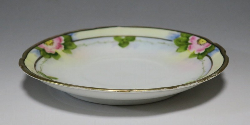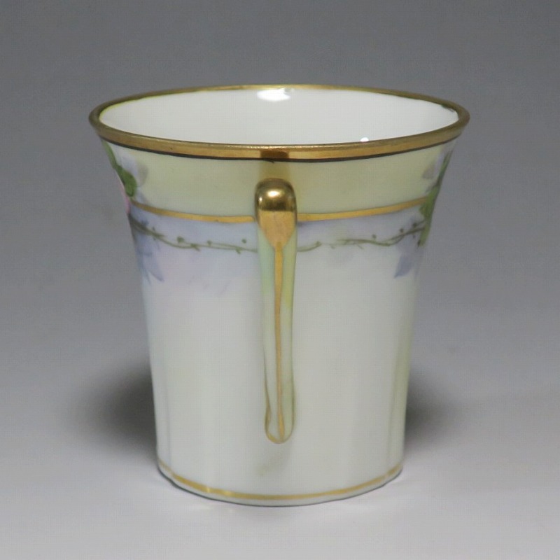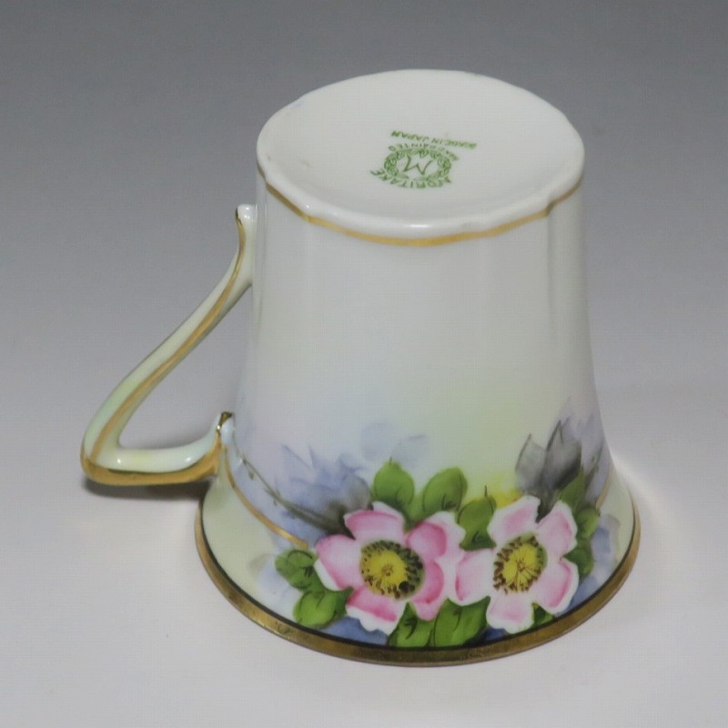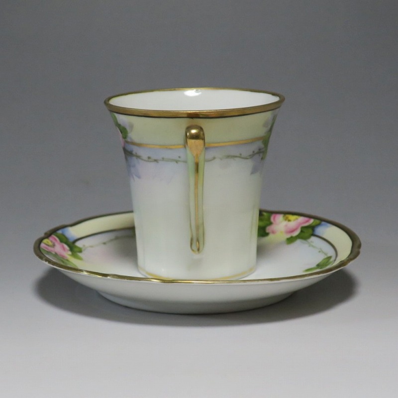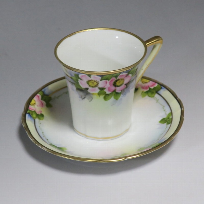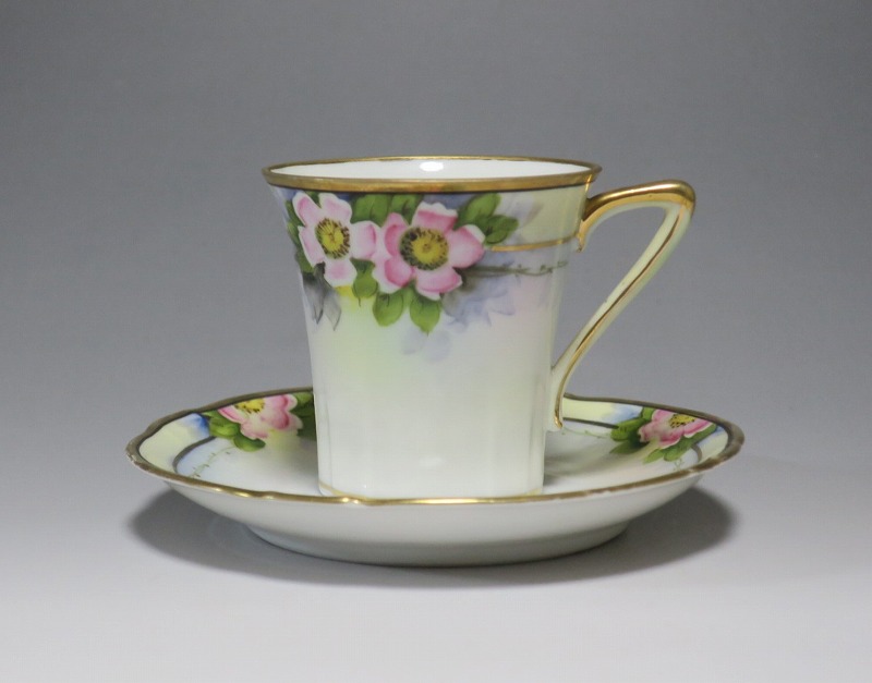 カップ 口径 約6.8cm/高さ 約6.7cm/高台径 約4.5cm 窯傷はありますが、完品です。状態は写真でご確認ください。 「オールドノリタケ」は、日本陶器合名会社(現ノリタケ・カンパニー・リミティッド)が明治時代から戦前に欧米へ輸出した陶磁器の名称です。芸術的な絵付けや繊細な細工が施された作品は現在でも人気があります。本品は胴部やソーサーの縁にばら文が描かれたカップ&ソーサー。余白を活かしたシンプルなデザインの作品です。1918年(大正7年)から使用されたバックスタンプが入っています。本品でコーヒーをお楽しみください。 | ||