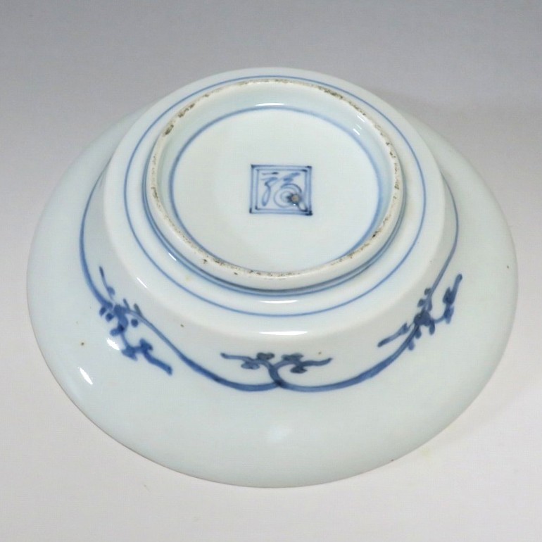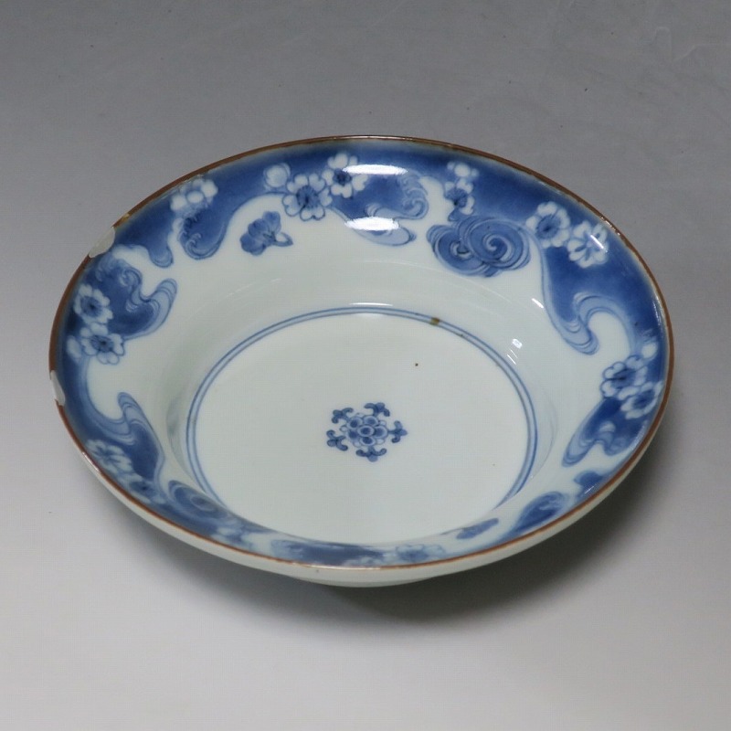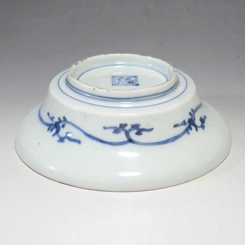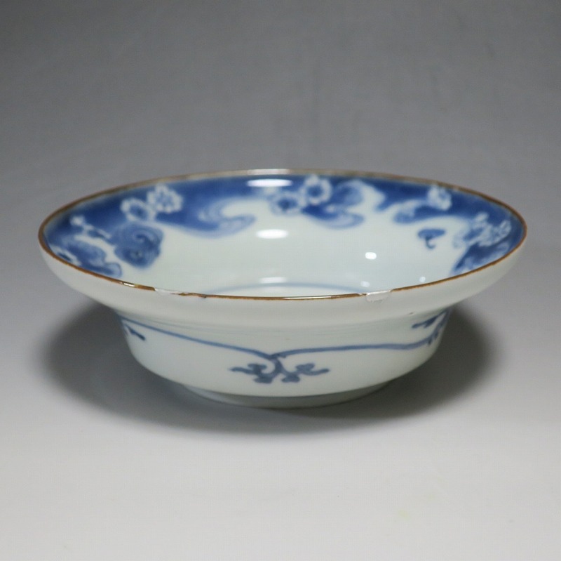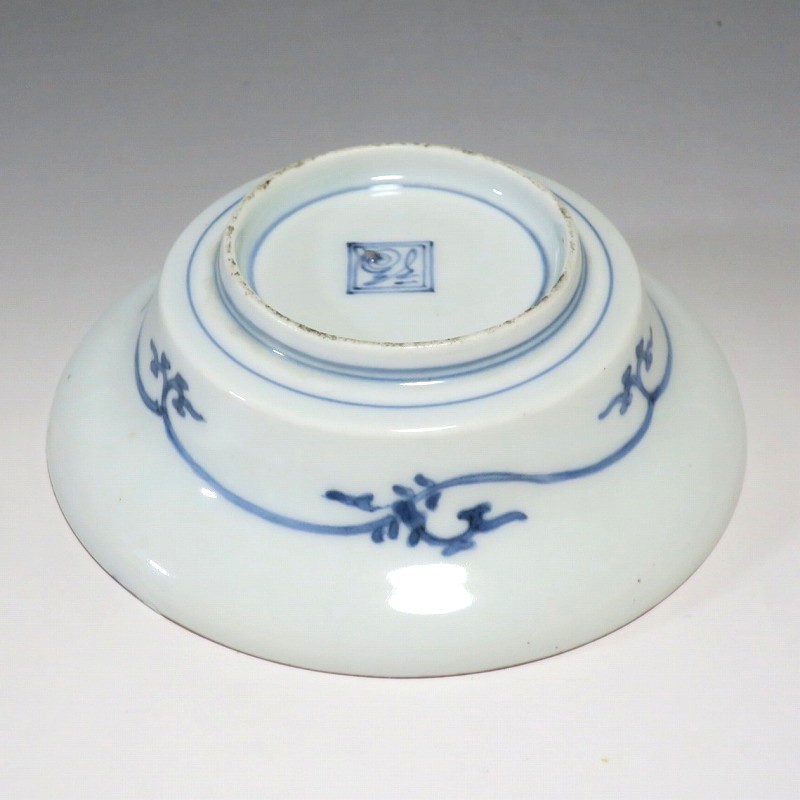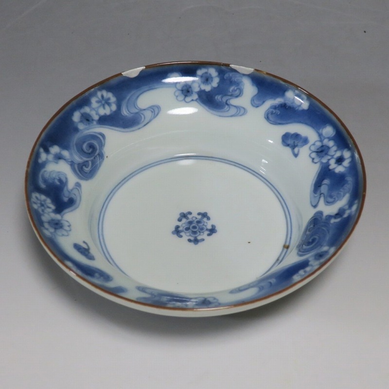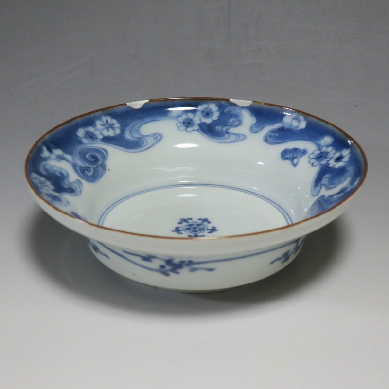 (江戸時代前期 延宝 17世紀後半) 商品番号 4238 口径 約15cm/高さ 約5cm/高台径 約7cm 口辺に約1.2cmの銀直しが2カ所あります。状態は写真でご確認ください。 元禄時代まで伊万里焼は公家や上級武士の贈答品として扱われた高級品でした。当時、最高峰の技術者たちが最高の材料を使って作品を製作、現在でもその時代の伊万里焼の美しさは人々を魅了しています。本品は染付で桜と流水文を描いた向付。上品な感じがする作品です。銀直しがありますが美しい作品です。本品を使って和食を食べると美味しく感じられるでしょう。 | ||