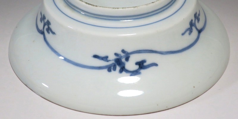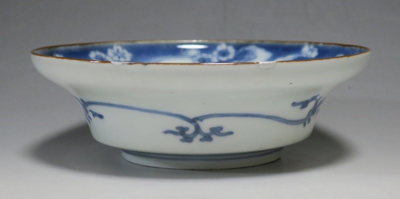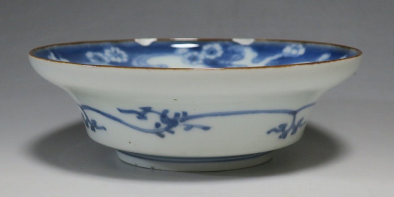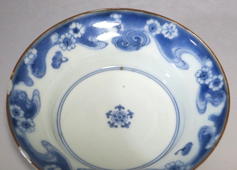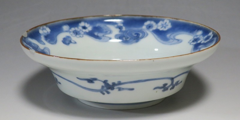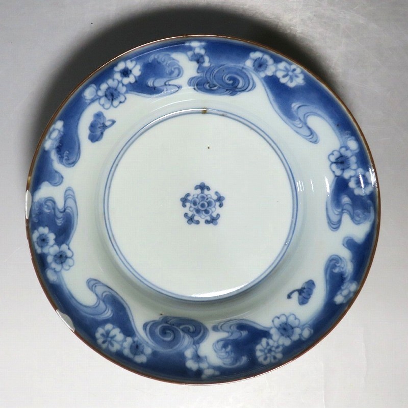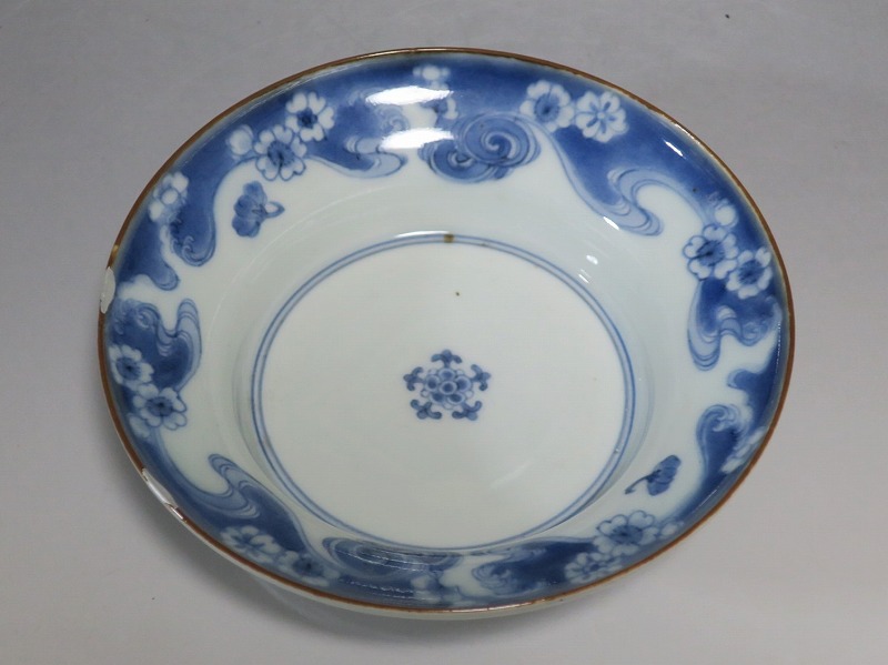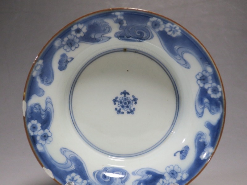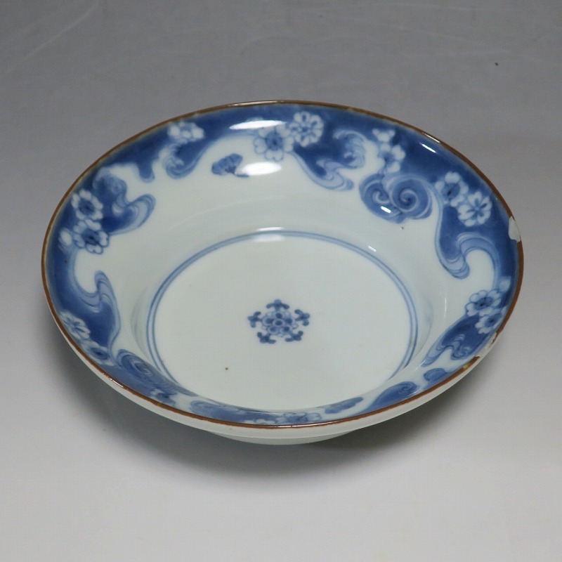 (江戸時代前期 延宝 17世紀後半) 商品番号 4238 口径 約15cm/高さ 約5cm/高台径 約7cm 口辺に約1.2cmの銀直しが2カ所あります。状態は写真でご確認ください。 元禄時代まで伊万里焼は公家や上級武士の贈答品として扱われた高級品でした。当時、最高峰の技術者たちが最高の材料を使って作品を製作、現在でもその時代の伊万里焼の美しさは人々を魅了しています。本品は染付で桜と流水文を描いた向付。上品な感じがする作品です。銀直しがありますが美しい作品です。本品を使って和食を食べると美味しく感じられるでしょう。 | ||
