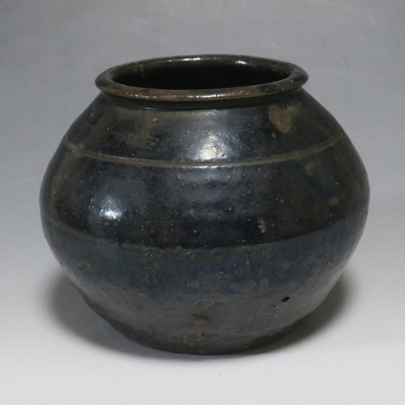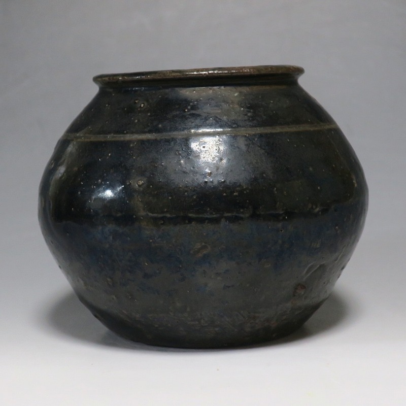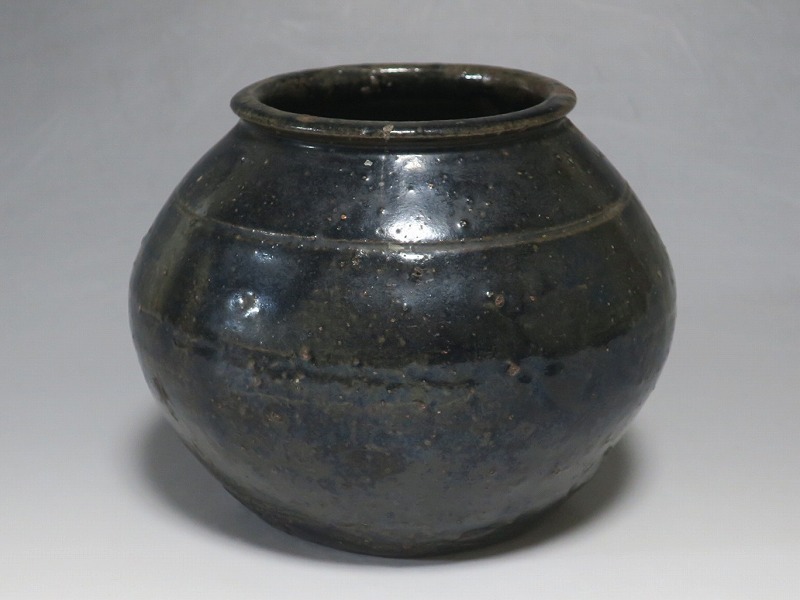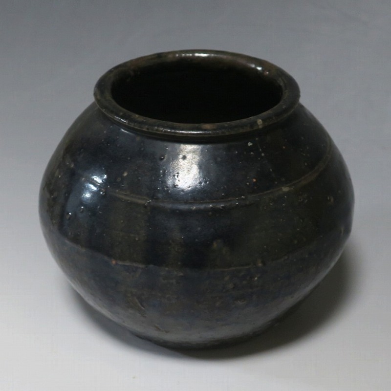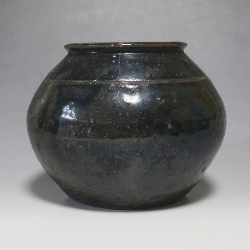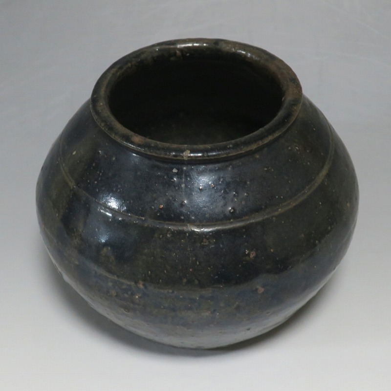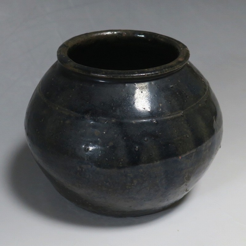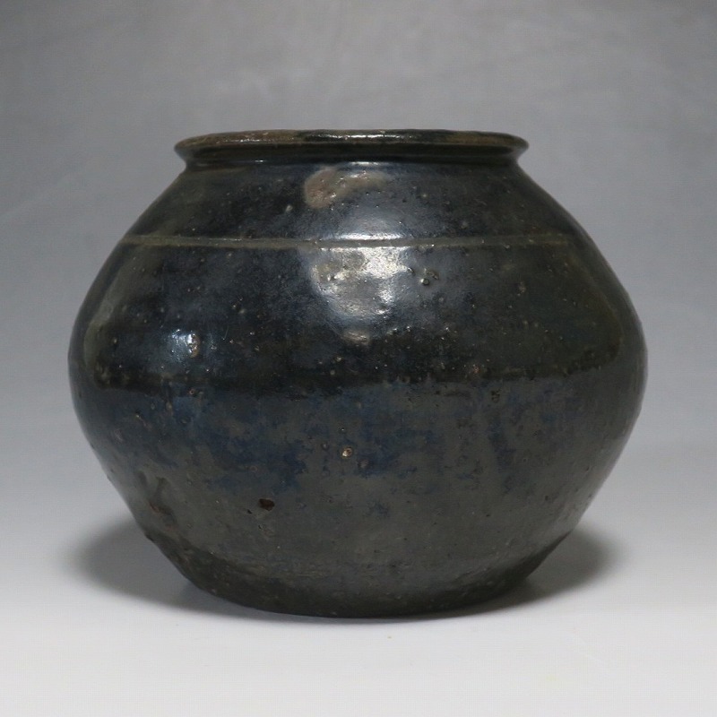 高さ 約11.3cm/胴径 約14cm 口辺から約4cmと6cmのニュウがありますので、花を生ける際はオトシをご利用ください。写真でご確認ください。 李朝時代後期になると朝鮮半島では鉄釉や飴釉作品が作られるようになります。大小の面取り壺や丸壺は主に生活雑器として使用されました。本品は鉄釉の丸壺。白磁に比べると鉄釉の丸壺は数が少ない作品です。釉薬が河南天目に似ているので朝鮮半島北部、中国との国境付近で作られた作品と想像できます。美しい形をした丸壺です。色のある花を活けると映えるでしょう。 | ||