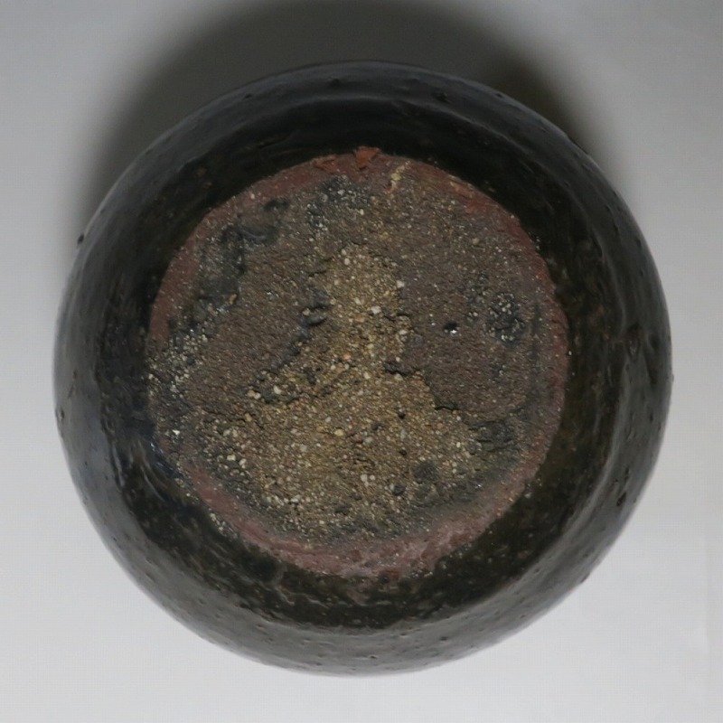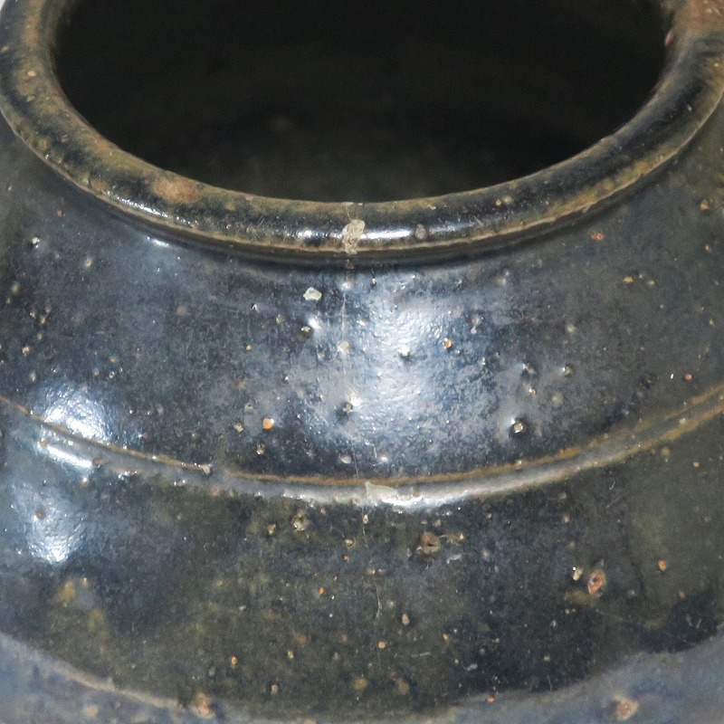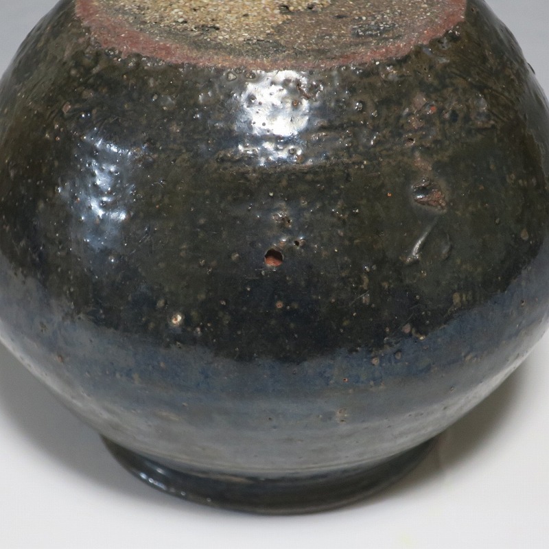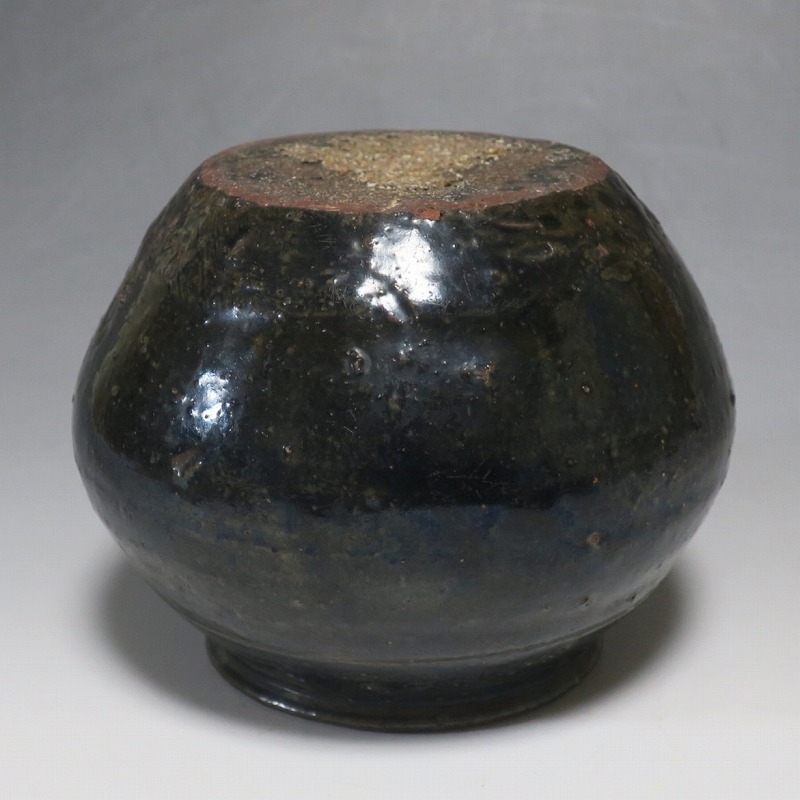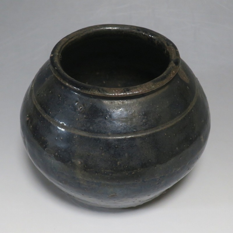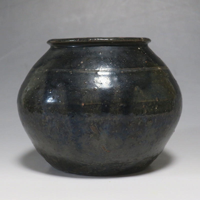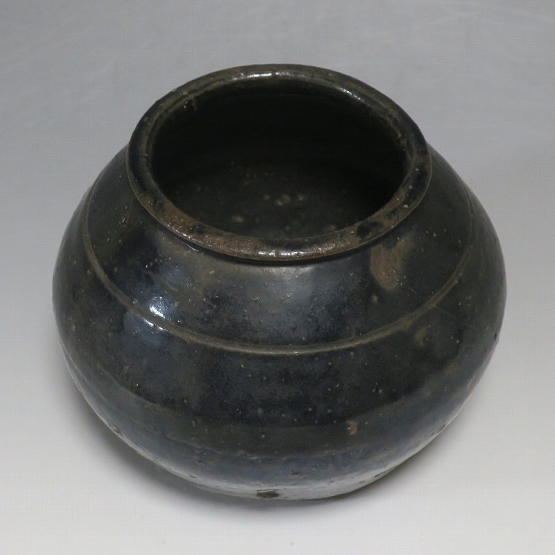 高さ 約11.3cm/胴径 約14cm 口辺から約4cmと6cmのニュウがありますので、花を生ける際はオトシをご利用ください。写真でご確認ください。 李朝時代後期になると朝鮮半島では鉄釉や飴釉作品が作られるようになります。大小の面取り壺や丸壺は主に生活雑器として使用されました。本品は鉄釉の丸壺。白磁に比べると鉄釉の丸壺は数が少ない作品です。釉薬が河南天目に似ているので朝鮮半島北部、中国との国境付近で作られた作品と想像できます。美しい形をした丸壺です。色のある花を活けると映えるでしょう。 | ||