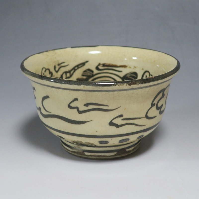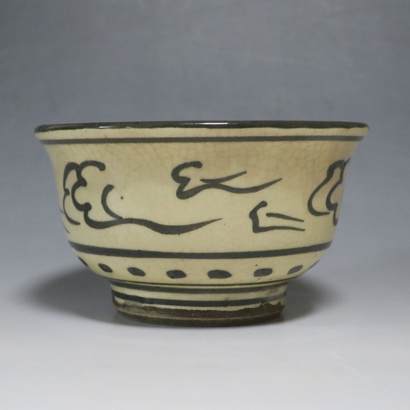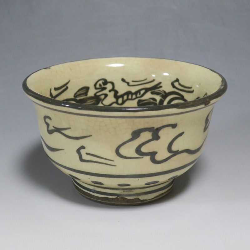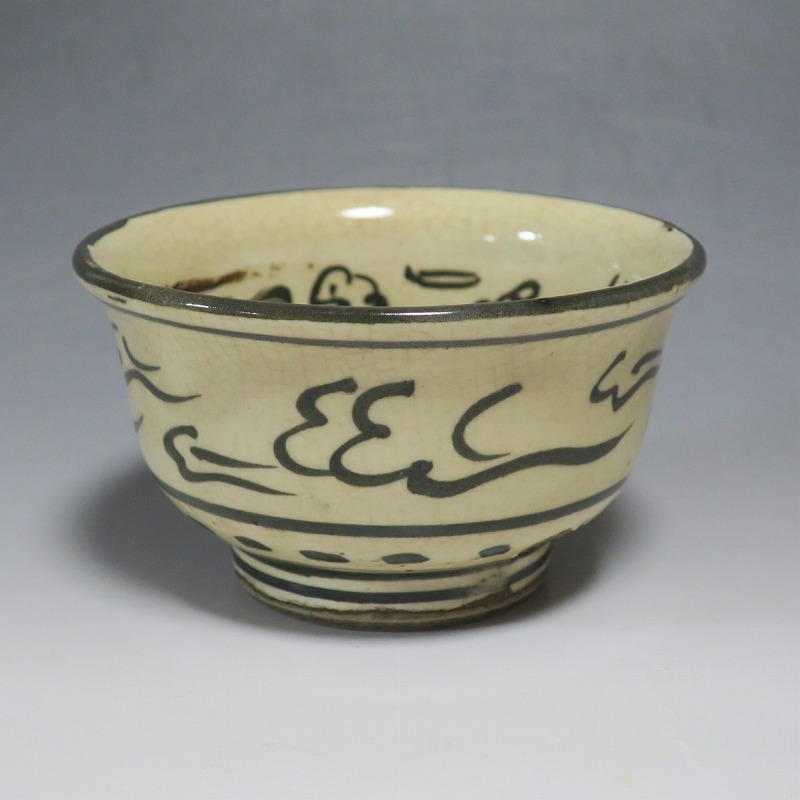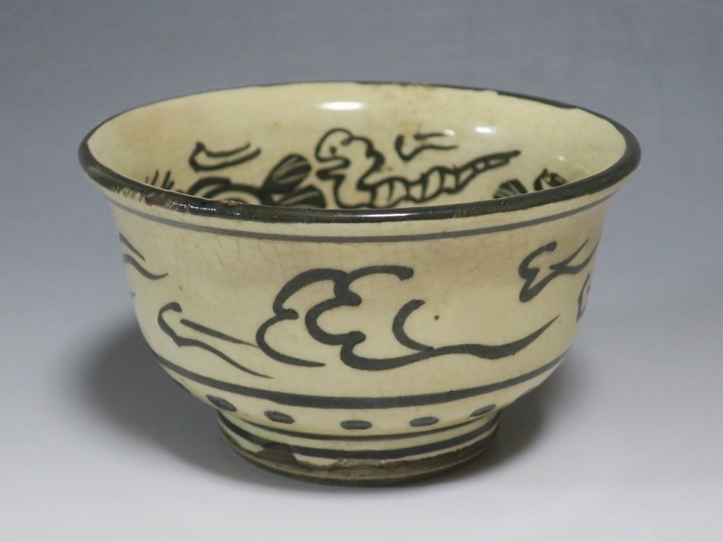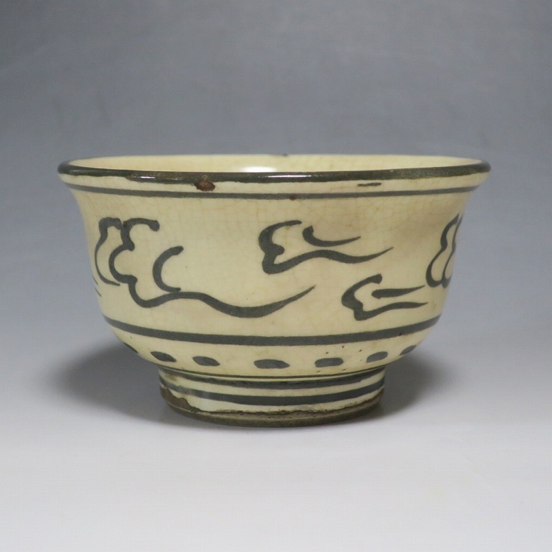 口径 約12cm/高さ 約6.8cm/高台径 約6cm 経年のシミや口辺に釉ハゲが複数ありますが、総じて良い状態です。状態は写真でご確認ください。 上神焼(かずわやき)は、江戸時代後期に鳥取県倉吉市周辺で作られた陶器の総称です。弘化年間(1844年〜1848年)に京都から招いた陶工が茶陶器の製作を始めた窯です。本品は幕末期に作られた鉄絵渦巻文茶碗。中国の磁州窯作品を模倣した作品で、かわいらしい龍の絵が描かれています。19世紀中頃に使用された伯尾山印があるカジュアルな茶碗。本品を見ると倉吉藩の文化レベルの高さに触れることができるでしょう。普段使いの茶碗としてお楽しみください。 | ||