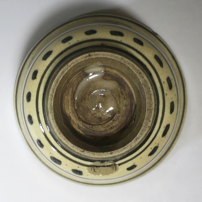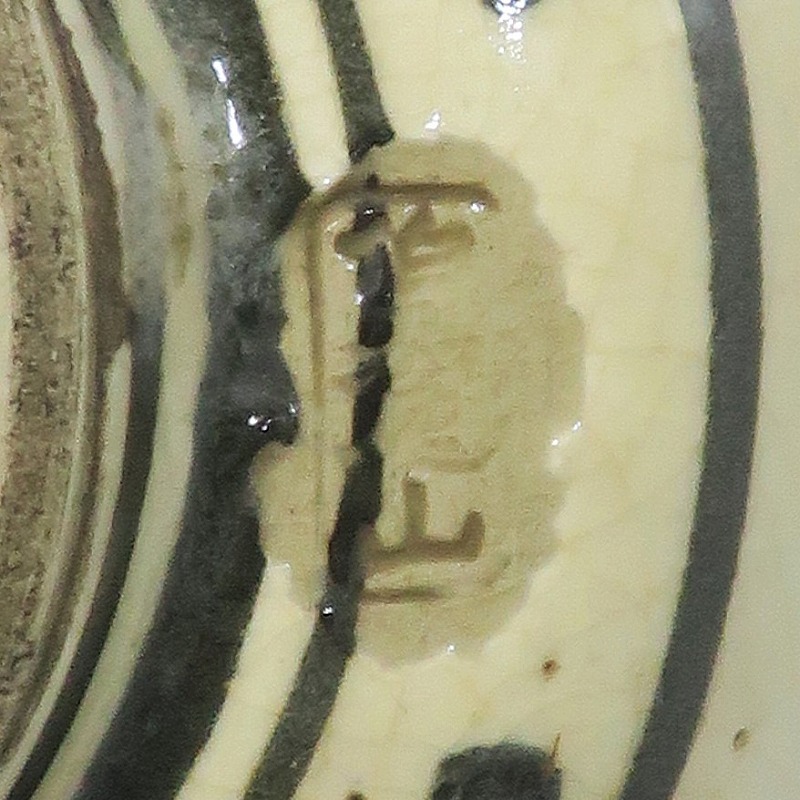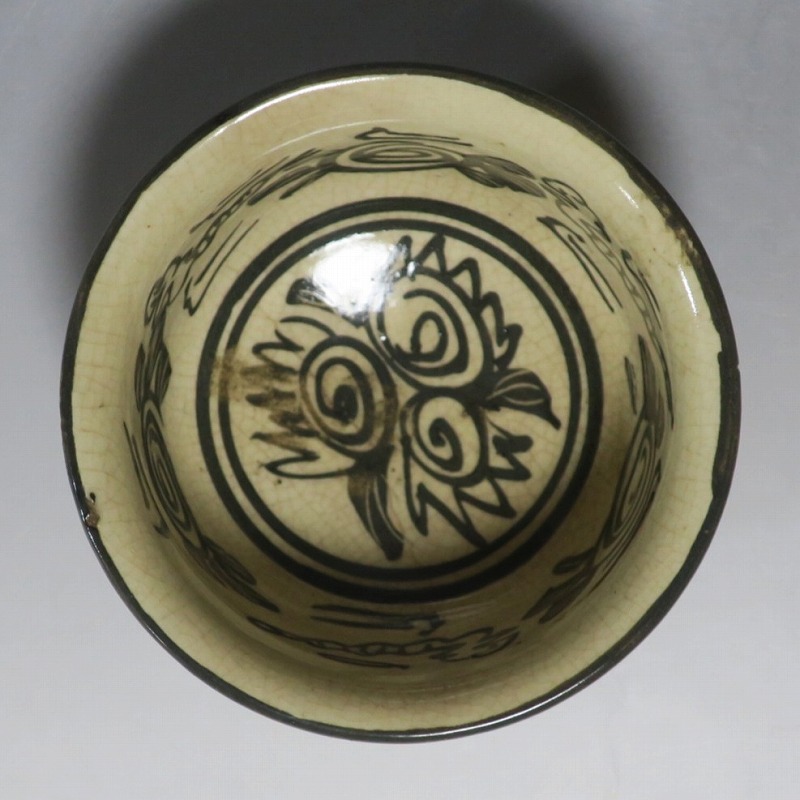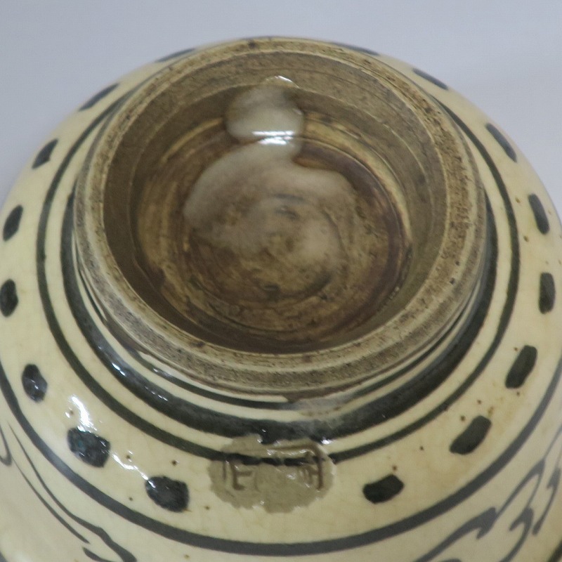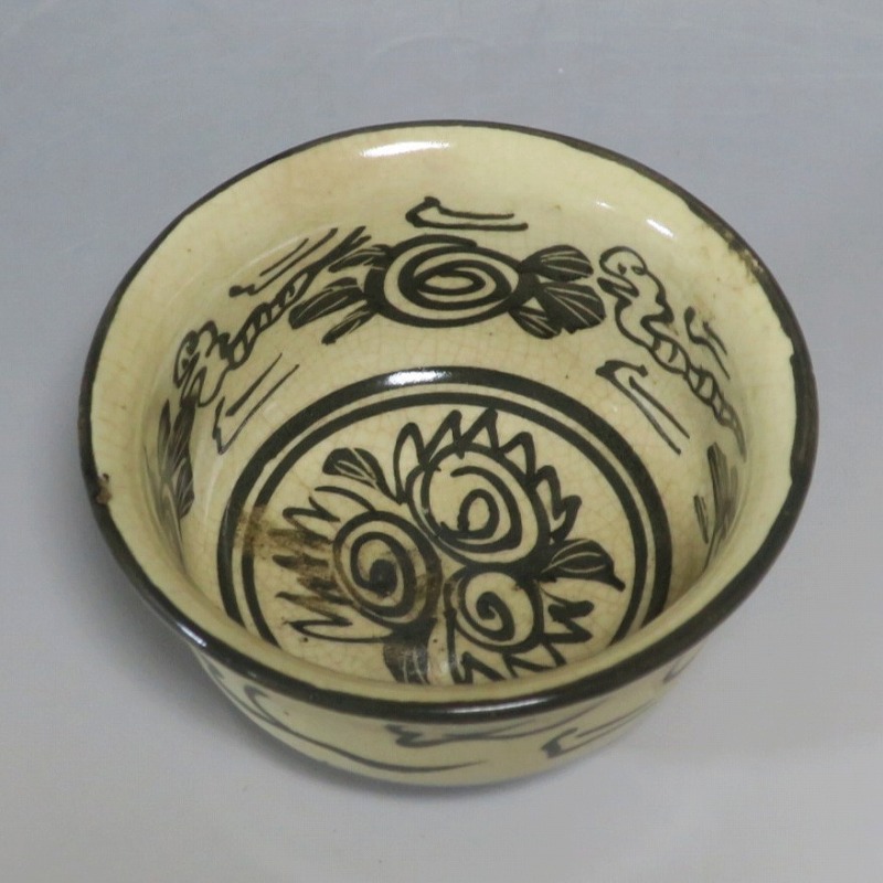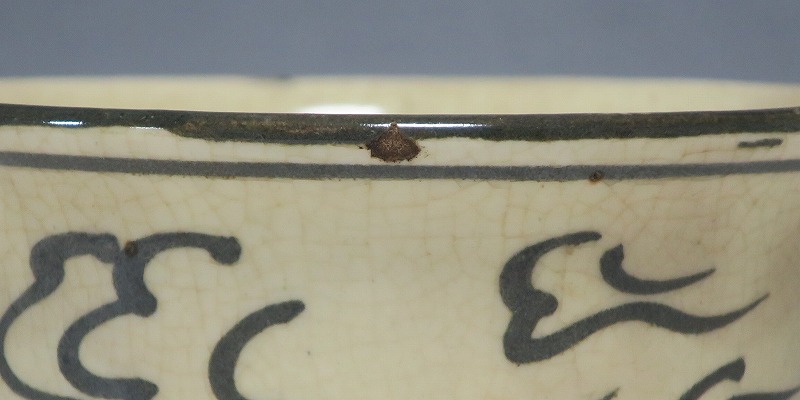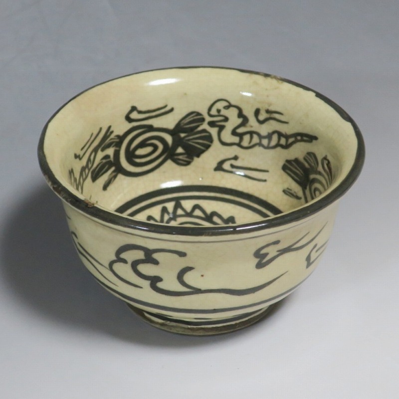 口径 約12cm/高さ 約6.8cm/高台径 約6cm 経年のシミや口辺に釉ハゲが複数ありますが、総じて良い状態です。状態は写真でご確認ください。 上神焼(かずわやき)は、江戸時代後期に鳥取県倉吉市周辺で作られた陶器の総称です。弘化年間(1844年〜1848年)に京都から招いた陶工が茶陶器の製作を始めた窯です。本品は幕末期に作られた鉄絵渦巻文茶碗。中国の磁州窯作品を模倣した作品で、かわいらしい龍の絵が描かれています。19世紀中頃に使用された伯尾山印があるカジュアルな茶碗。本品を見ると倉吉藩の文化レベルの高さに触れることができるでしょう。普段使いの茶碗としてお楽しみください。 | ||