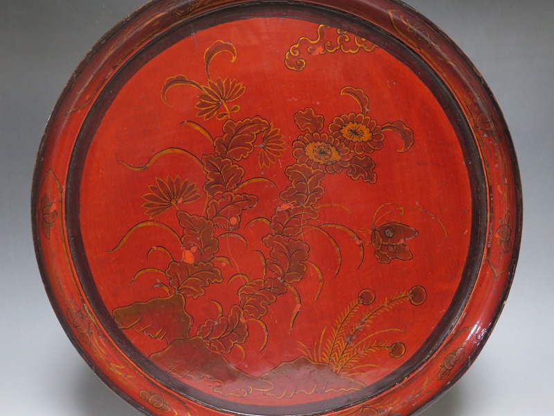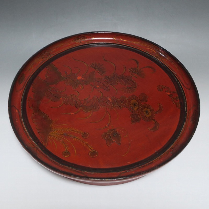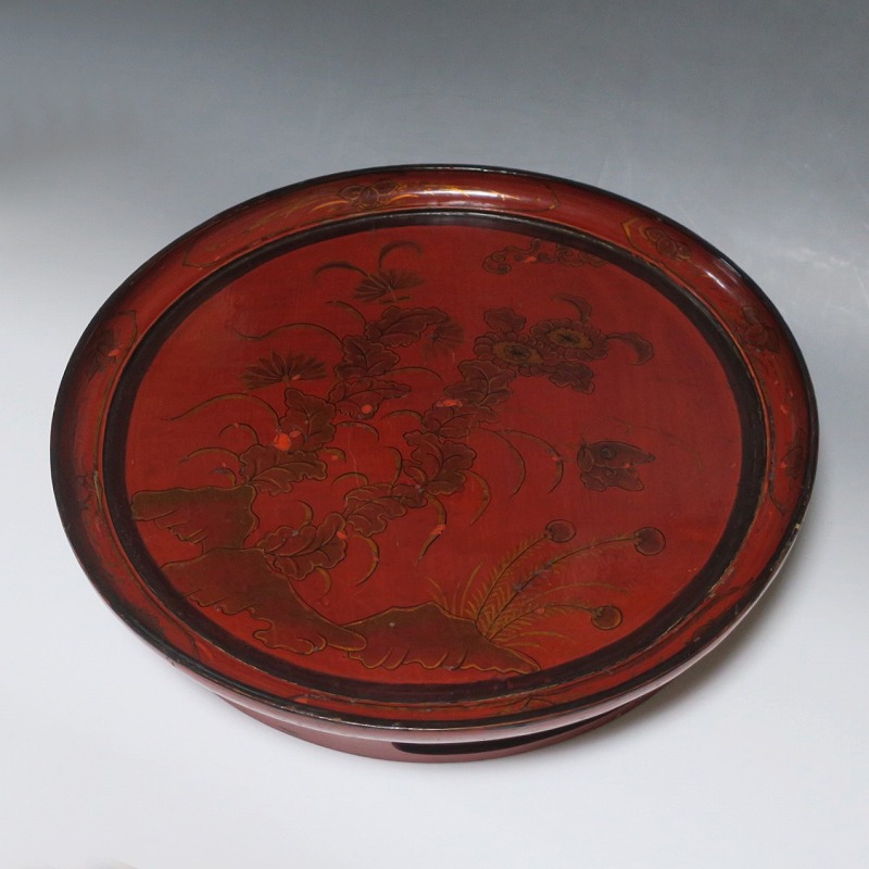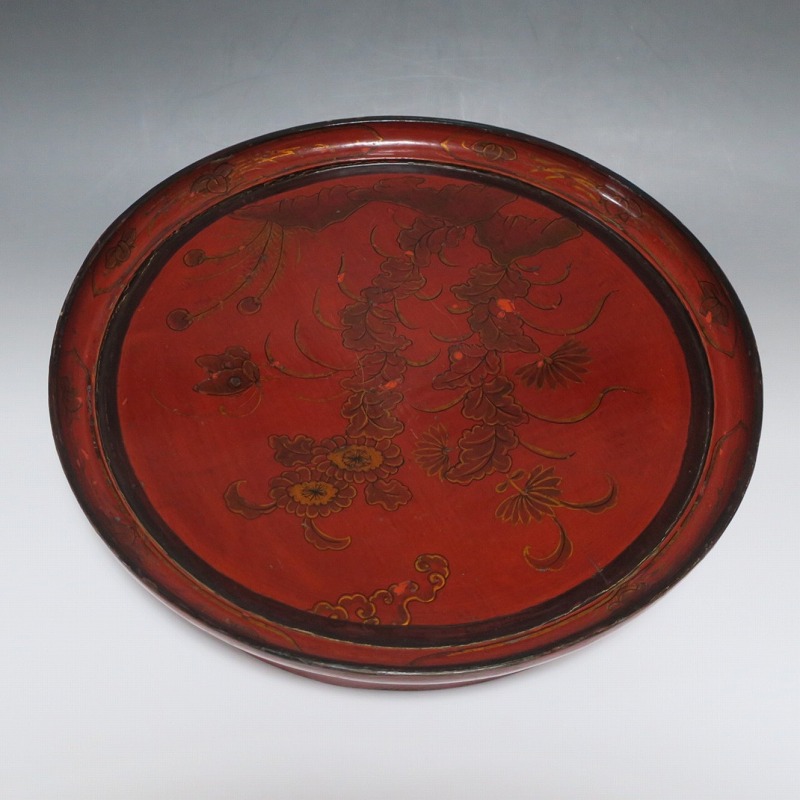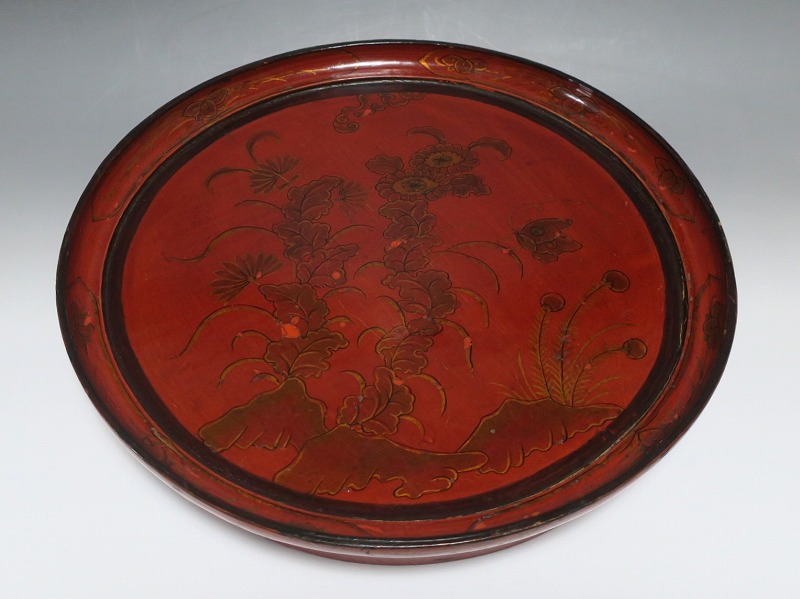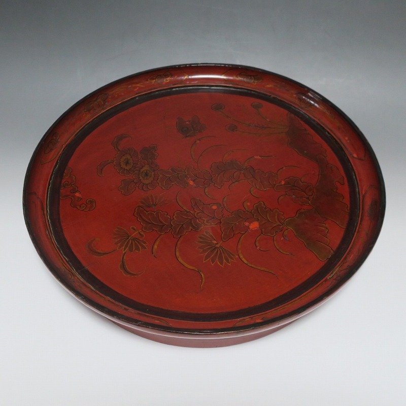 口径 約38.5cm/高さ 約6.8cm 経年による傷みや直しがあります。状態は写真でご確認ください。 漆器は古代からアジア全体に広まっている工芸です。日本では9000年前、中国では7400年前の漆器が遺跡から出土しており、古代人が漆工芸を重んじていたことがわかります。本品は18世紀、清で製作された朱漆の花文高台付き盆。かわいらしい花と蝶が描かれた華やかな感じの作品です。世界各地の民芸館に展示されるクラスの味わい深い漆器。飾り台や食器をのせる盆としてお楽しみください。 | ||